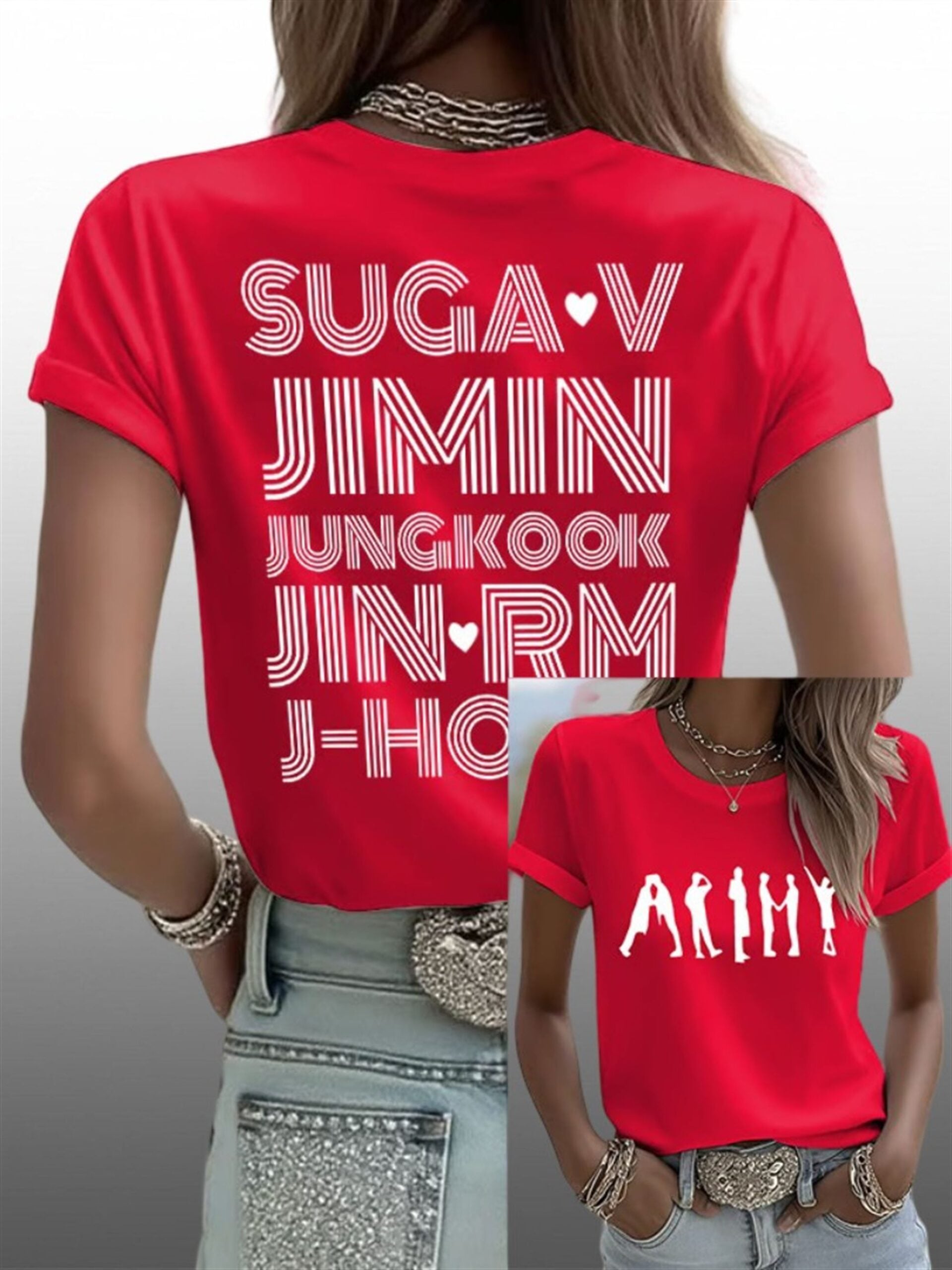Celebrate the global K-Pop phenomenon with a garment that screams dedication. This striking red statement piece features a dual-sided design that honors every single member of the world’s biggest boy band.
