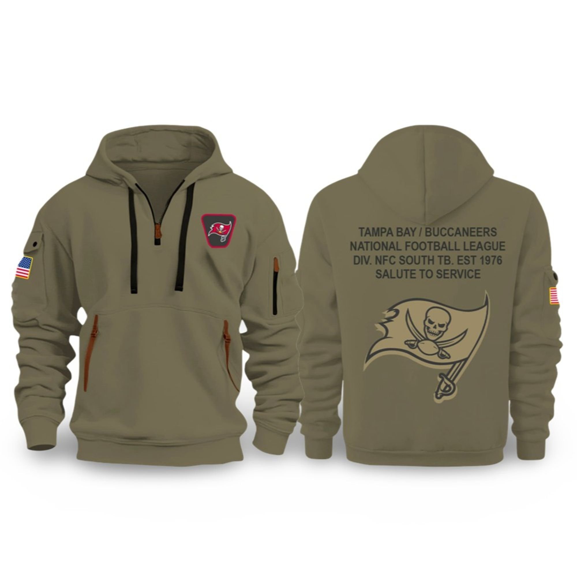 This year’s design moves beyond the standard pullover, offering a rugged, tactical-inspired aesthetic that’s both functional and stylish. Crafted in a deep, military-spec olive green, this quarter-zip hoodie is built to stand out. The front features a clean, bold Buccaneers logo patch on the left chest, sitting opposite a functional, zippered utility pocket on the sleeve—perfect for securing small essentials. An American flag patch is proudly displayed on the right sleeve, a core element of all Salute to Service gear.