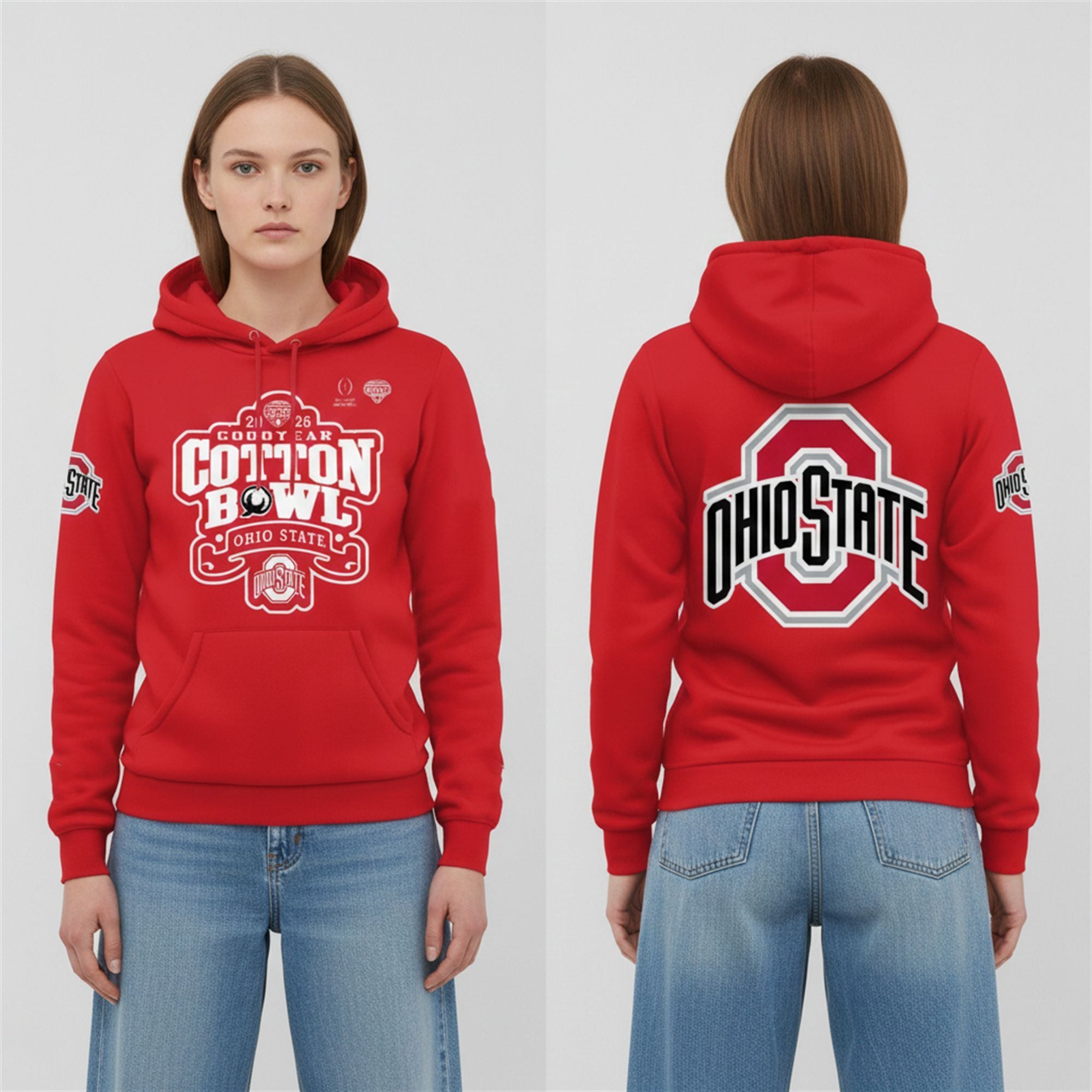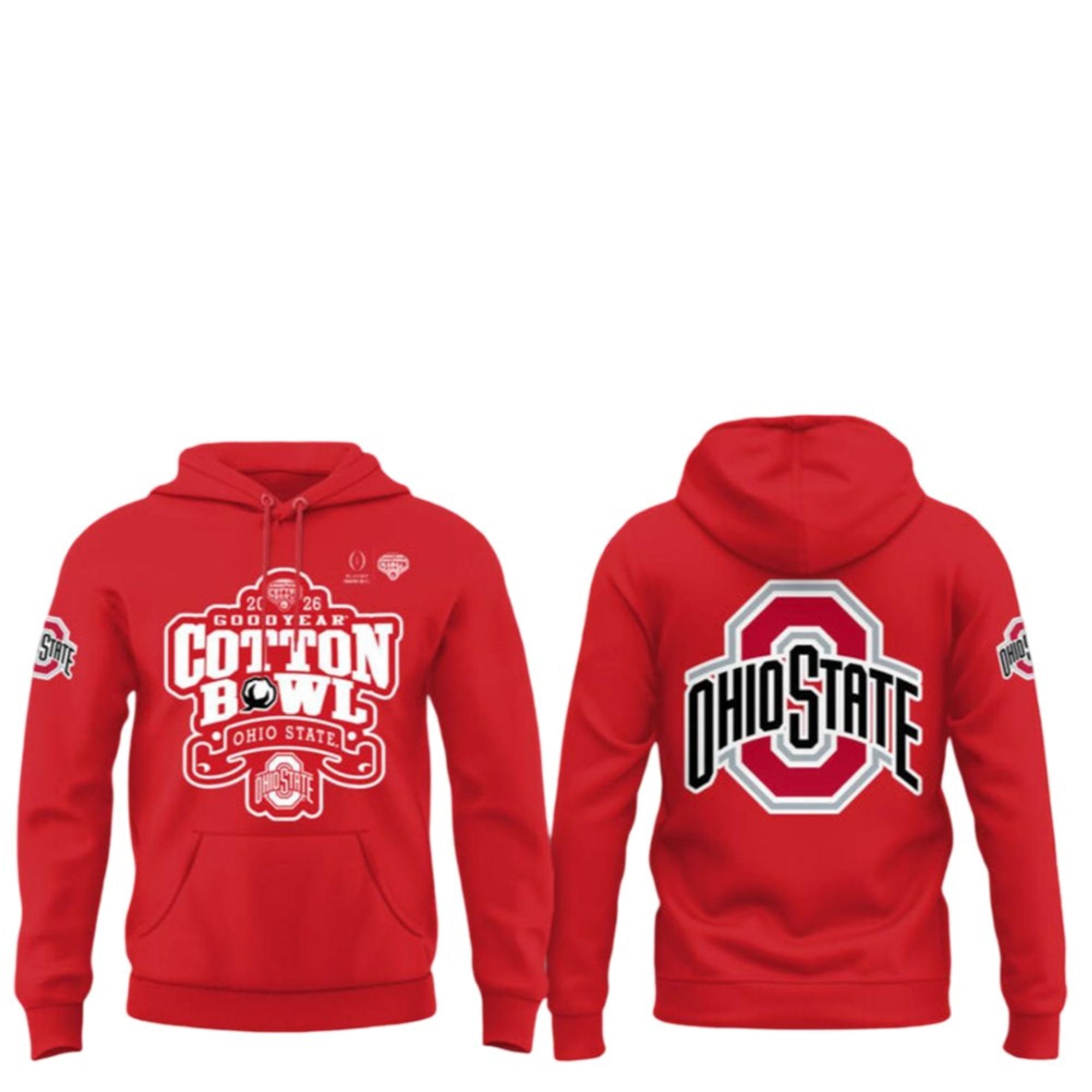 No generic fan gear here—this hoodie is specifically designed to celebrate the Buckeyes‘ triumph in the 2026 Cotton Bowl. The front chest features the Goodyear Cotton Bowl logo alongside the aggressive “Champions” typography and the unmistakable Ohio State Athletic O. It’s a visual declaration that the Buckeyes have silenced the doubters and advanced to the next round of the 12-team playoff.