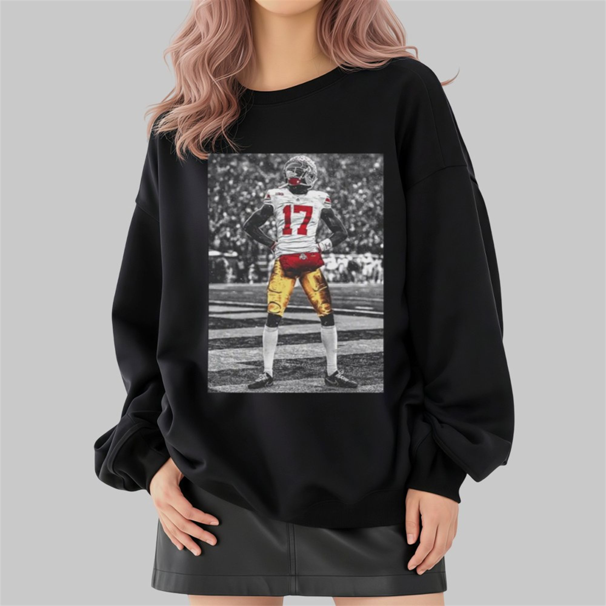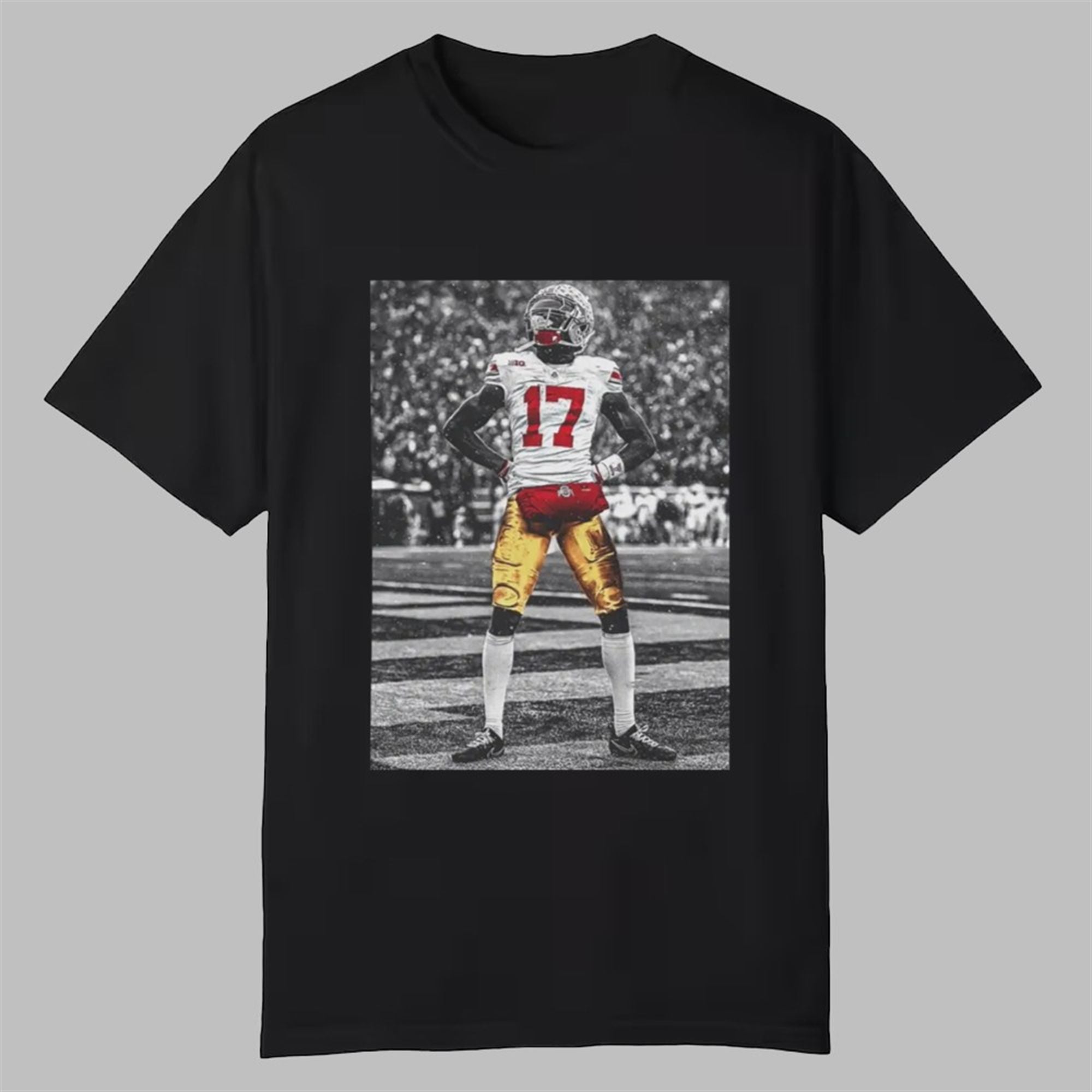 The shirt is the ultimate tribute to Ohio State’s star wide receiver, designed specifically for the fan who demands style and substance. This shirt features a striking, high-definition graphic of Carnell Tate (#17) in a stoic, hands-on-hips stance—a pose that embodies the “strictly business” mentality he displayed during the 2025 season.