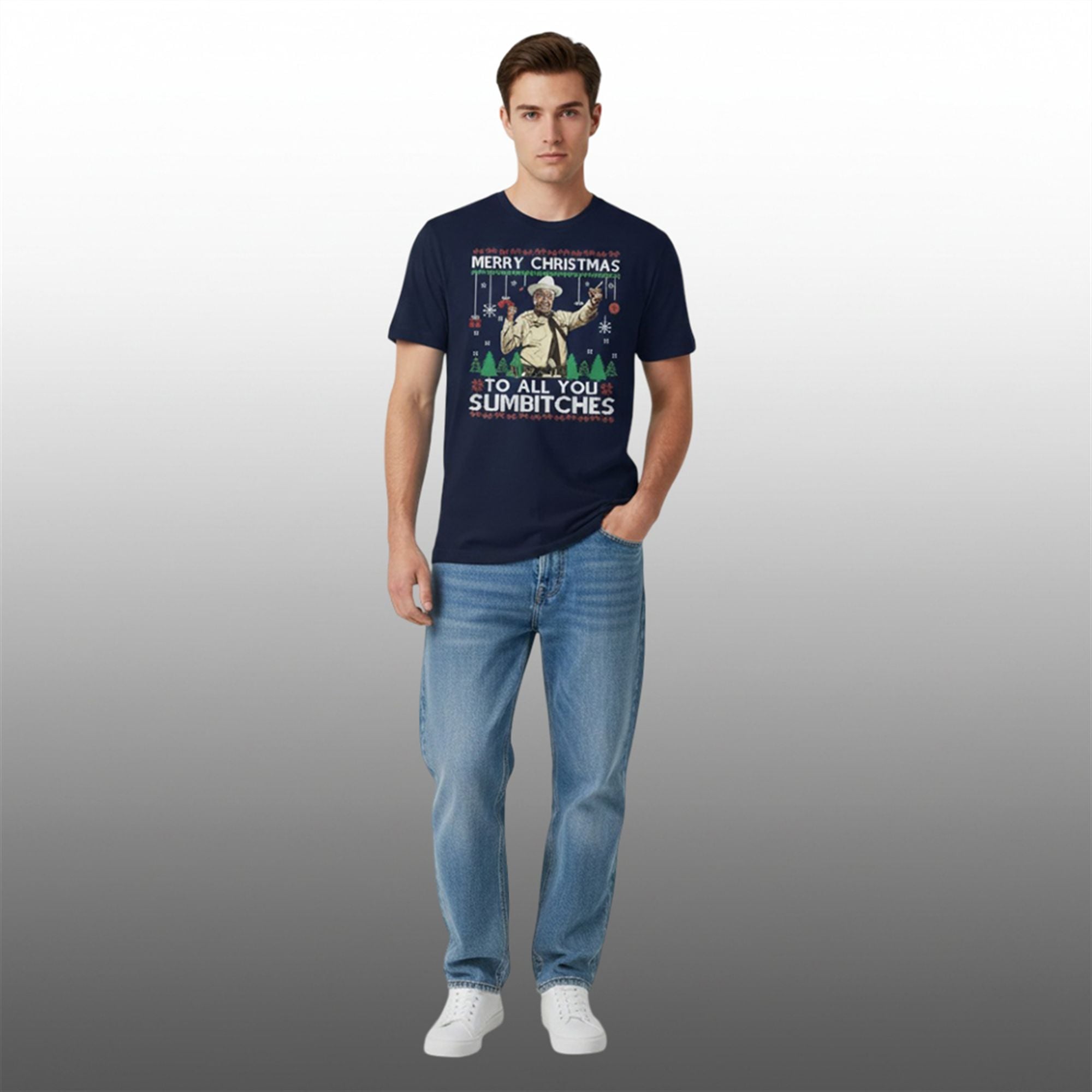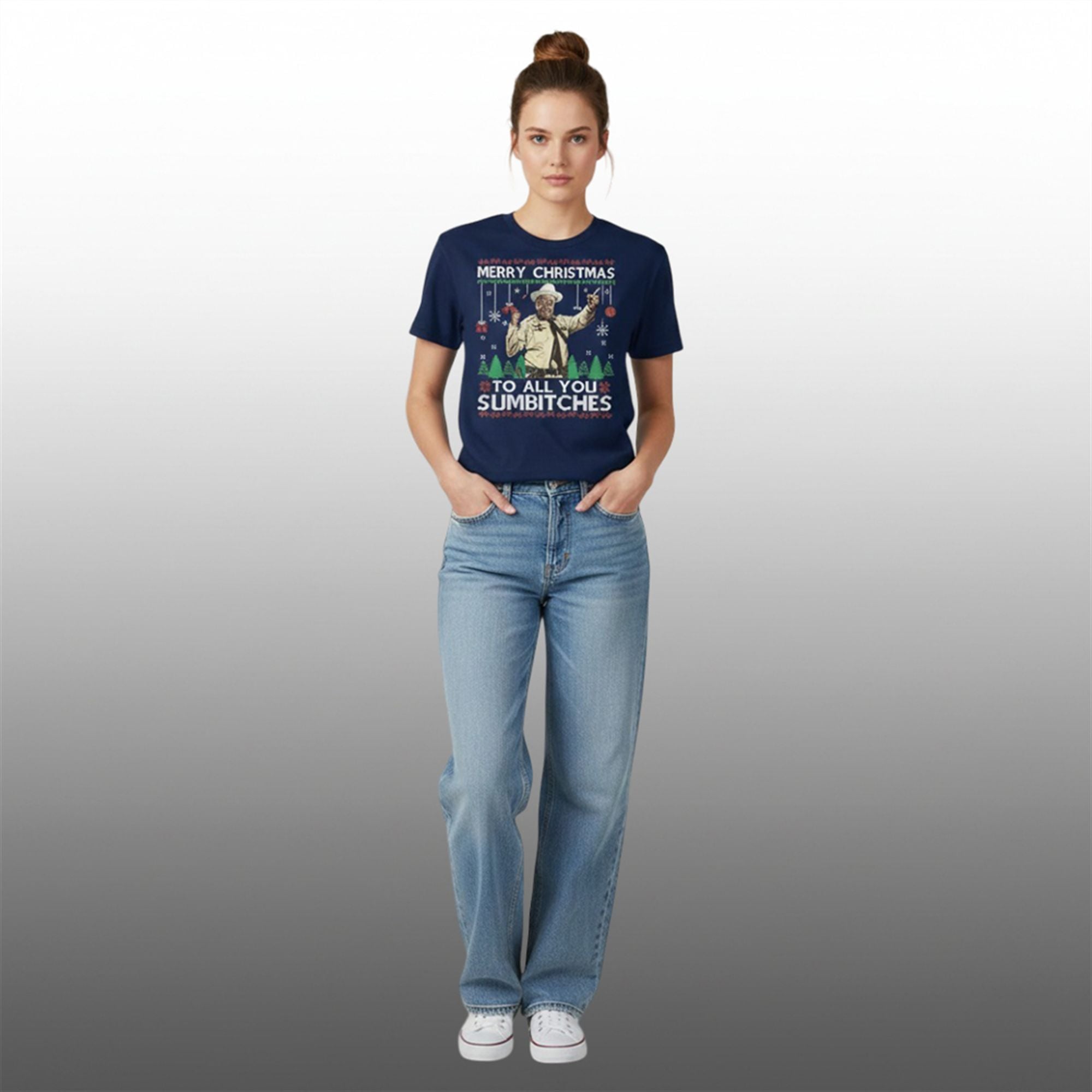 The text, “MERRY CHRISTMAS TO ALL YOU SUMBITCHES,” is emblazoned in a bold, faux-knit font, capturing the Sheriff’s distinctively gruff vocabulary in a way that is hilarious rather than hateful. Printed on a deep navy or black background, the colors pop vividly, making the design readable from across the room. It is a modern t-shirt with a vintage soul, perfectly bridging the gap between comfort and costume. Whether you are buying it as a gag gift or wearing it to dominate the local pub crawl, this shirt delivers the goods.