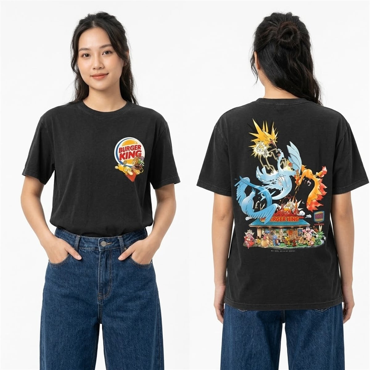 Turning the shirt around reveals its true centerpiece: a massive, highly detailed back graphic. This chaotic and vibrant illustration showcases legendary elemental birds—representing ice, lightning, and fire—alongside a massive sea guardian, all swirling above a nostalgic Burger King restaurant. The parking lot is populated with a variety of recognizable, classic pocket-monsters enjoying their fast-food breakfast. The contrast between the mundane retro architecture of the restaurant and the god-like presence of the legendary beasts creates a surreal, visually arresting aesthetic.