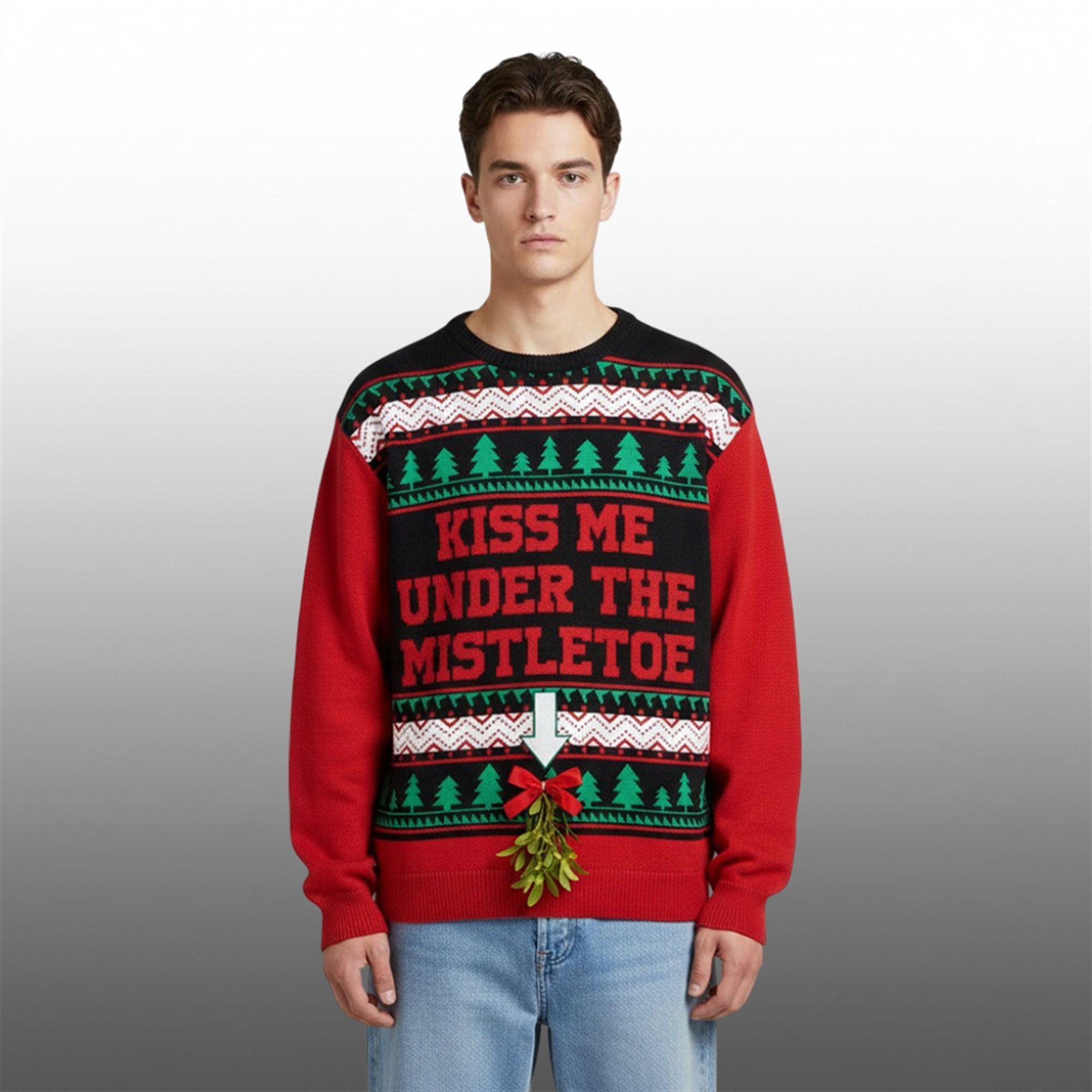 However, the centerpiece is the bold, red block text reading “KISS ME UNDER THE MISTLETOE.” Beneath the text, a large white arrow points decisively downward to the hemline, where a 3D satin red bow and realistic-looking mistletoe hang. It’s a cheeky, humorous play on holiday traditions that perfectly captures the fun, carefree spirit of modern Christmas celebrations.