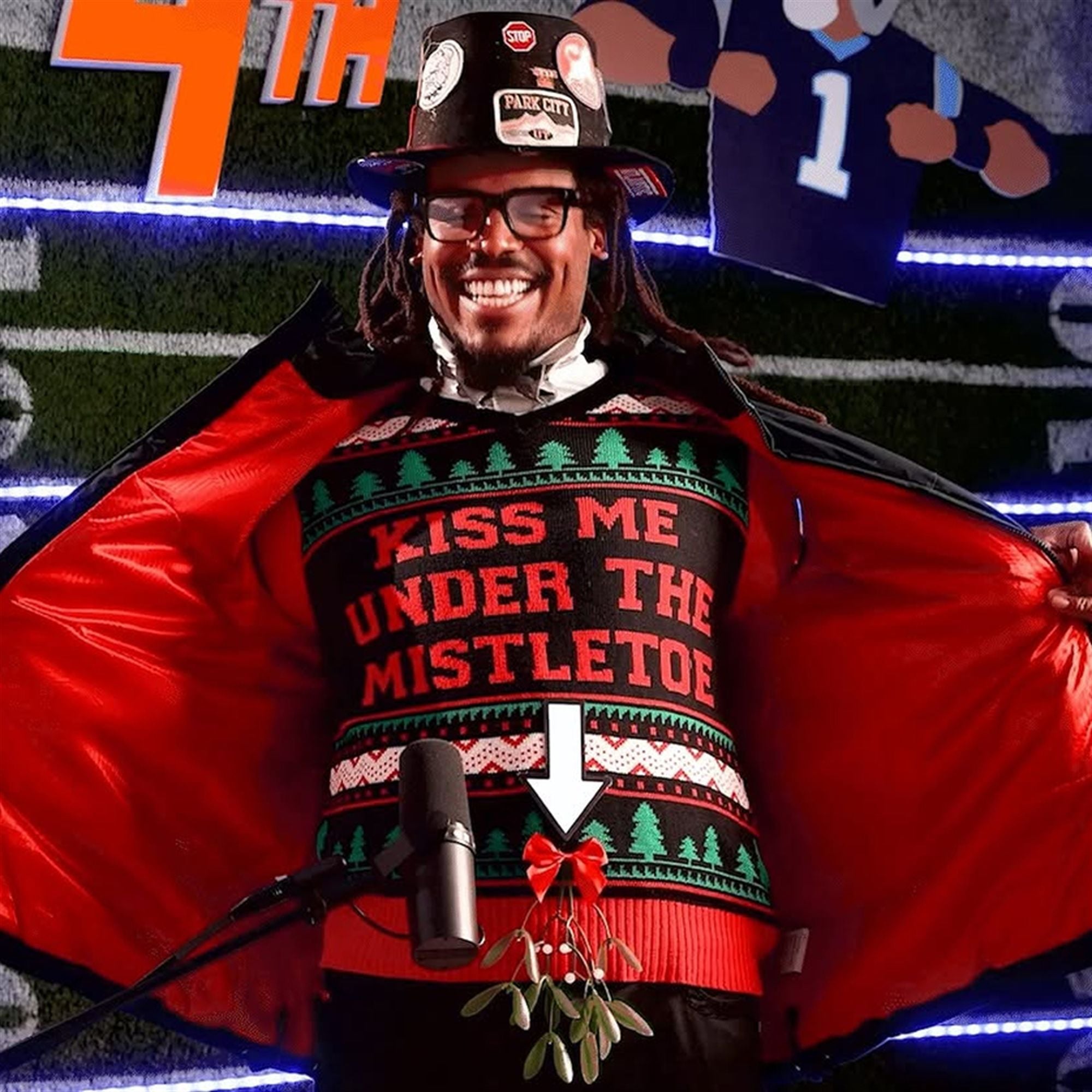 Steal the spotlight this holiday season with the viral sensation seen on icon Cam Newton! The Kiss Me Under The Mistletoe Christmas Ugly Sweater is the ultimate conversation starter. As seen on the hit 4th & 1 podcast, this hilarious, bold, and slightly naughty knit features a cheeky design that guarantees laughs at every ugly sweater party.