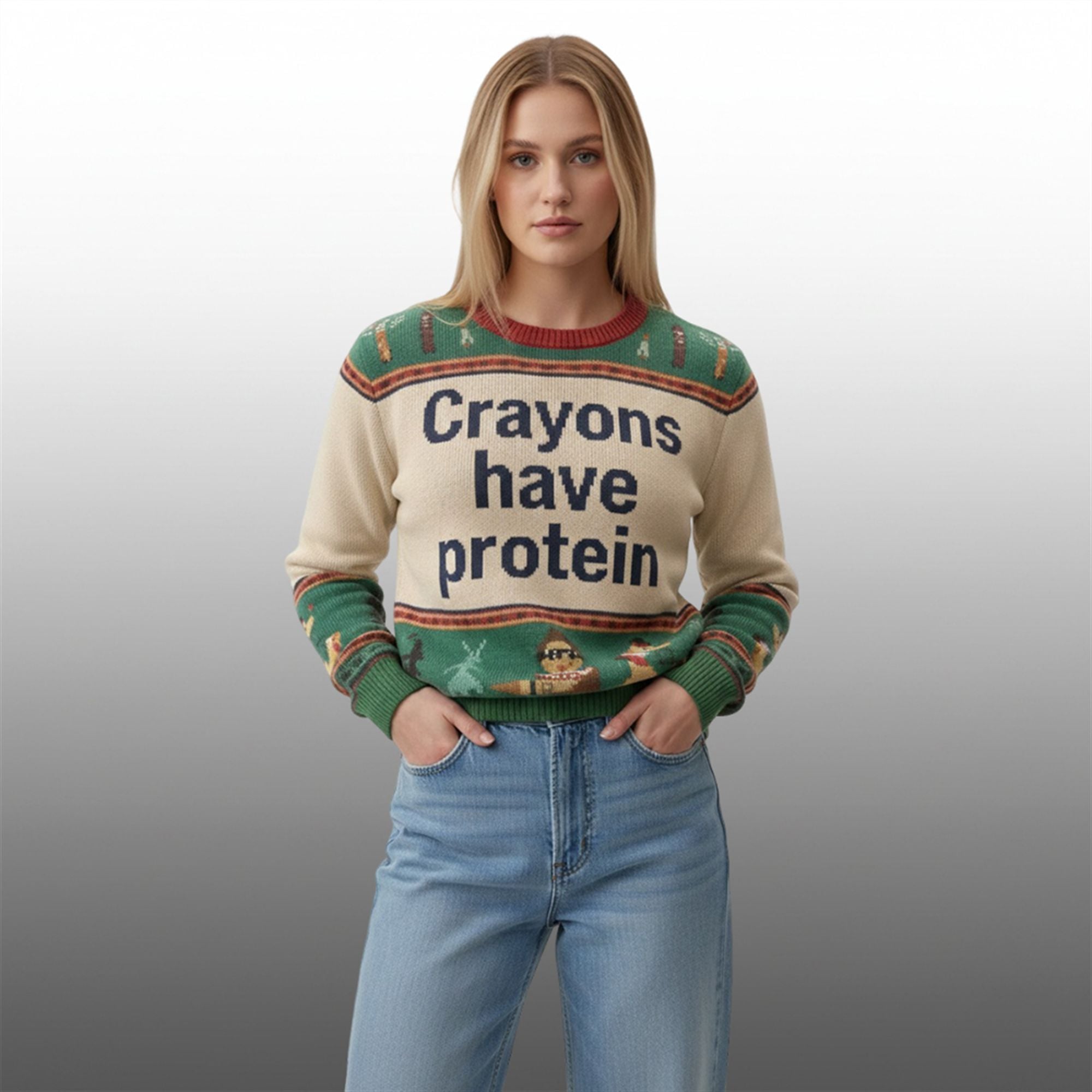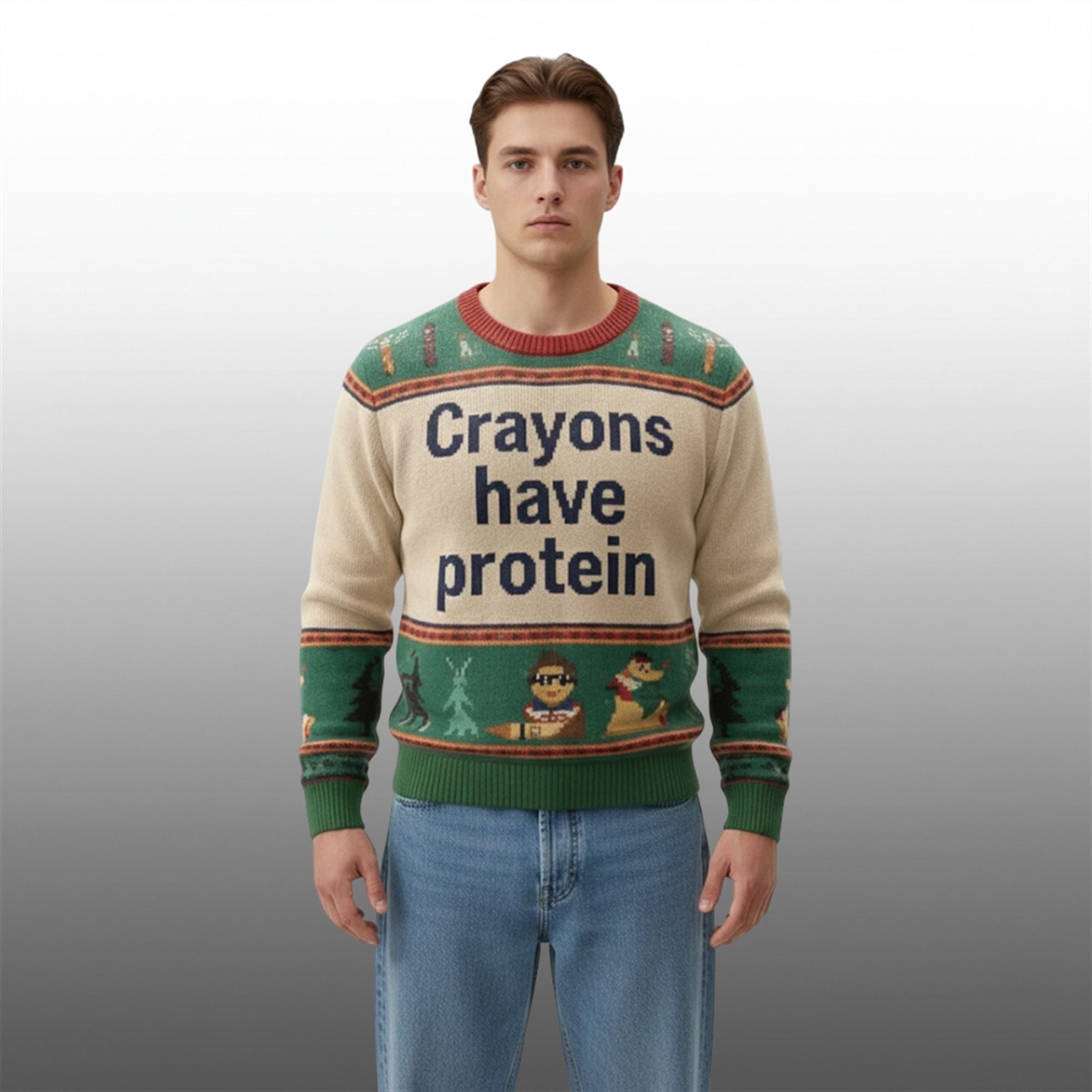 This sweater features a classic “ugly” fair isle pattern mixed with meme-heavy graphics. The centerpiece is the bold, unapologetic declaration: “Crayons have protein.” Flanked by pixelated graphics of crayons and chaotic holiday mascots, this design perfectly encapsulates the “meathead genius” humor that football Twitter adores. It is unisex, true-to-size, and designed to keep you warm whether you are at MetLife Stadium or crashing through a living room wall.rayons Have Protein Christmas Ugly Sweater