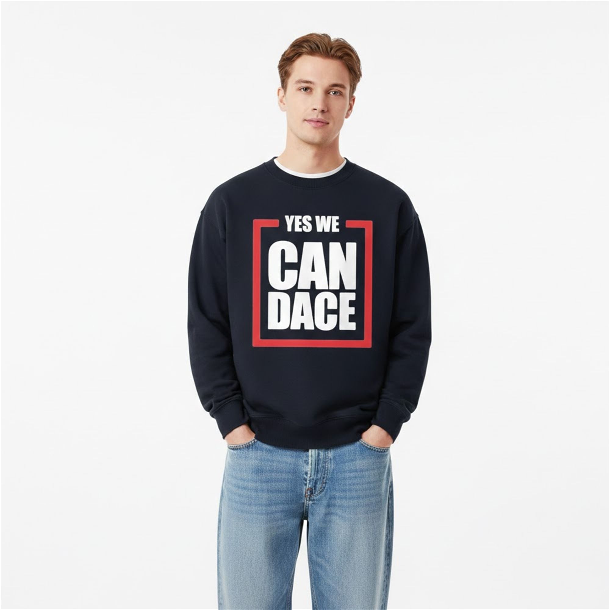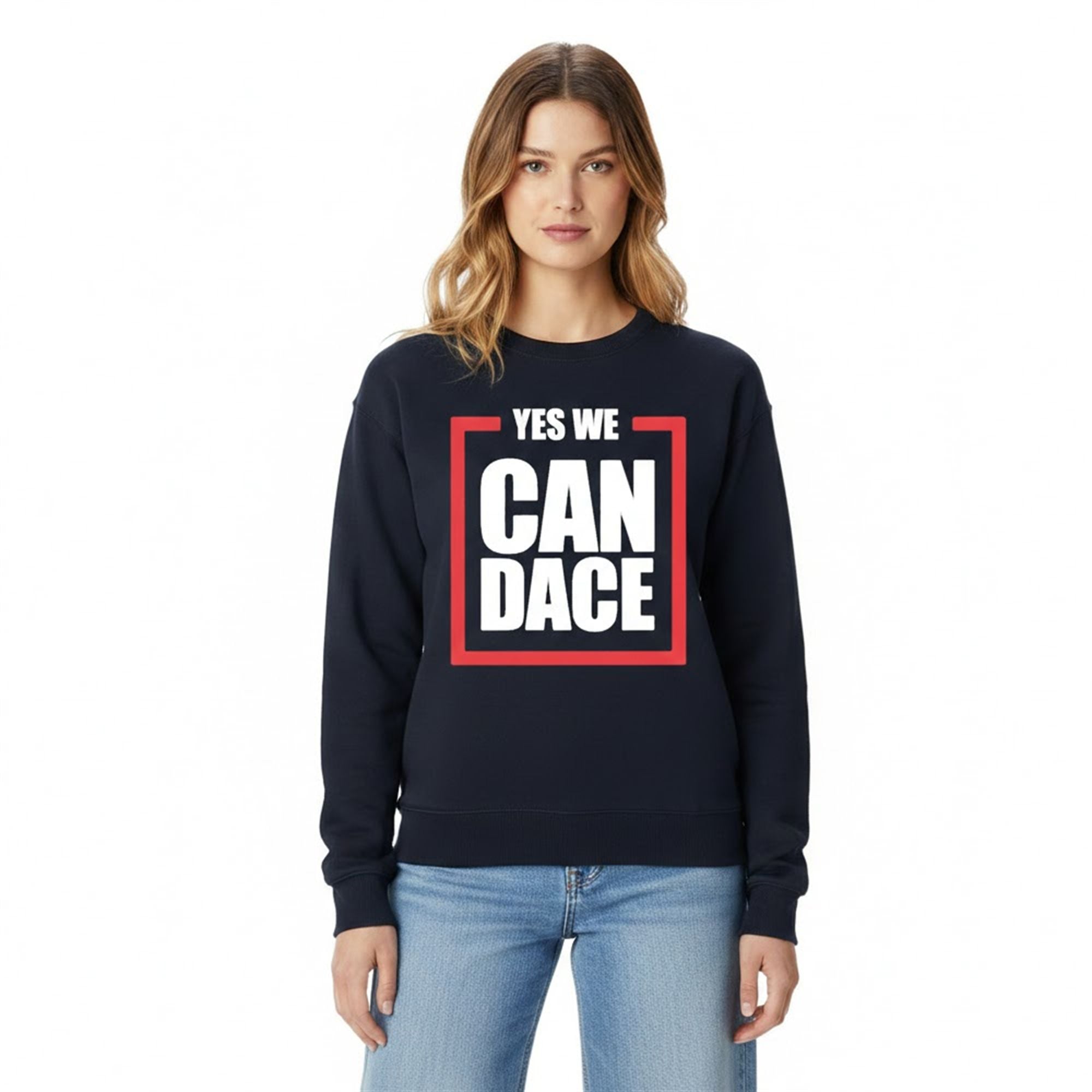 The sweatshirt is a masterclass in visual communication and modern political parody. The design centers around a deep navy blue background, serving as the perfect canvas for the high-contrast graphic on the chest. The text “YES WE CAN DACE” is stacked dynamically, utilizing a bold, sans-serif font in bright white. This typography is partially enclosed by a sharp, right-angled red framing device, drawing the eye immediately to the core message.