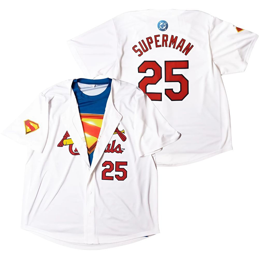 This Cardinals Superman Day Jersey 2025 Giveaway stands out with its clever and eye-catching design elements. Built on a crisp white base, it features the classic Cardinals script logo across the chest.