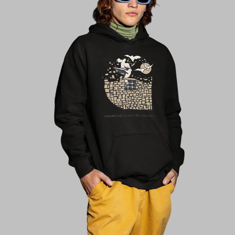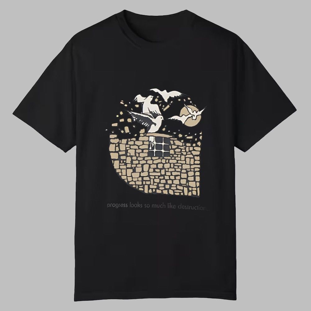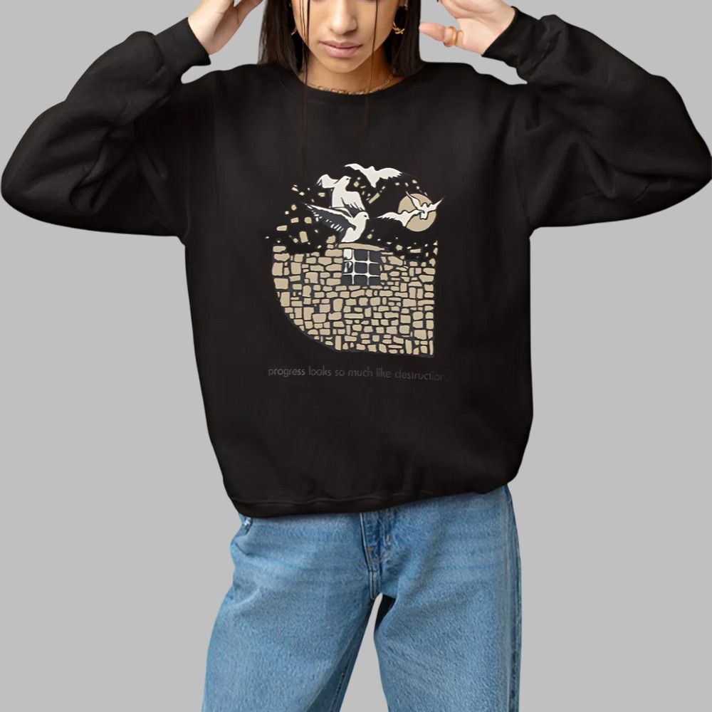 From a barred window within this structure, a flock of doves—universal symbols of peace and freedom—bursts forth into the moonlit night. This powerful imagery visualizes the core theme: true progress and freedom often emerge from what appears to be chaos or destruction. The subtle, impactful quote, “progress looks so much like destruction…” elegantly grounds the design in a philosophy that will resonate with deep thinkers, artists, and innovators. This shirt is designed for individuals who appreciate substance and story in their style.