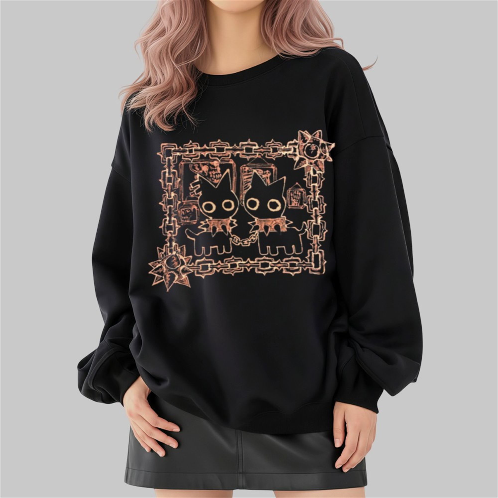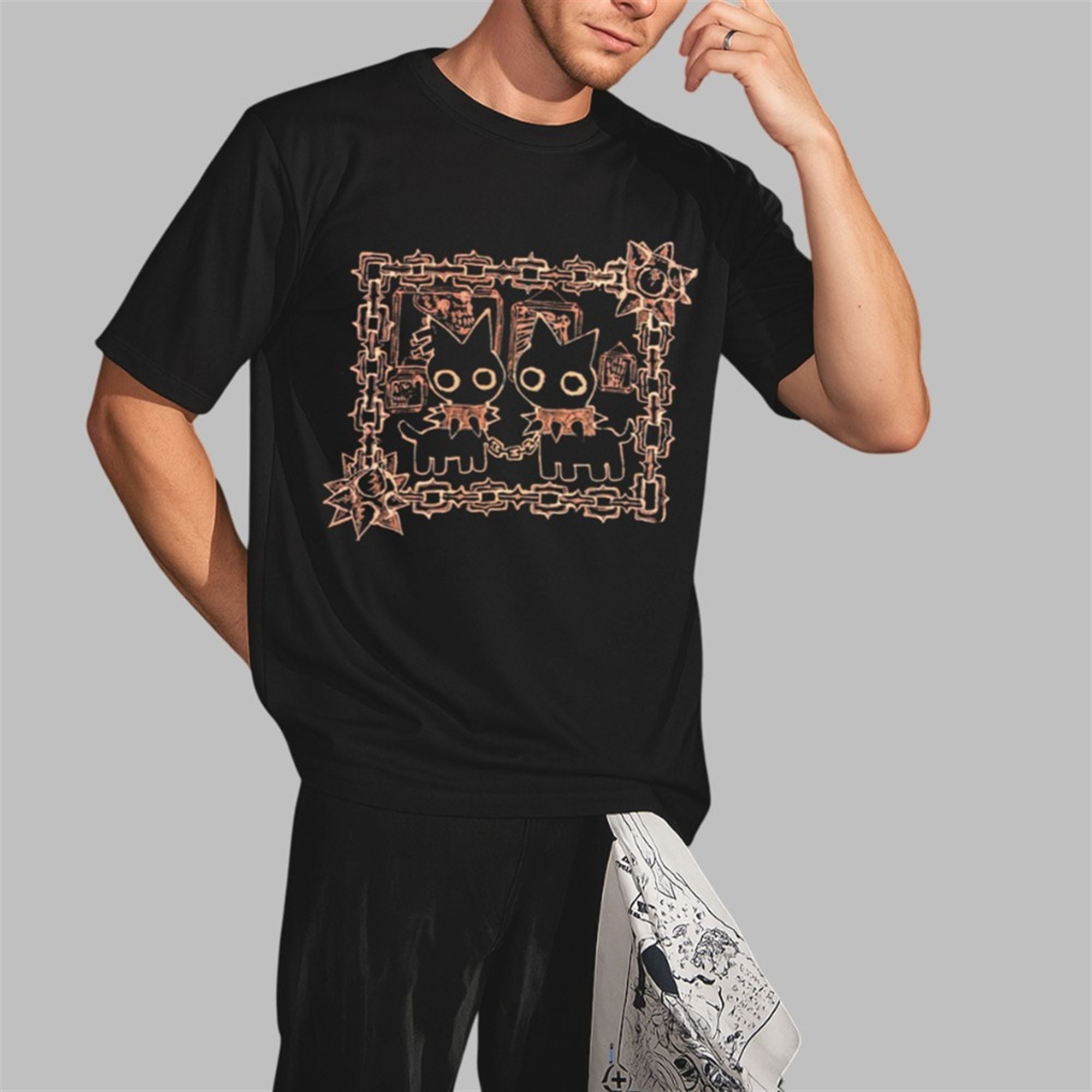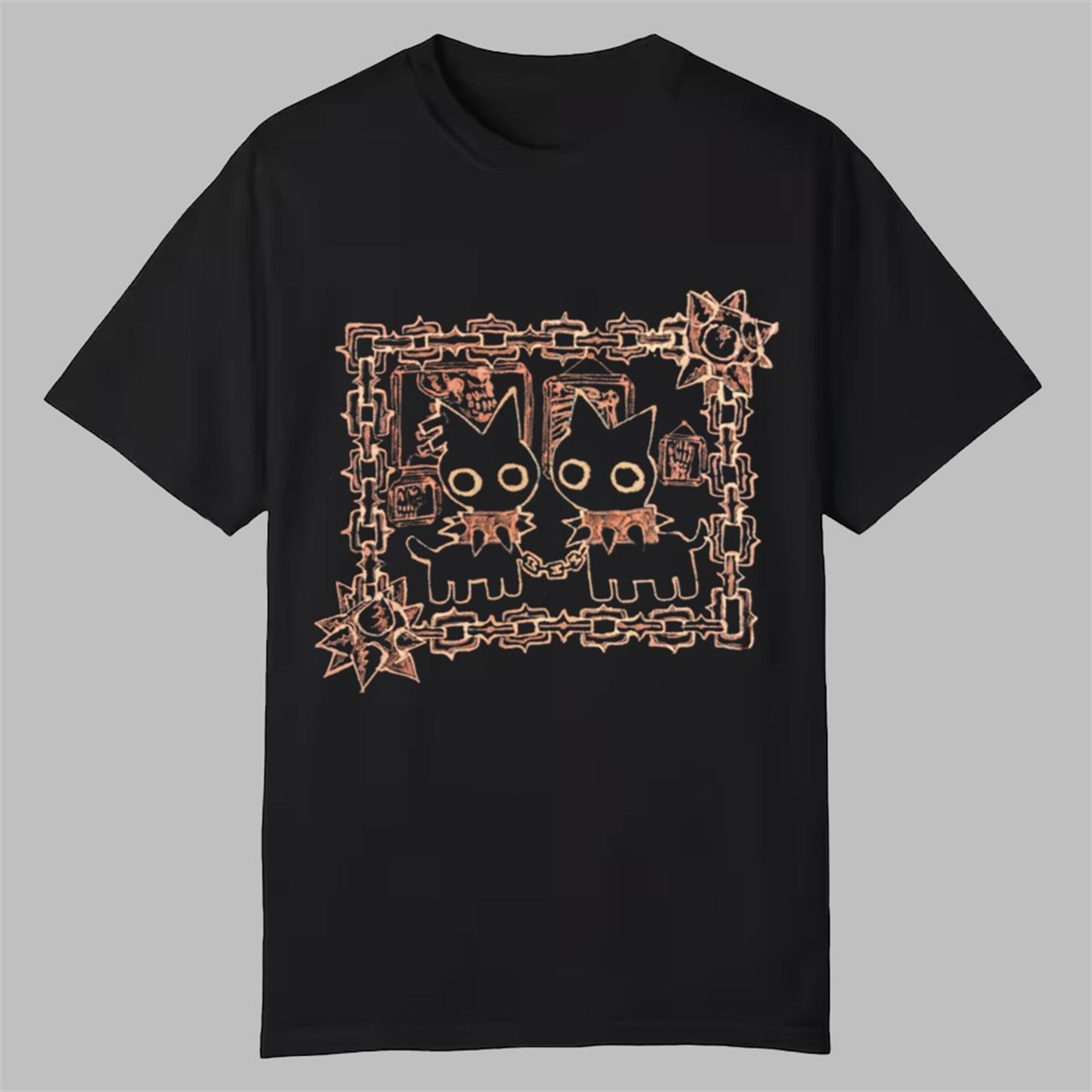 The shirt is a bold statement piece for the modern alternative wardrobe. The centerpiece of the shirt is a meticulously designed graphic featuring two stylized black cats—often referred to affectionately by the internet as “voids”—staring outward with large, hollow eyes. They are adorned with punk-rock staple spiked collars and linked together by a heavy chain, symbolizing an unbreakable, perhaps even fated, bond.