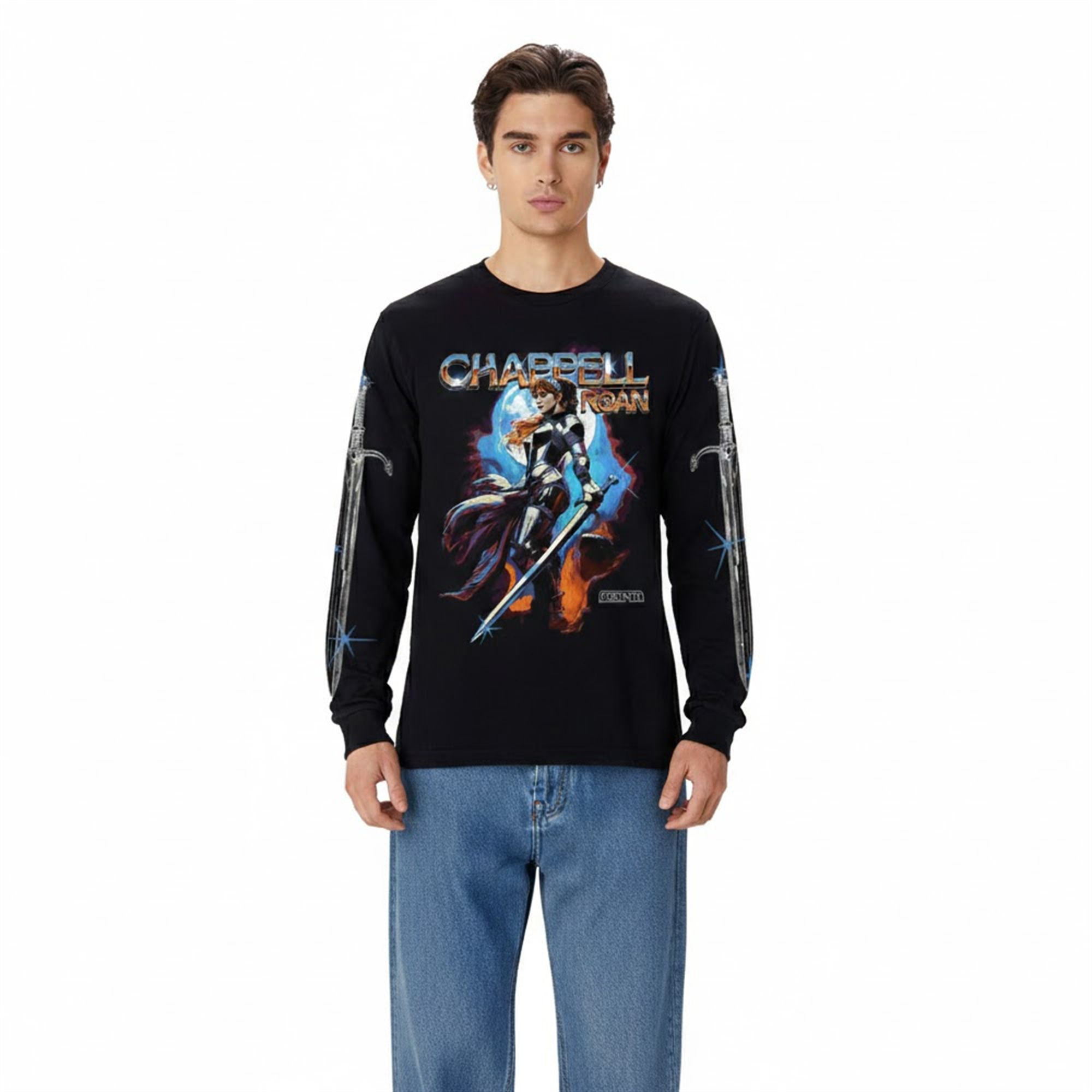 The front graphic commands attention with a stunning, highly detailed illustration of Chappell Roan reimagined as a fierce, sword-wielding knight in gleaming futuristic armor. Set against a mystical, glowing full moon and surrounded by a vibrant blue and red magical aura, the artwork evokes a sense of nostalgic dark fantasy. The retro-metallic, 80s-inspired “CHAPPELL ROAN” typography arches triumphantly across the chest, while the classic “FORTNITE” logo anchors the bottom corner, stamping this epic union. Furthermore, the design extends beyond the torso; both sleeves are adorned with massive, intricately detailed broadswords pointing downward, accented with stylized blue starlight sparkles to give your arms a sharp, battle-ready appearance.