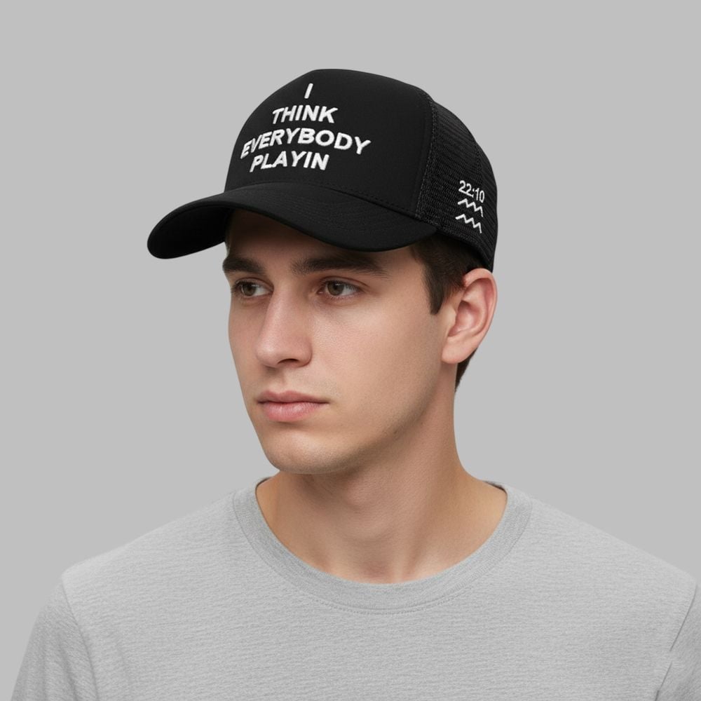 This cap features the iconic, bold white embroidery of the phrase “I THINK EVERYBODY PLAYIN” front and center. The design is crisp, clean, and immediately recognizable to Charleston White’s community and those immersed in contemporary street and social commentary. On the side panel, the enigmatic “22:10” detail, serving as an exclusive, insider reference for the most loyal fans and adding a layer of unique branding and authenticity to the piece. Constructed with a breathable mesh back and a durable front panel, this hat ensures maximum comfort and enduring style for daily wear. It’s a versatile accessory built for both making a statement and providing classic, comfortable coverage.