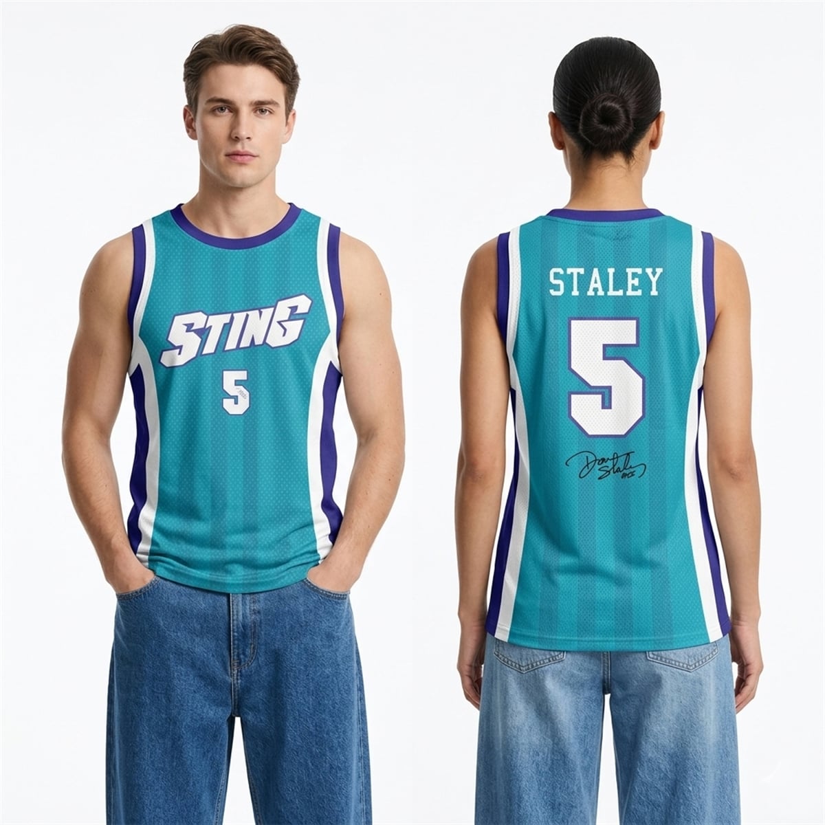 The jersey is a vibrant visual time capsule from one of the most remarkable seasons in history. Featuring the bold, eye-catching teal base complemented by deep purple and crisp white accents, this item faithfully recreates the aesthetic that defined Charlotte’s professional women’s basketball presence. Emblazoned with the iconic “STING” typography across the chest and Staley’s legendary number 5, the design captures the quintessential early-2000s sports aesthetic. The back proudly displays Staley’s name, cementing its status as a tribute to one of the most influential figures in modern basketball.