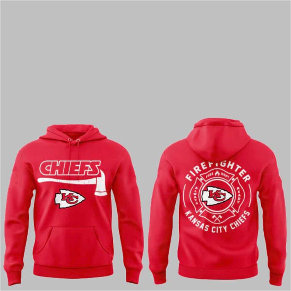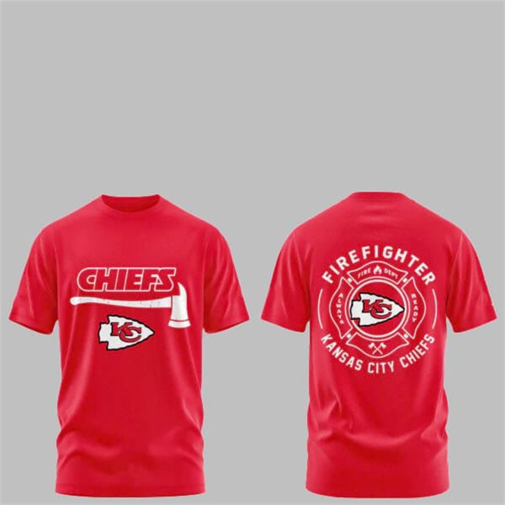 The front of this vibrant red tee makes a bold statement with the word “CHIEFS” displayed prominently. In a clever and meaningful design twist, the crossbar is formed by a silver firefighter’s axe, symbolizing strength and readiness. Positioned just below is the iconic KC arrowhead logo, rooting the design firmly in the heart of Chiefs Kingdom. On the back, a custom-designed, firefighter-inspired emblem proudly declares your allegiance. This circular crest features “FIREFIGHTER” and “KANSAS CITY CHIEFS” encircling the team logo, creating a powerful badge of honor that pays homage to traditional fire department insignia.