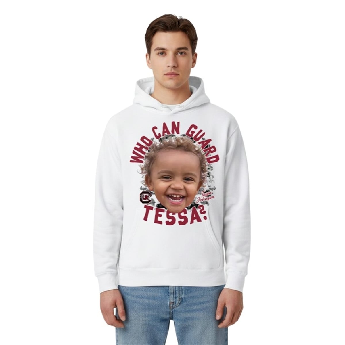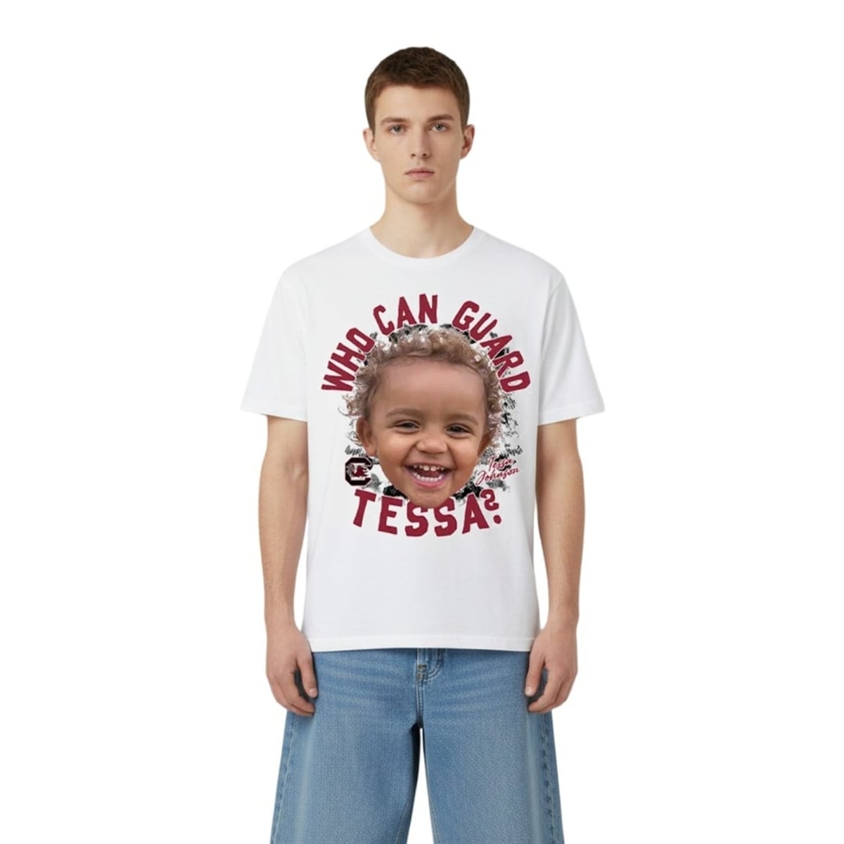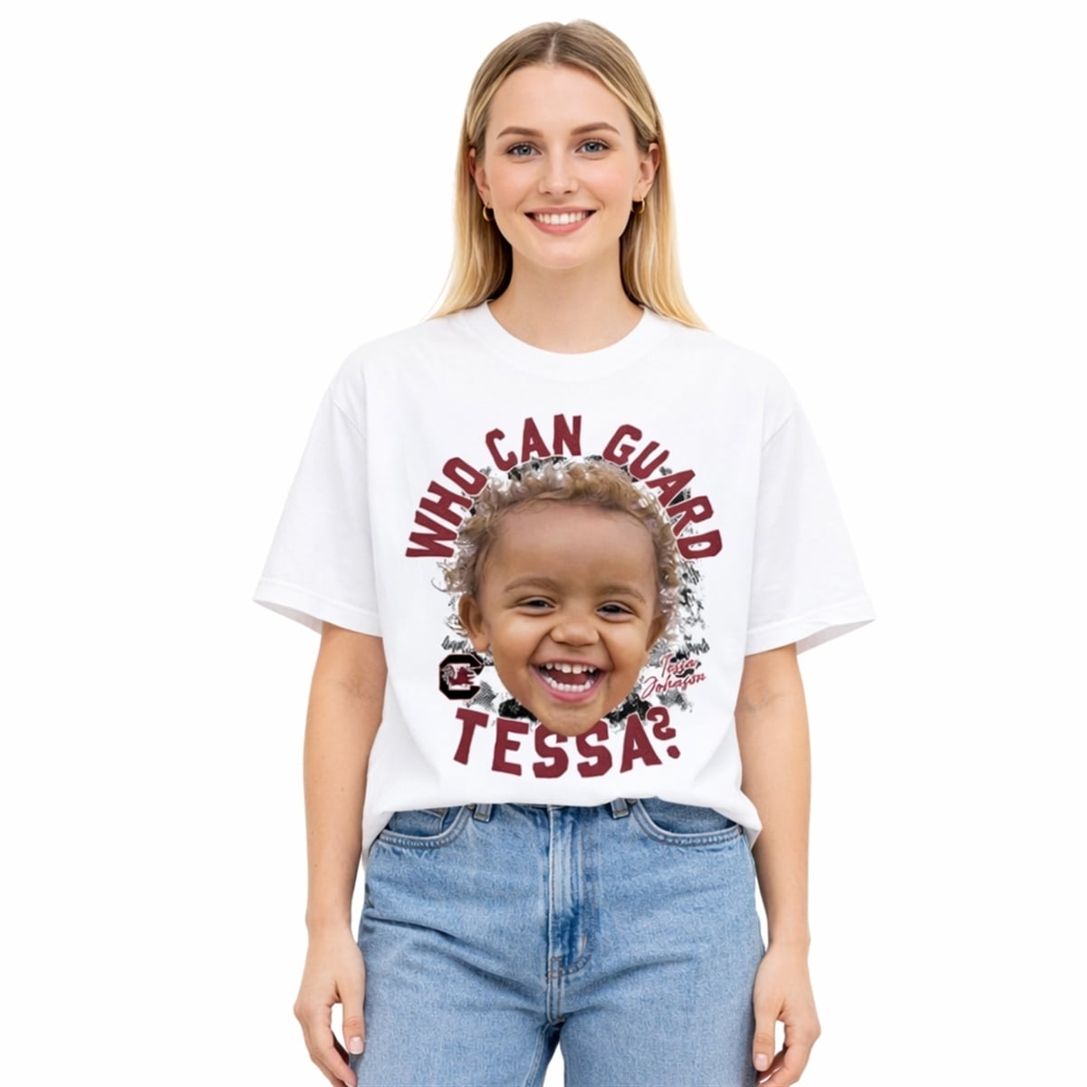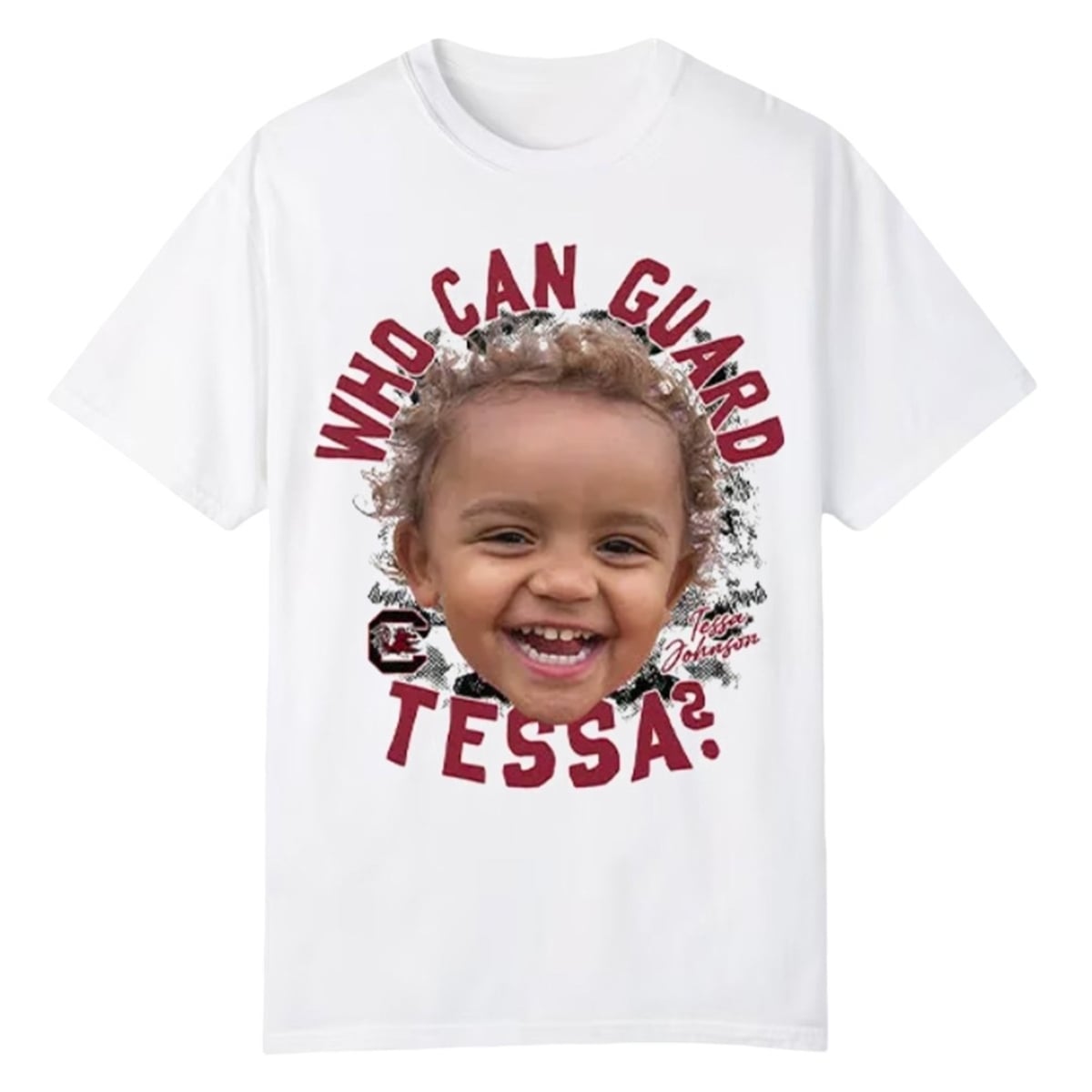 The shirt is a masterclass in sports meme culture and team pride. The front of the garment prominently features an oversized, vintage-style childhood photograph of South Carolina guard Tessa Johnson, capturing a joyful, smiling baby face. Arching above the photograph in bold, collegiate-style burgundy lettering is the challenging question: “WHO CAN GUARD“. Below the photo, completing the thought in matching, impactful typography, is the name “TESSA?“.