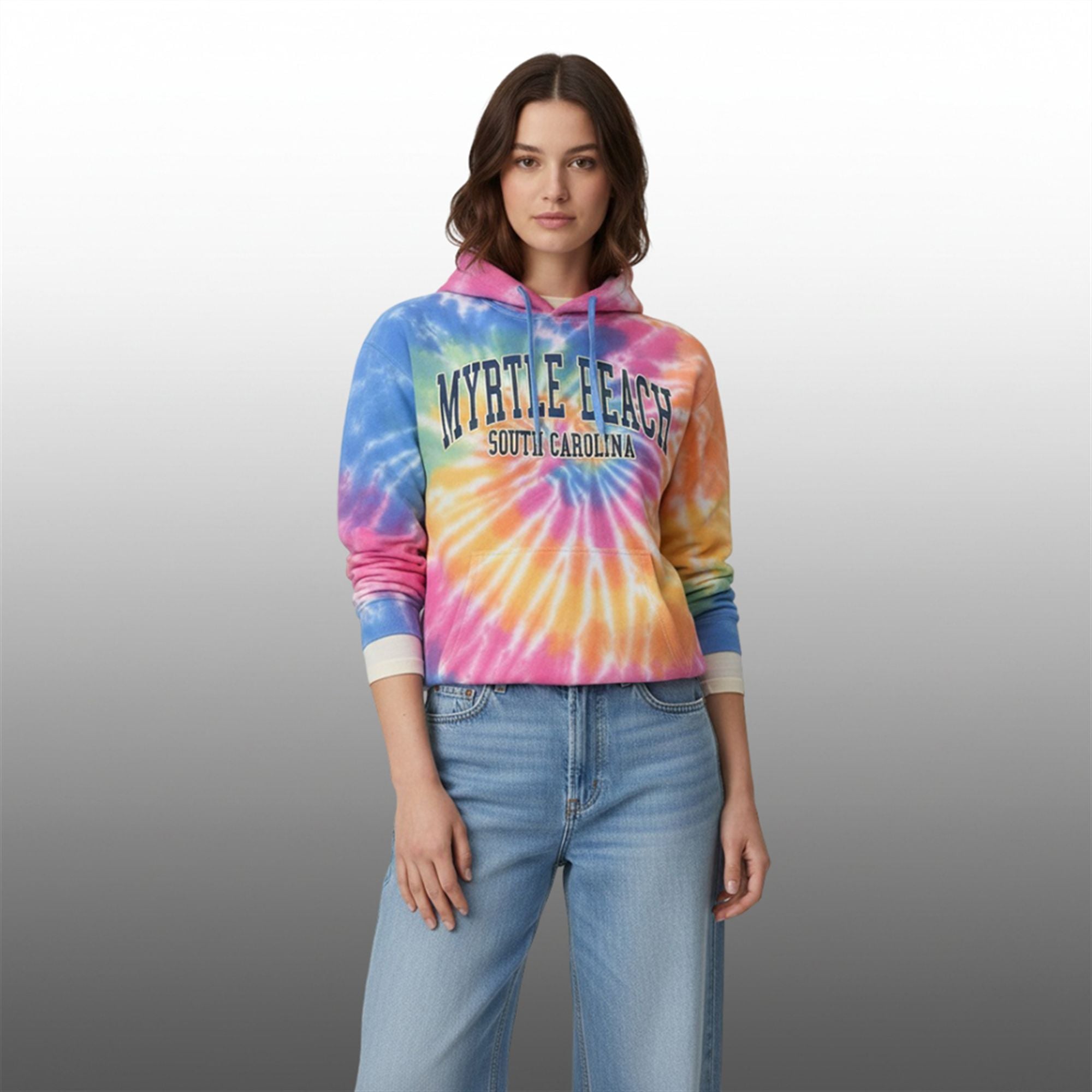 This hoodie features the iconic, sunset-inspired tie-dye pattern blending swirls of electric blue, neon pink, and vibrant orange—mimicking the laid-back vibes of the South Carolina coast. Across the chest, the bold collegiate lettering reads “MYRTLE BEACH SOUTH CAROLINA,” cementing its status as a souvenir-style classic turned cult favorite.