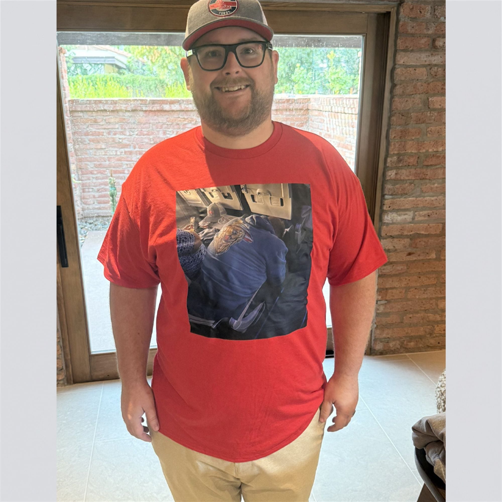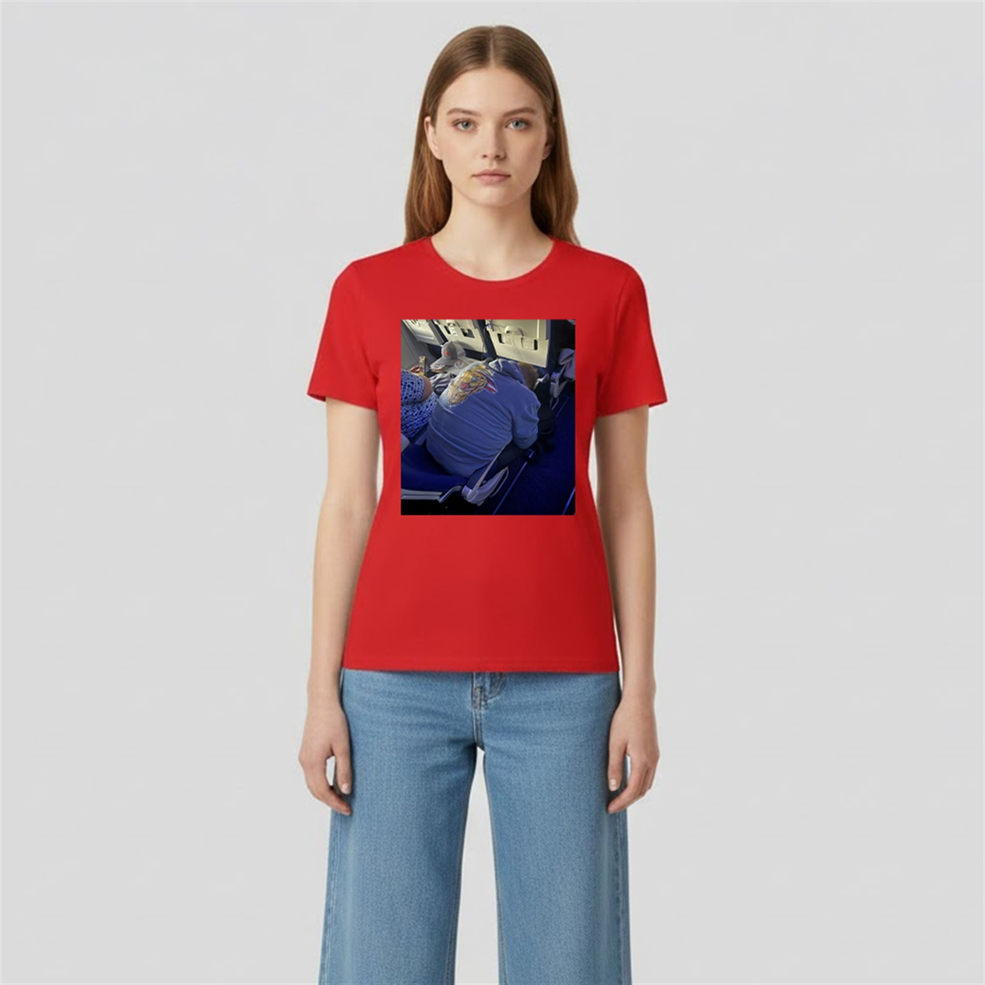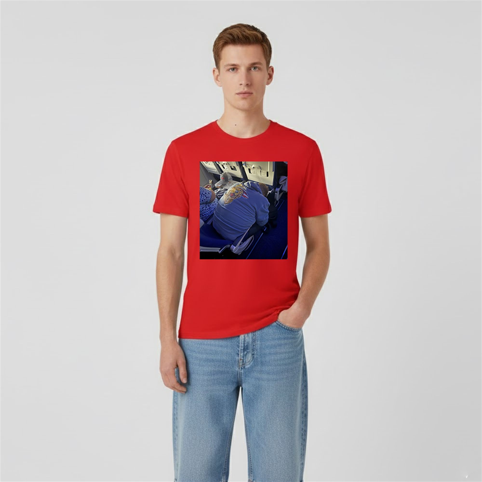 This shirt showcases the iconic, unedited photograph of a man in a blue hoodie passed out in an airplane aisle seat, famously slumped over with a mysterious object (often debated to be a slice of pizza or a breadstick) resting on his shoulder. The image is a masterpiece of accidental comedy, capturing a moment of pure, unadulterated vulnerability and travel fatigue. By wearing this shirt, you are immortalizing a moment that the internet refused to let fade away. The graphic is printed prominently, ensuring the details of the “legend”—from the posture to the surrounding cabin setting—are instantly recognizable to anyone familiar with the meme’s lineage.