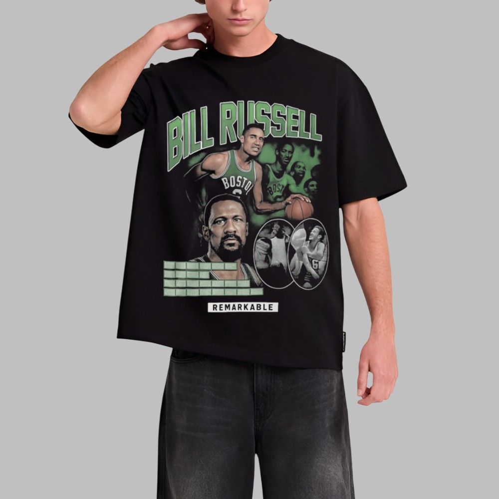 Drawing inspiration from the iconic bootleg rap tees of the 1990s, this shirt boasts a visually rich and compelling aesthetic. The front graphic is a thoughtfully curated collage featuring Bill Russell in his prime, showcasing his intensity on the court and his reflective, powerful presence off it. The bold, green-hued typography and retro design elements create an authentic vintage feel that is currently at the pinnacle of streetwear fashion.