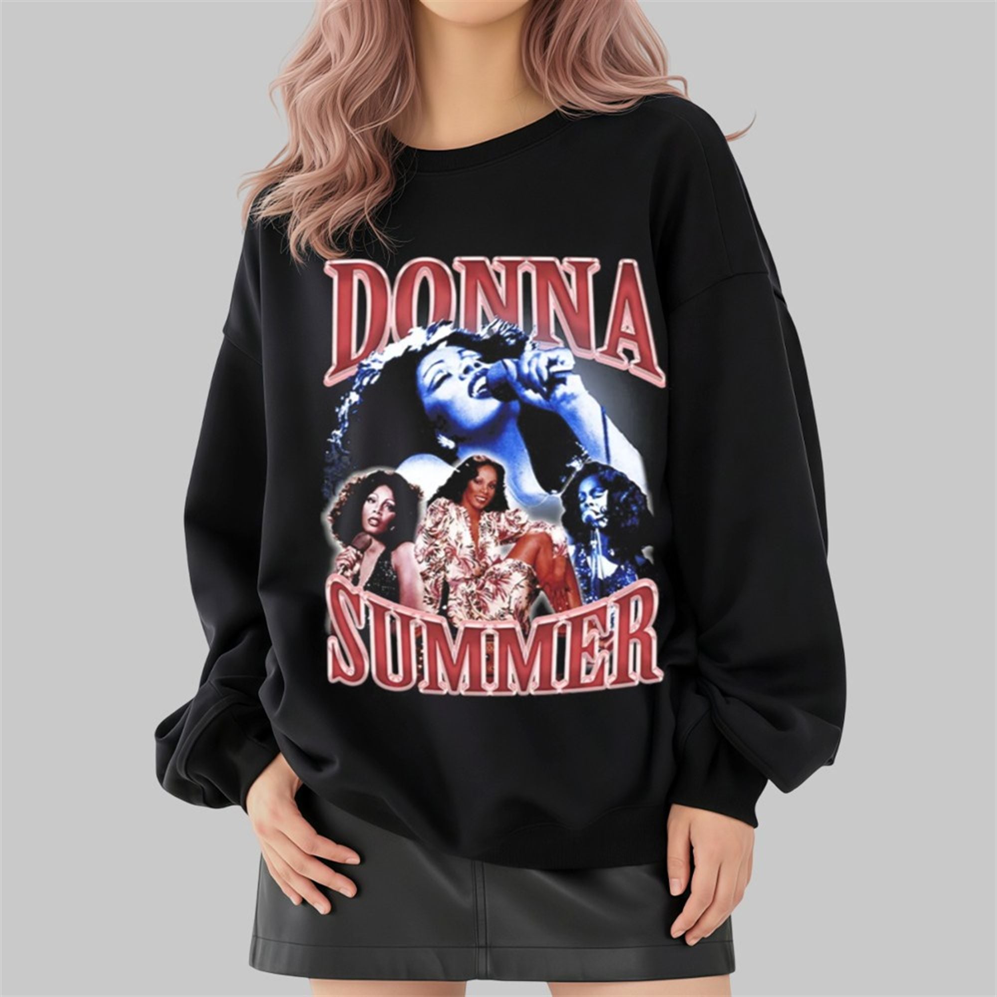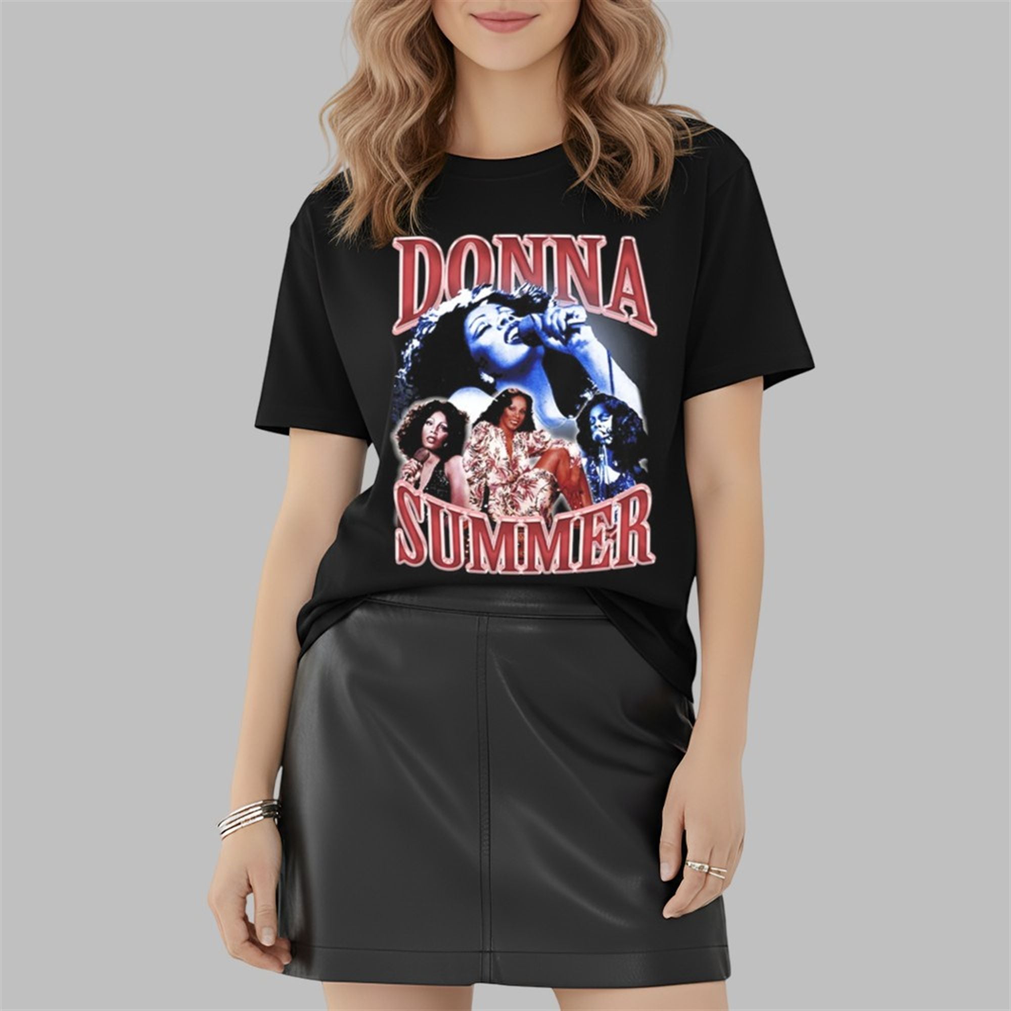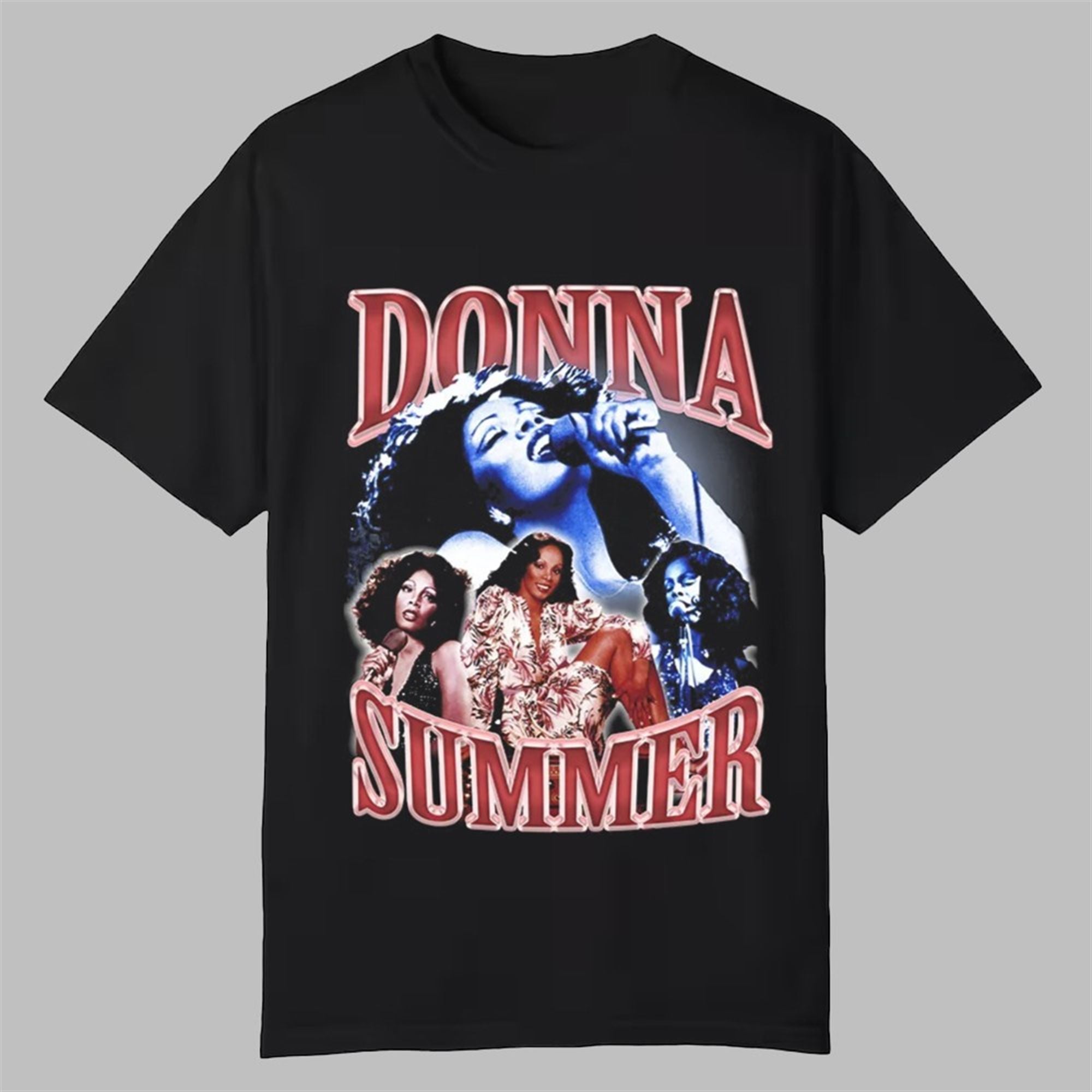 The graphic is anchored by “DONNA” and “SUMMER” in large, red, bubbly retro typography that mimics the neon aesthetics of the late 1970s. The central imagery features a soulful, blue-tinted portrait of the singer mid-performance, flanked by two full-color shots that capture her iconic stage presence. Set against a black cotton background, the colors pop vividly, creating a worn-in, thrifted look that is highly sought after in current fashion trends.