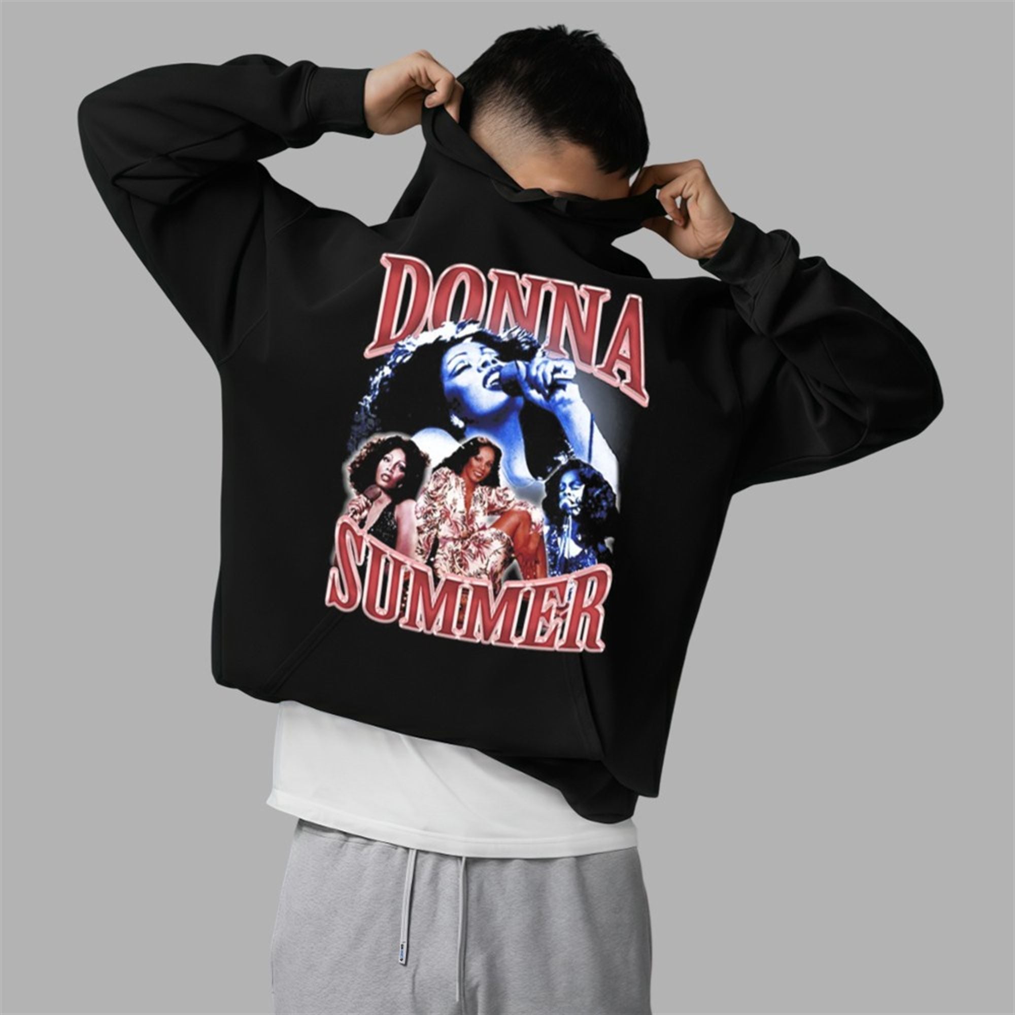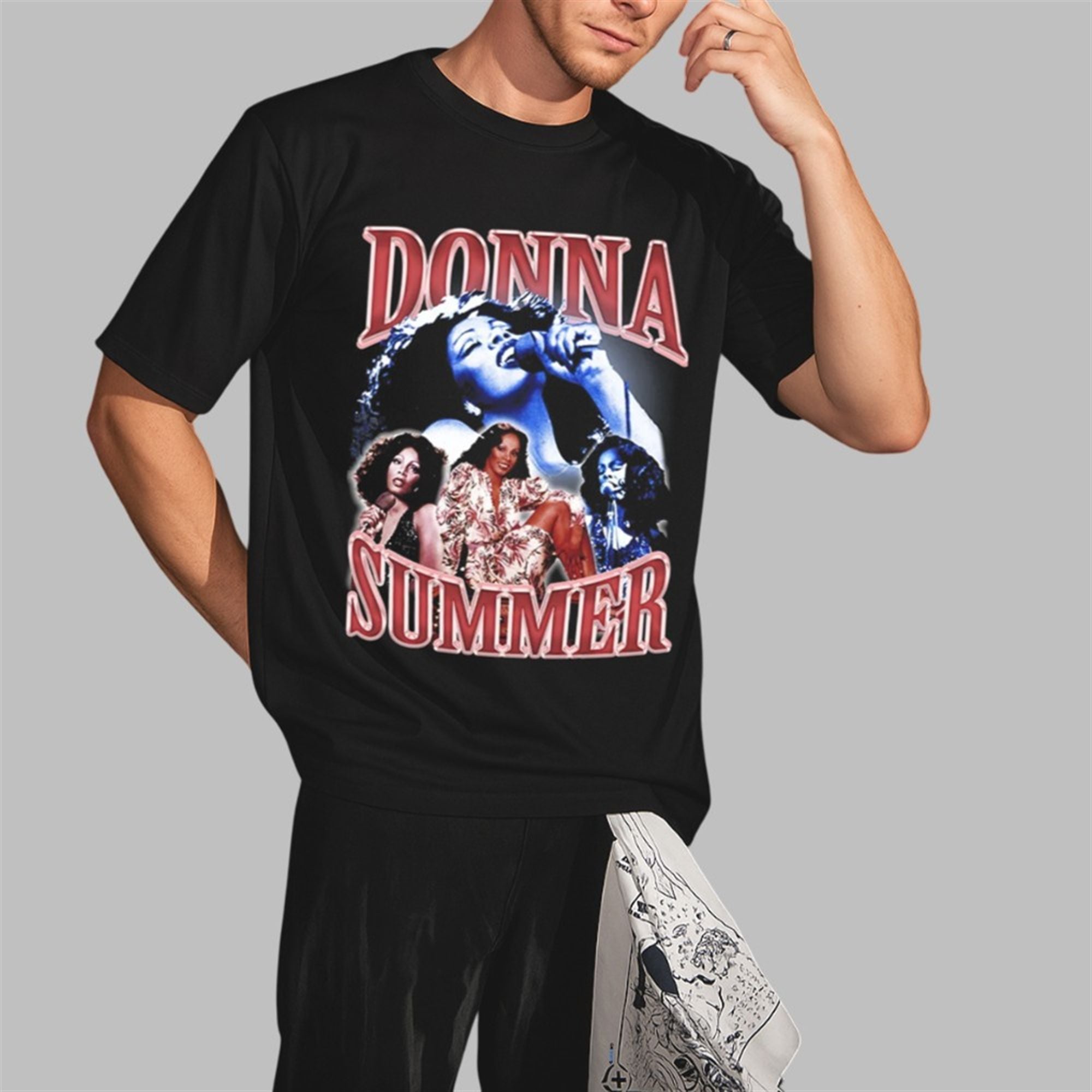 The shirt is a quality reproduction of the graphic tee worn by the Patriots’ defensive standout. It features a bold, nostalgic design that immediately catches the eye. The front of the shirt showcases a vintage-style collage of Donna Summer, the undisputed Queen of Disco.