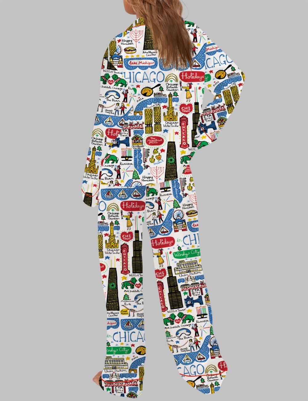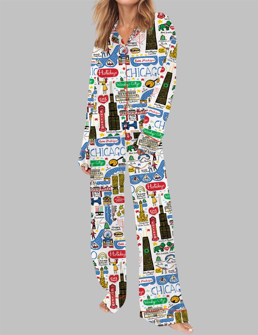 The star of this pajama set is its incredibly detailed and vibrant print. It’s a playful, hand-drawn map that guides you through a holiday tour of Chicago. You’ll spot the towering Willis Tower and the iconic John Hancock Center, the historic Chicago Water Tower, and the reflective glimmer of Cloud Gate (affectionately known as “The Bean”). Look closer and you’ll find Navy Pier’s Centennial Wheel, the legendary Chicago Theatre marquee, CTA trains zipping by, and sailboats on a festive Lake Michigan. Every element is infused with holiday spirit, from cheerful colors to subtle Christmas accents, making this a unique piece of wearable art.