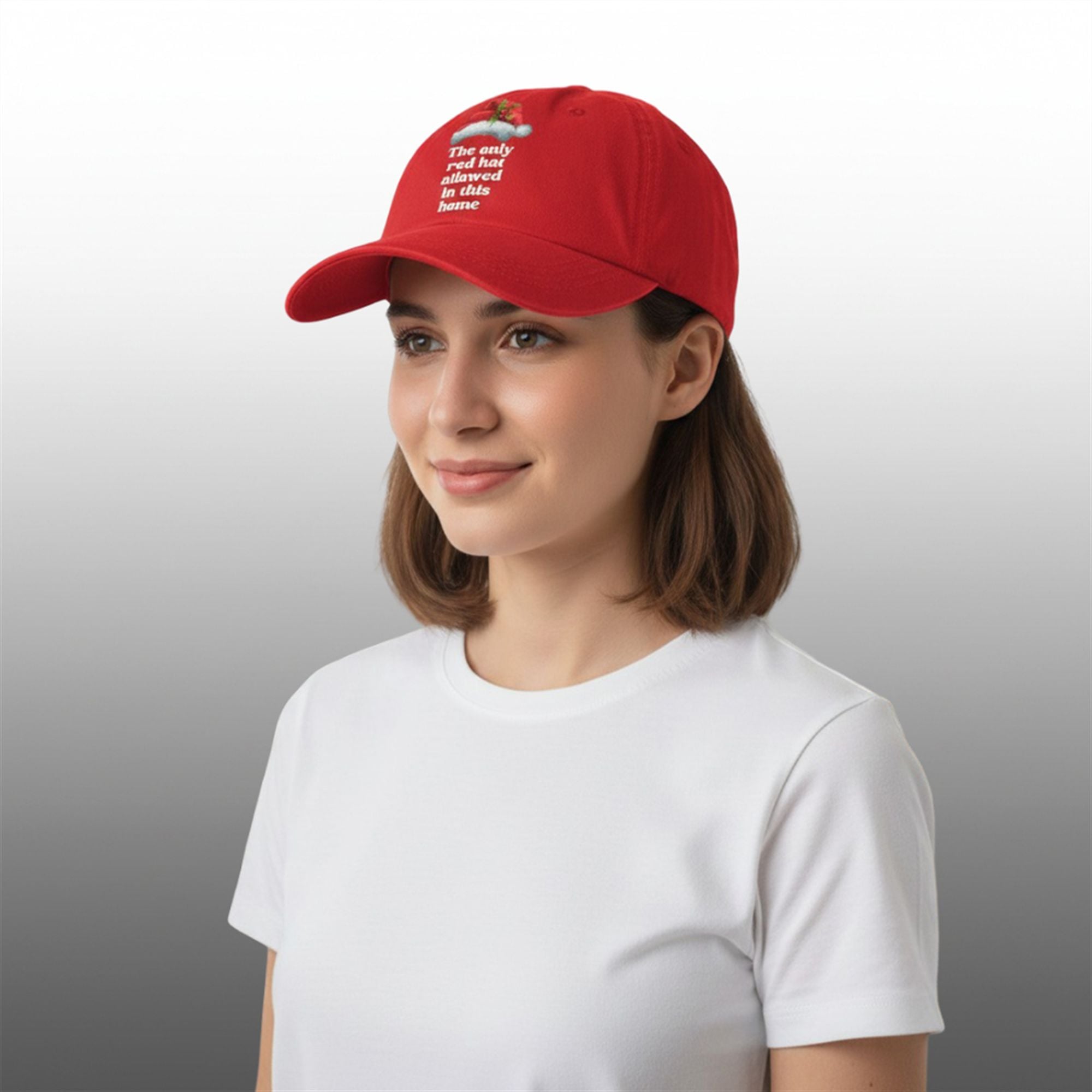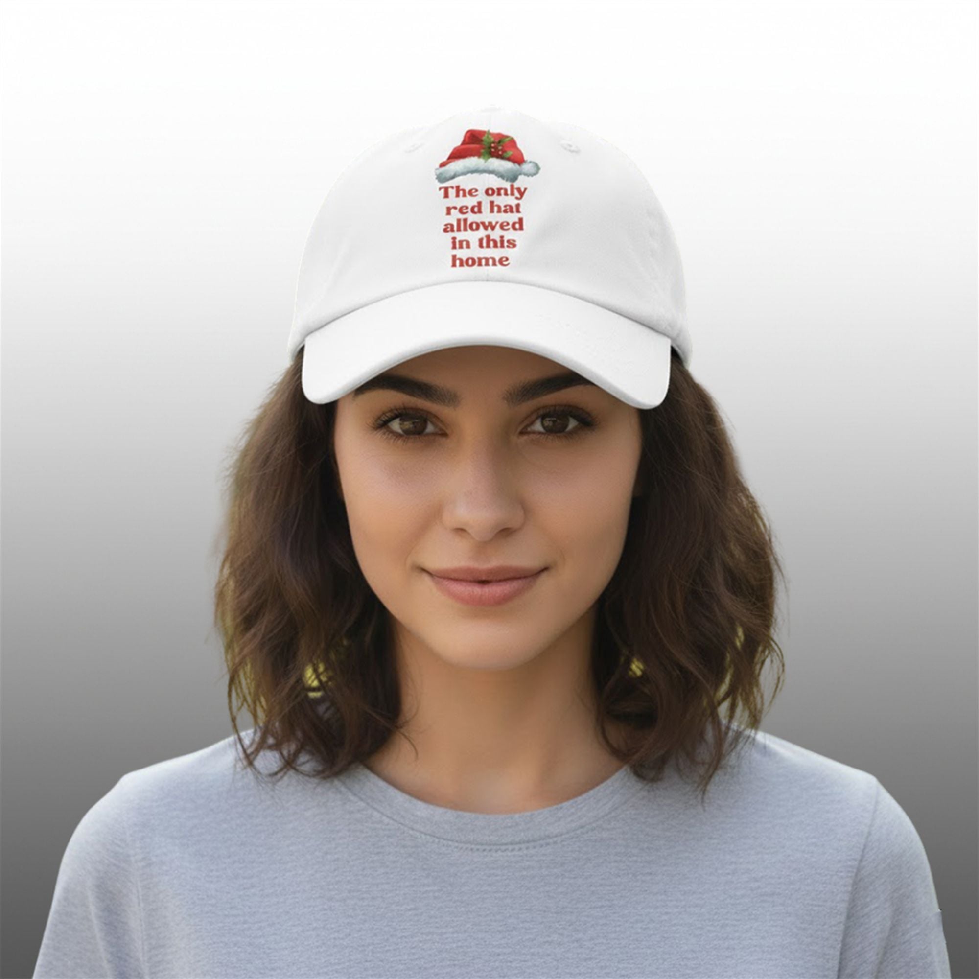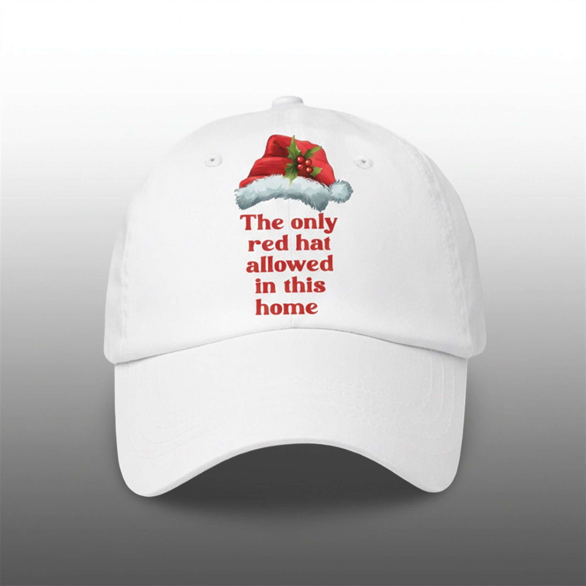 The cap features a rich, vibrant red cotton twill fabric that serves as the canvas for the message. Centered on the front is a quality print featuring a realistic, plush Santa hat adorned with festive holly and berries. Below the graphic, bold white serif text “The Only Red Hat Allowed In This Home” clearly states the house rules. It is the ultimate accessory for navigating the 2025 holiday circuit with a sense of humor and a clear message.