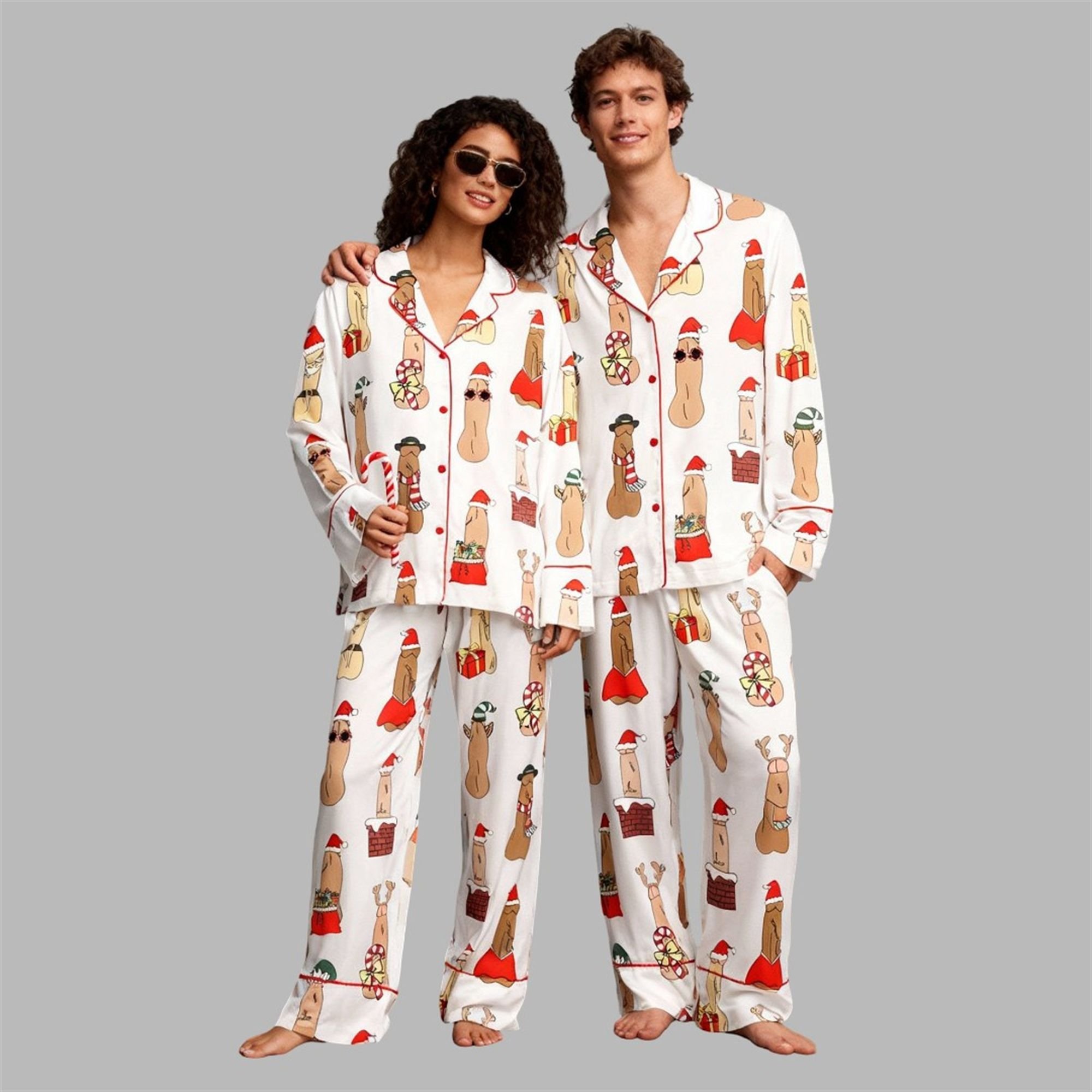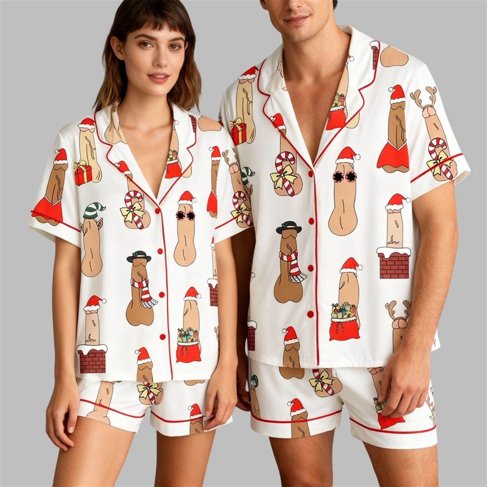 This matching set, featuring a button-down short-sleeve shirt and matching shorts, is crafted for comfort and pure comedic value. The crisp white fabric acts as the perfect canvas for the all-over print, while the classic red piping adds a touch of traditional holiday style. It’s the perfect camouflage for the hilariously “festive” shapes that make this set truly one-of-a-kind. This is the uniform for those who believe the best holiday traditions are the ones you make yourself—preferably ones that make your friends blush and then cry-laughing.