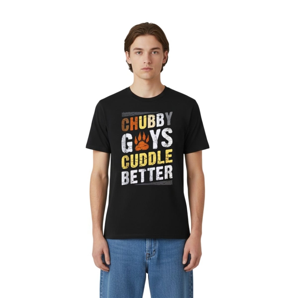 Make a bold, unapologetic statement and celebrate who you are with the Chubby Guys Cuddle Better Bear Shirt. Designed for those who embrace body positivity and the vibrant bear community, this iconic tee features a playful, distressed typography design complete with a signature orange paw print.