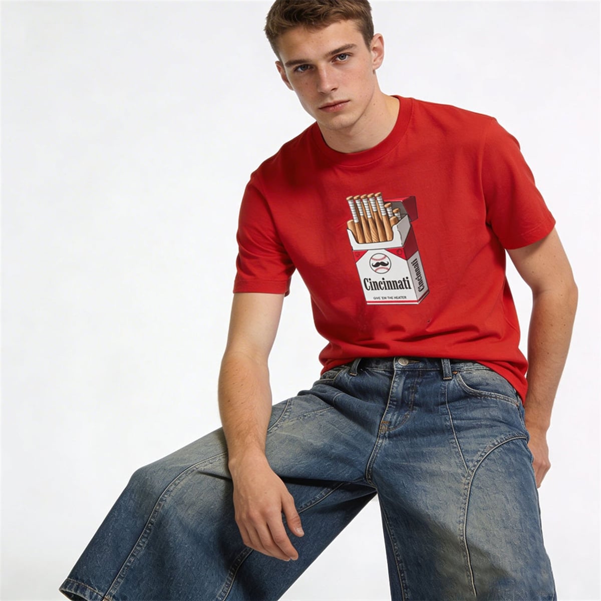The shirt is a masterclass in visual irony and sports fandom. Set against a bold, striking red background that commands attention, the central graphic is an intricate parody of iconic, vintage packaging. Instead of standard contents, the flip-top box is loaded with an arsenal of wooden baseball bats, ready to be pulled out for the big game. Emblazoned across the front of the box is the bold “Cincinnati” text, anchoring the piece in local pride. Below this, a smartly dressed baseball sporting a classic handlebar mustache adds a layer of vintage, barbershop-quartet-era charm.