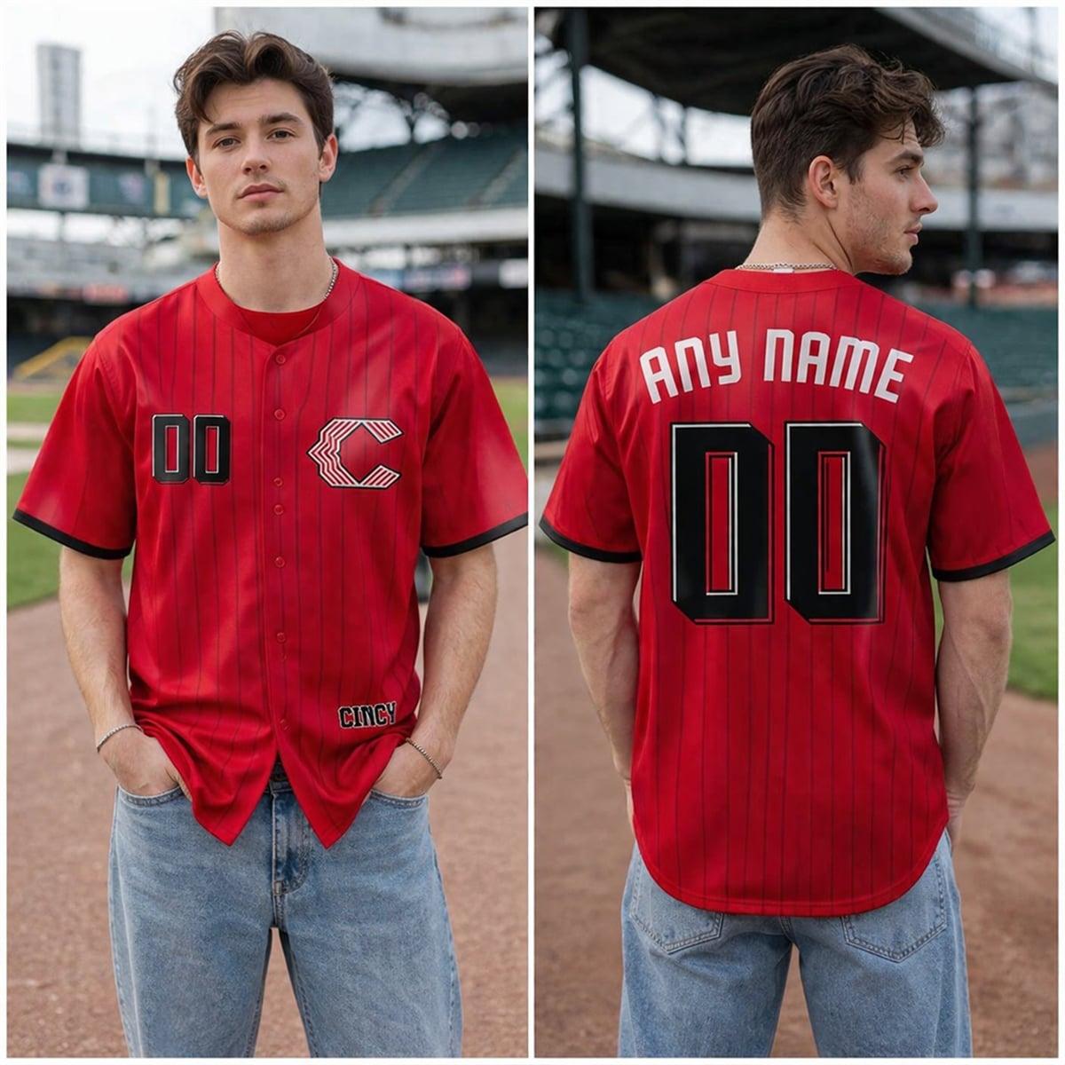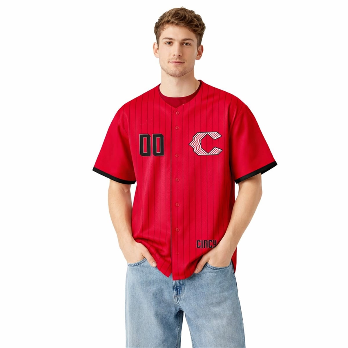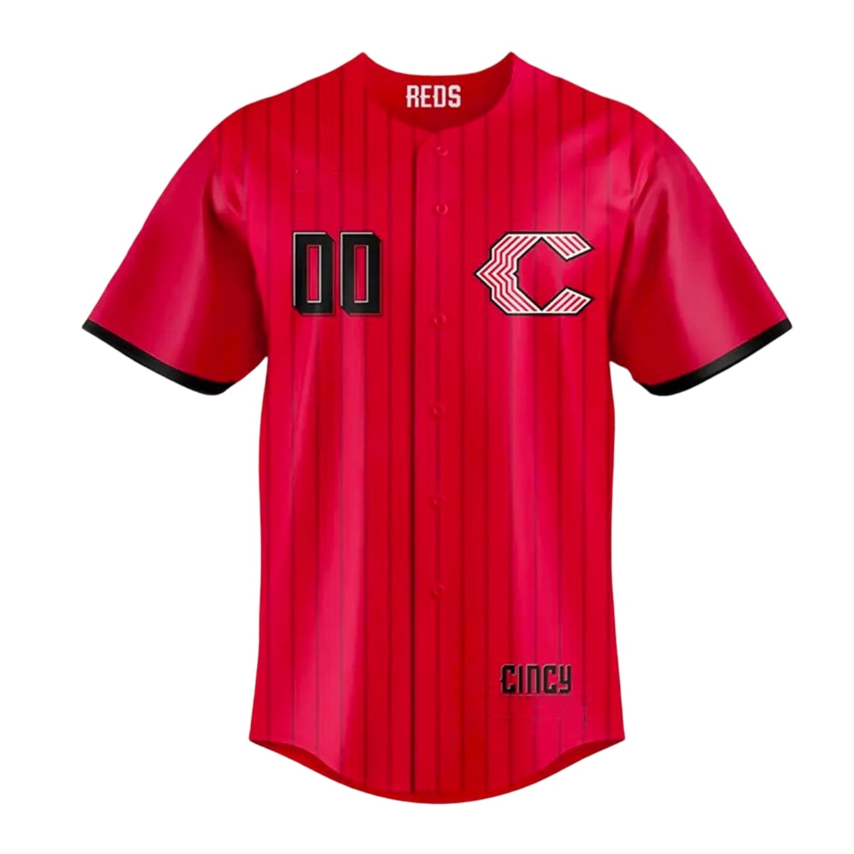 The jersey completely revitalizes the franchise’s visual identity. Dominating the aesthetic is an unapologetic, vivid red base that demands immediate attention. Gone is the traditional wishbone “C“; in its place sits a modernized, chevron-striped Cincinnati Reds “C” logo on the left chest, conveying a sense of forward momentum. The jersey features stark, block-style numbering with dramatic black drop-shadows, creating a profound three-dimensional pop against the bright background. Additionally, the stylized “CINCY” jock tag anchors the design, adding a localized streetwear touch. Paired with its matching cap featuring the identical striped insignia, this look is cohesive, aggressive, and undeniably modern.