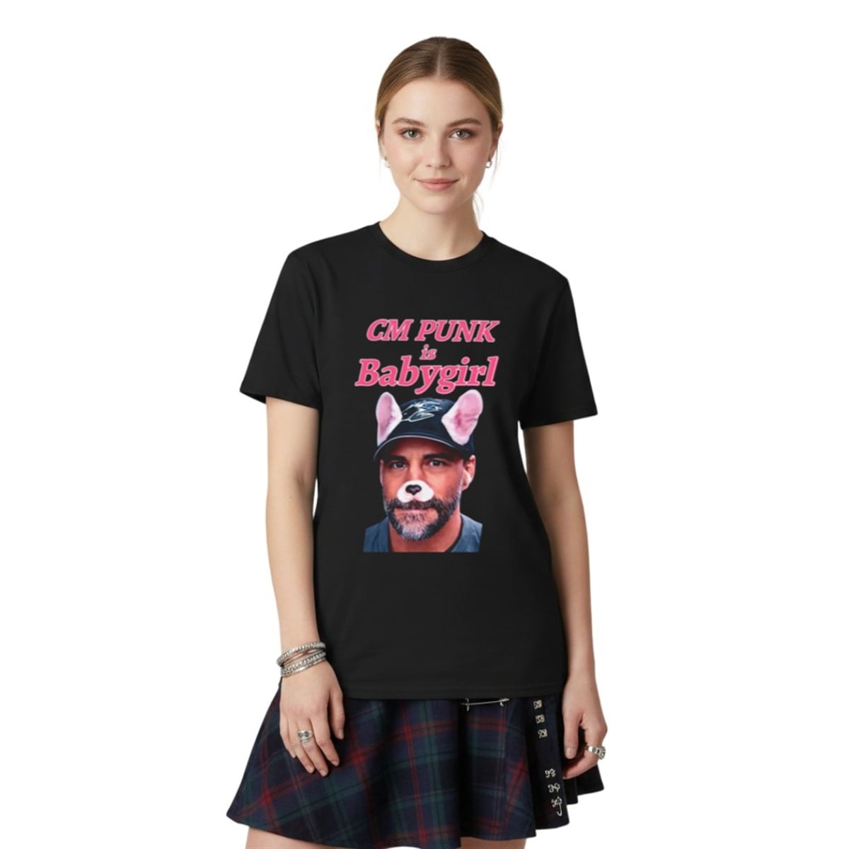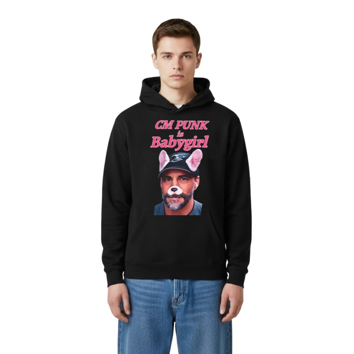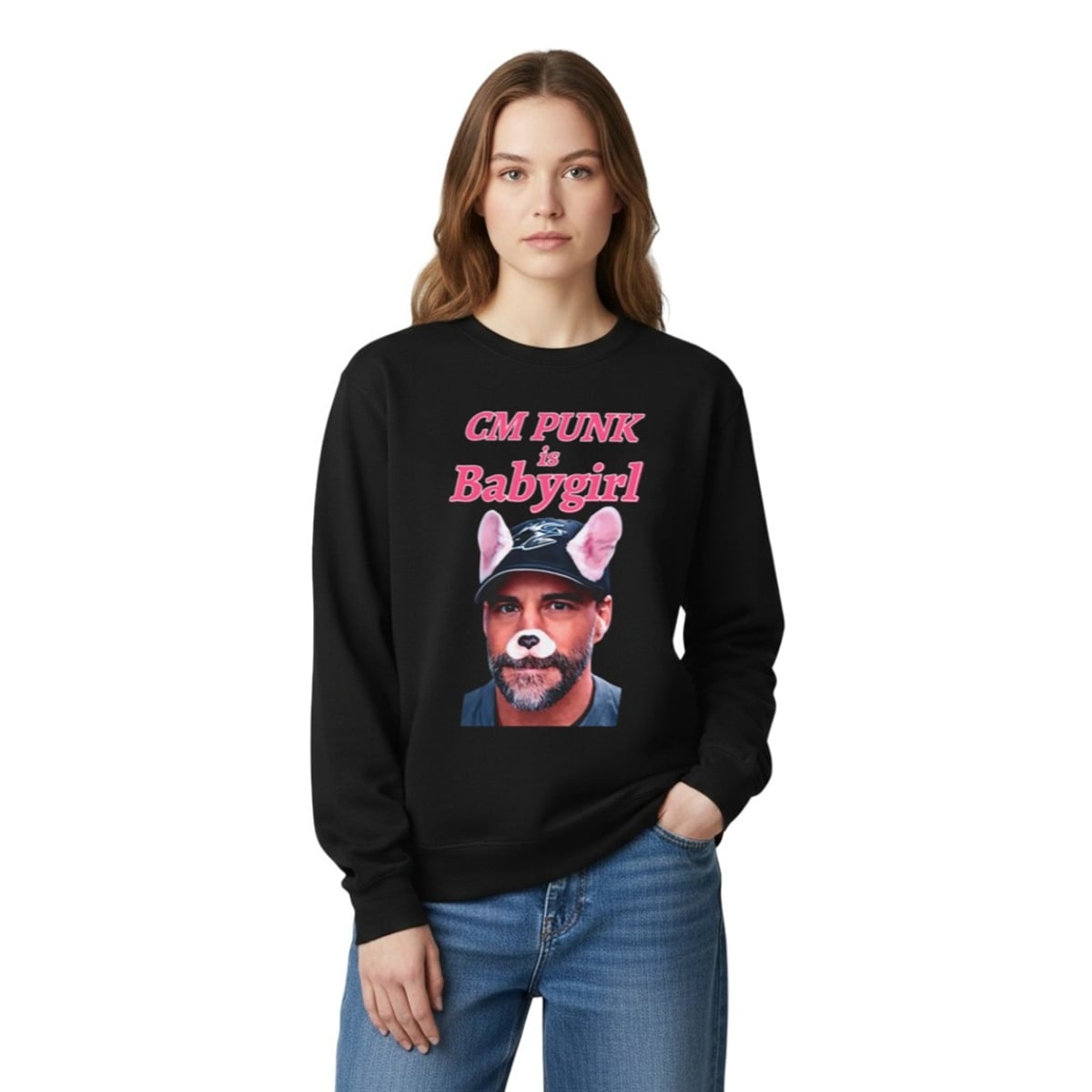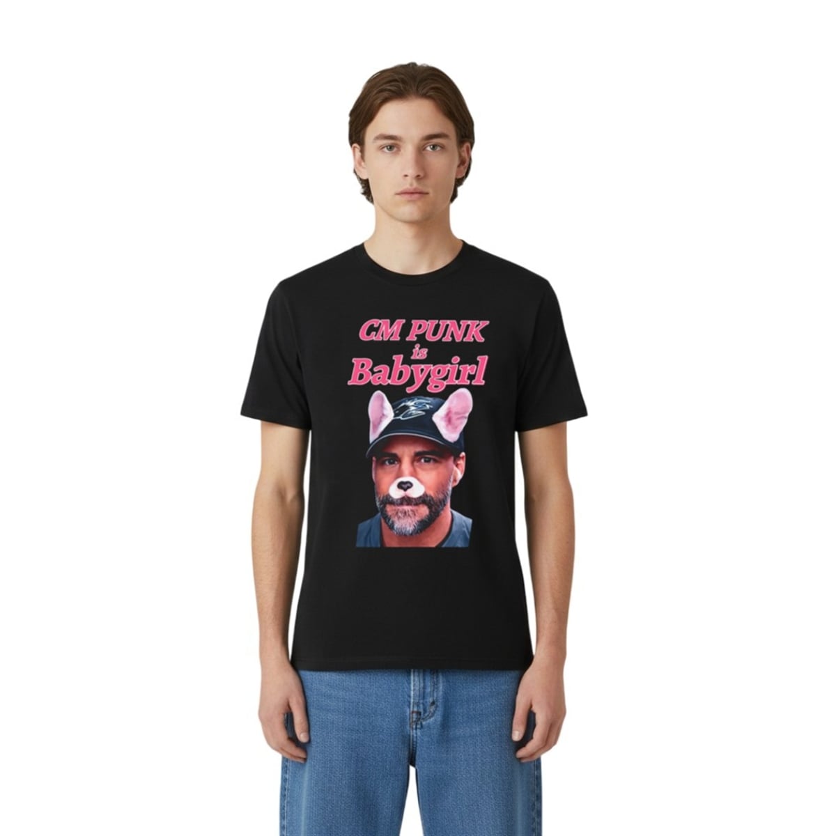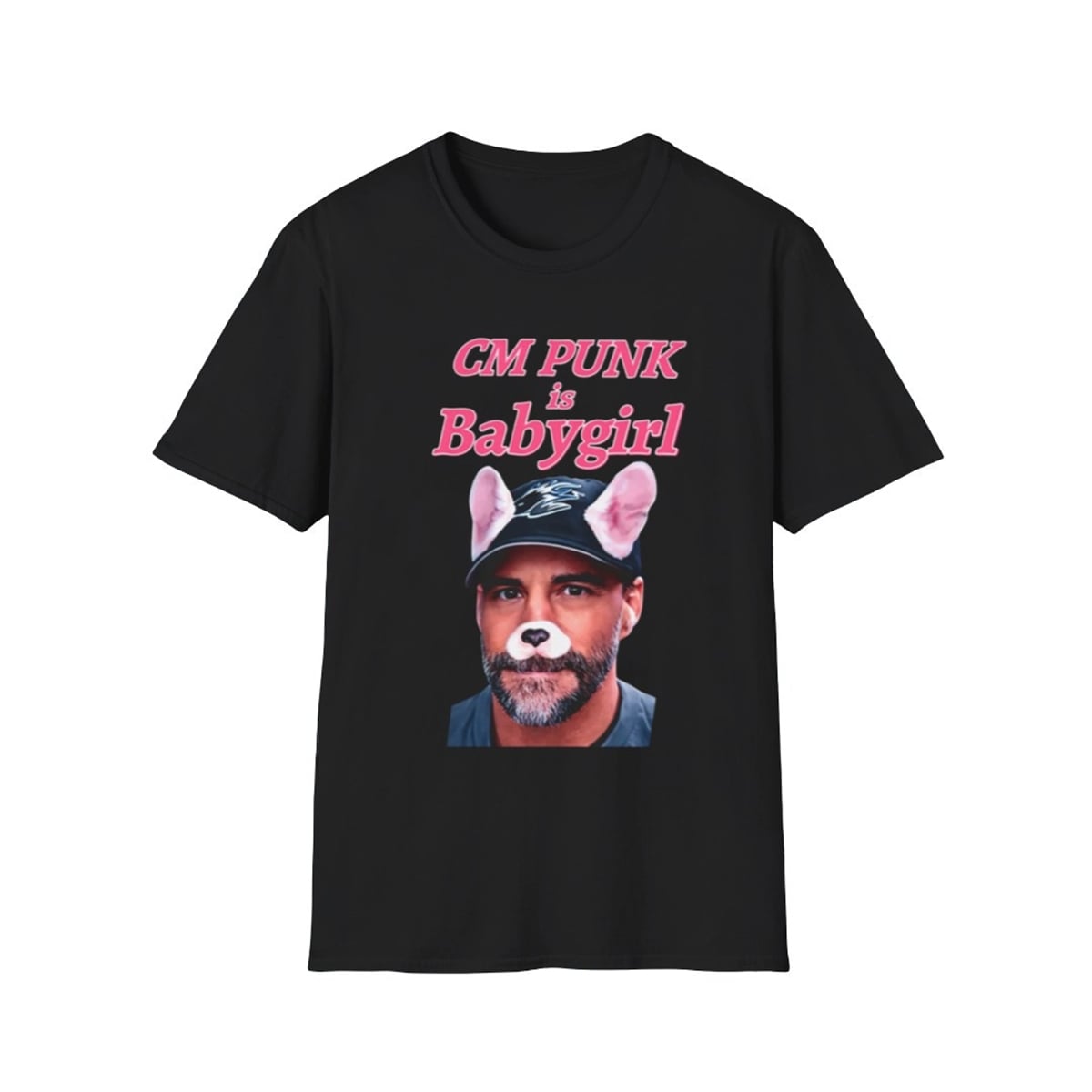 The design of the shirt relies entirely on the power of visual juxtaposition. The center of the garment features a closely cropped, deadpan photograph of CM Punk wearing a baseball cap. However, the image is hilariously altered using a classic social media dog filter, giving the legendary fighter digital puppy ears and a cute button nose. Arching above and below the portrait is the phrase “CM PUNK is Babygirl,” rendered in a bright, nostalgic pink font that mimics 2000s pop aesthetics.