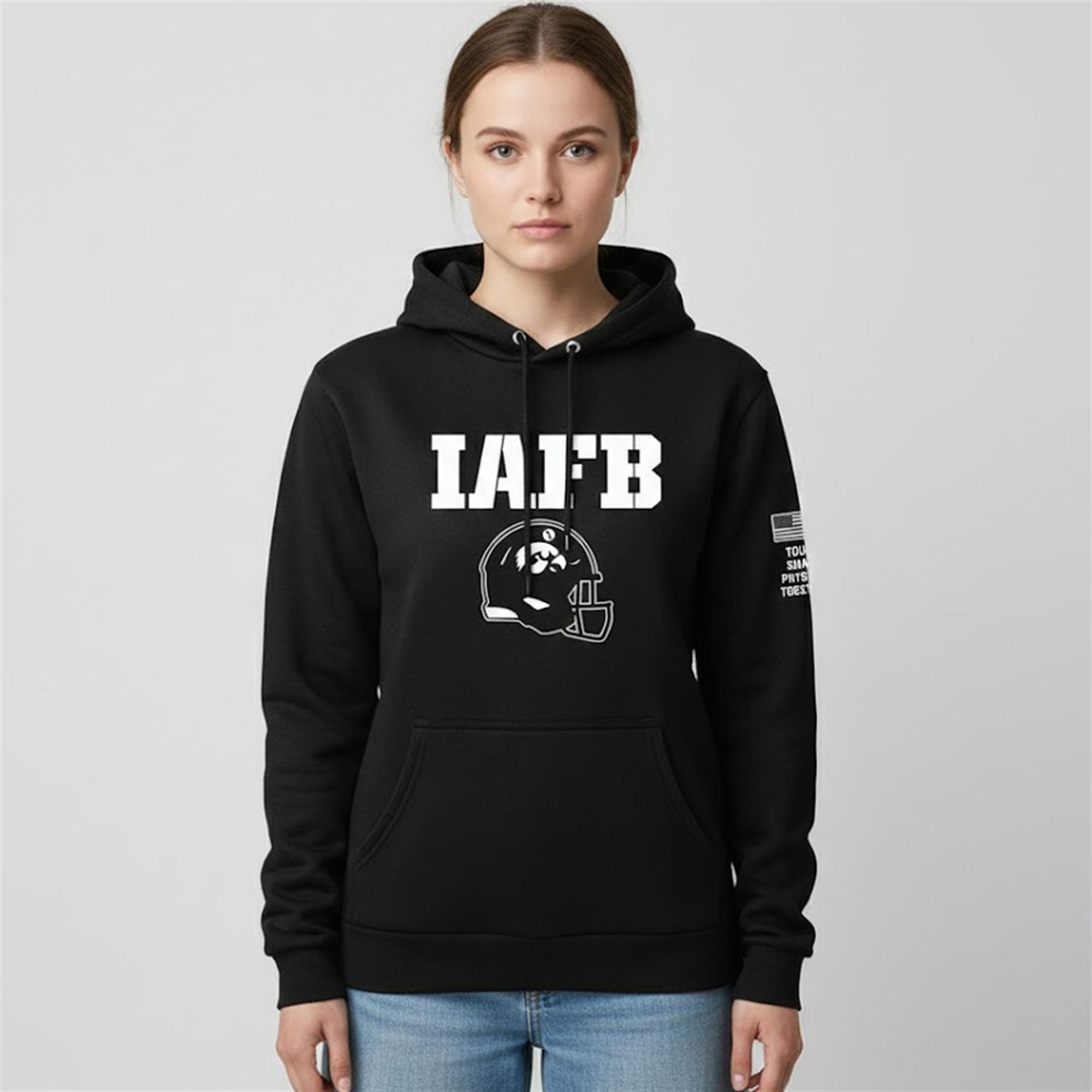 This isn’t just a hoodie; it’s a piece of the locker room brought to the streets. The hoodie is precision-crafted for the fan who appreciates the nuances of the game. The front features the bold “IAFB” text in a collegiate block font, centered above the iconic Hawkeye helmet logo.