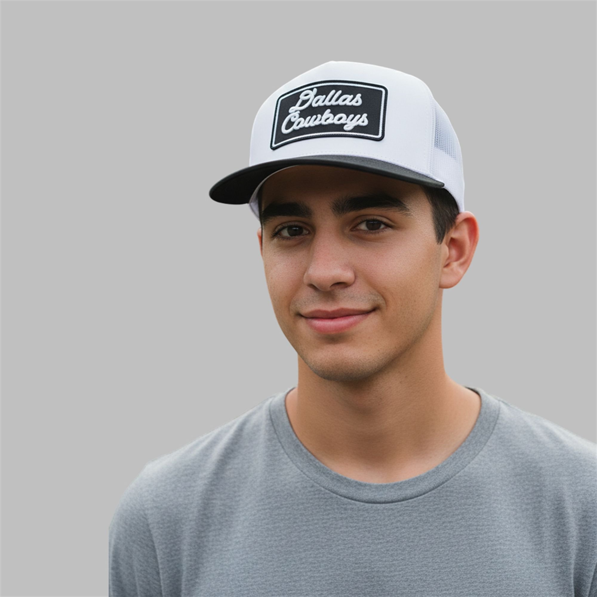 This hat perfectly captures the classic, no-nonsense aesthetic preferred by the pros. The design centers on a bold, rectangular patch meticulously with “Dallas Cowboys” in a timeless cursive script. This vintage-inspired logo offers a unique alternative to the iconic star, signaling a deeper level of fan dedication. The striking black-and-white color scheme ensures versatility, allowing it to pair seamlessly with your favorite jersey on game day or elevate your casual attire any day of the week. The structured front panel provides a clean, polished silhouette, while the breathable mesh back delivers on the classic trucker style that never fades.