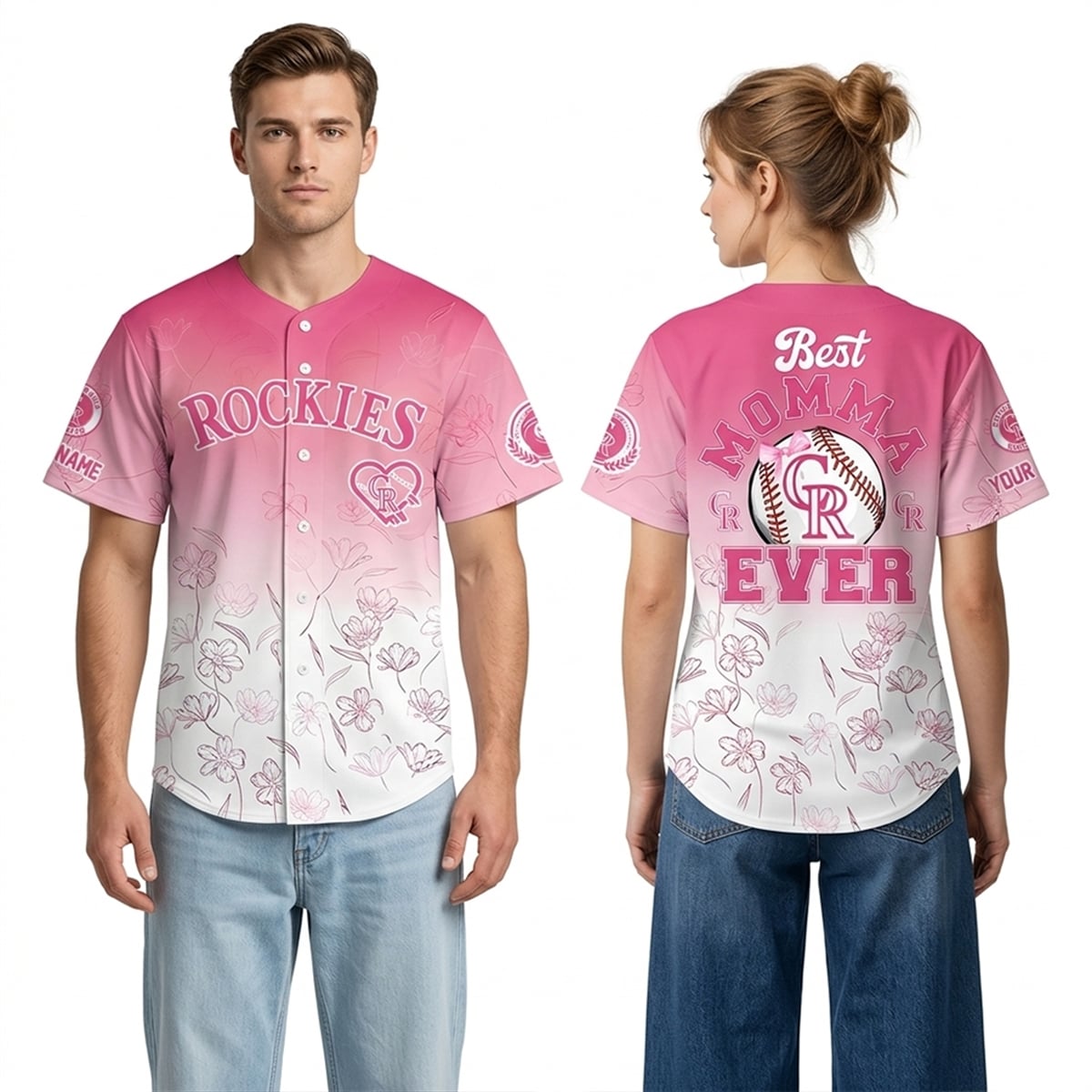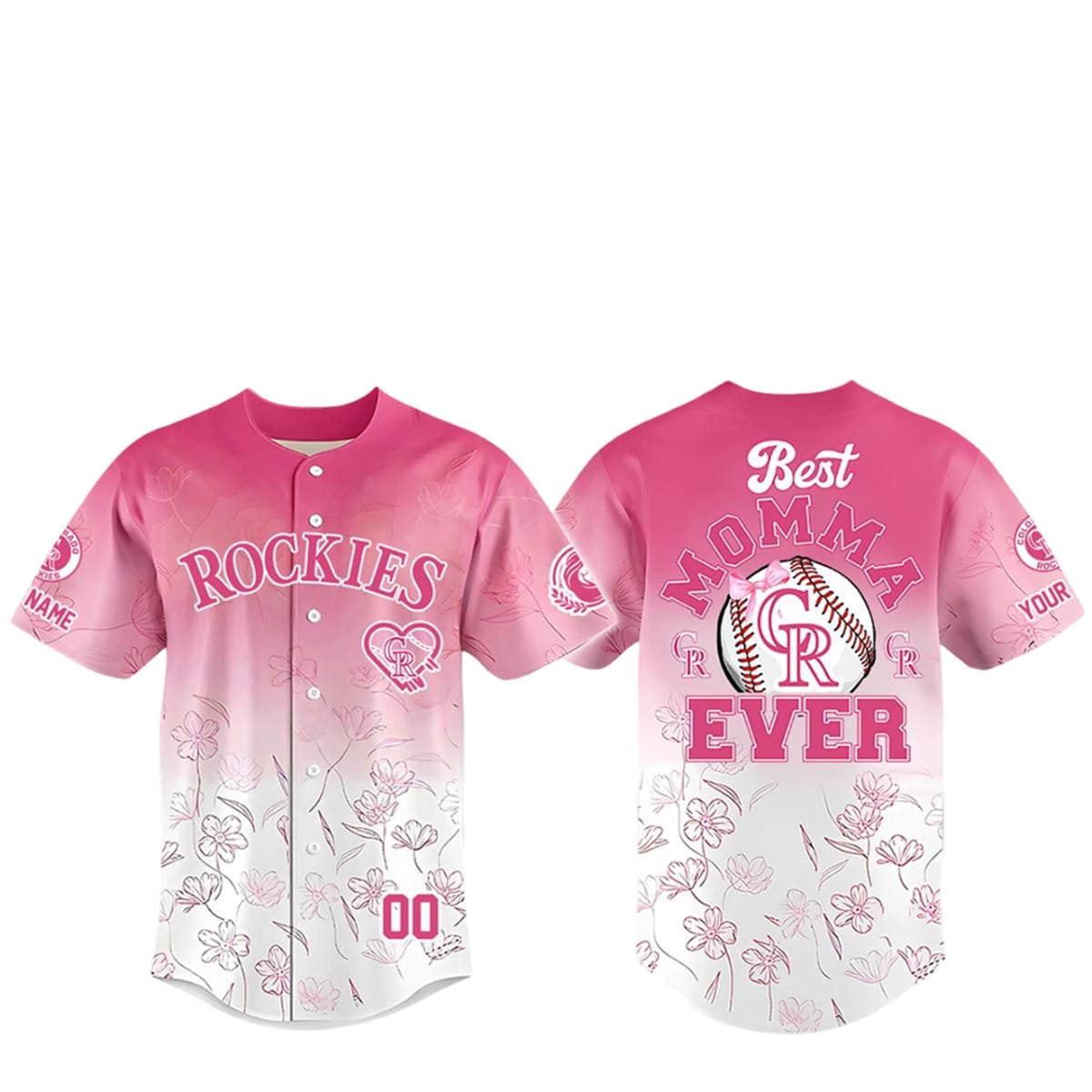 The jersey is a striking visual masterpiece that reimagines baseball fandom through a lens of maternal celebration. The aesthetic foundation of the jersey is a beautiful ombre effect, cascading from a vibrant, energetic pink at the shoulders down to a crisp, clean white at the hemline. Scattered elegantly across the lower half and sleeves are intricate, line-drawn floral motifs that evoke the feeling of a blooming spring day. The front of the jersey proudly displays the classic “ROCKIES” arched text, complemented by a specially stylized interlocking “CR” logo encased in a decorative heart. Turning to the back, the jersey reveals its true emotional core: the words “Best MOMMA EVER” prominently arched around a beautifully illustrated baseball, which is adorned with a delicate pink bow and the signature Rockies logo.