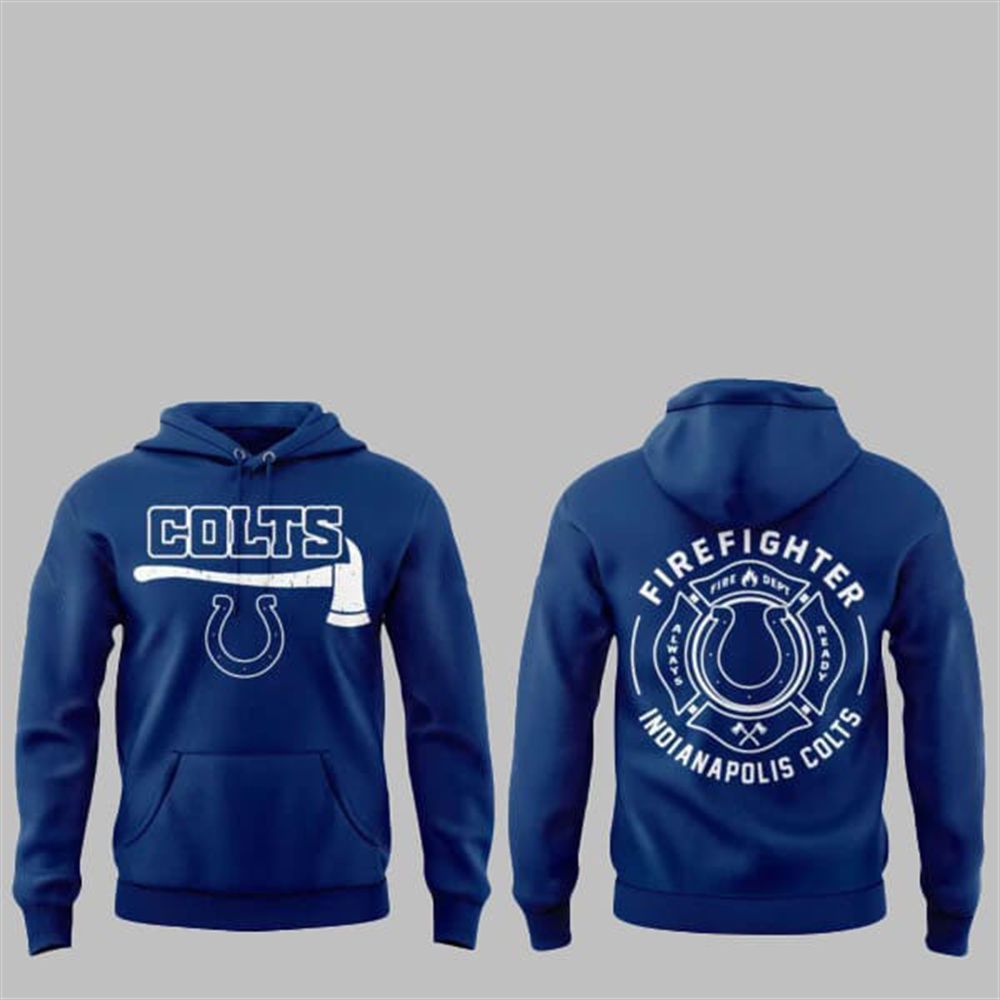 This shirt masterfully blends the iconic imagery of the Indianapolis Colts with the revered symbols of firefighting. The front of this vibrant, Colts-blue shirt features the team name “COLTS” in bold, athletic lettering, with the legendary horseshoe logo creatively integrated with a firefighter’s axe. This powerful graphic immediately communicates a dual allegiance to team and community service. The back is where the tribute truly shines, showcasing a meticulously designed crest reminiscent of a traditional fire department emblem. Encircled by the words “Firefighter” and “Indianapolis Colts,” the design features the Colts’ horseshoe at its core, flanked by crossed axes, symbolizing strength and readiness. It’s a sophisticated and meaningful design that pays respect to both organizations with honor.