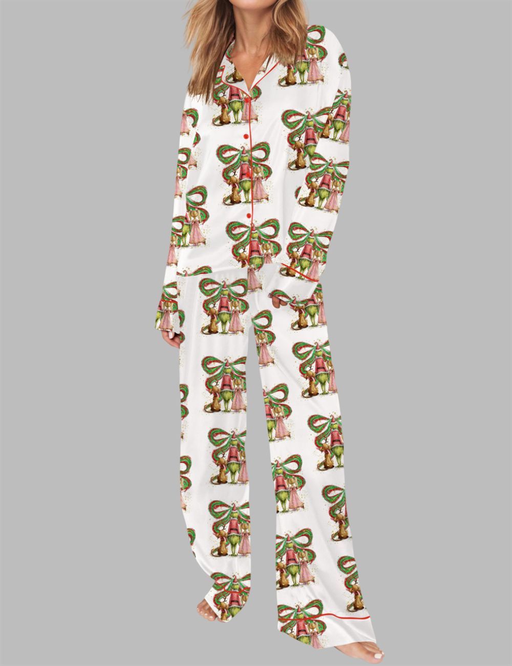 The all-over print features the iconic Grnch, his loyal companion Max, and a sweet Cindy Lou Who, all artfully intertwined with oversized, whimsical green bows that define the coquette trend. It’s a delightful paradox—the world’s most famous holiday cynic wrapped in the romanticism of ribbons and grace. This pajama set isn’t just for sleeping; it’s a statement piece for celebrating the most wonderful time of the year in unparalleled style and comfort. Perfect for festive movie marathons, unwrapping presents on Christmas morning, or capturing picture-perfect holiday moments, this set ensures you feel chic, comfortable, and full of Christmas spirit.