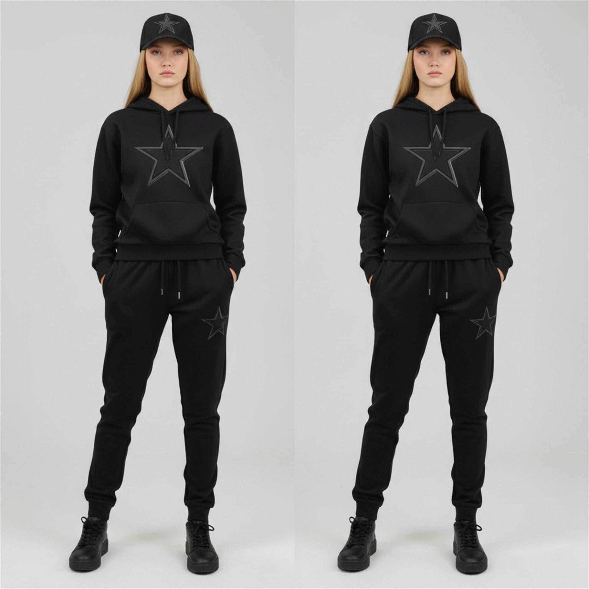 Complementing the top is a pair of matching black joggers. These aren’t your average sweatpants; they feature a tapered, athletic fit with the Star logo situated prominently on the thigh. Completing the trinity is a structured baseball cap, perfectly color-matched to tie the entire silhouette together. This is a cohesive outfit that takes the guesswork out of game-day dressing.