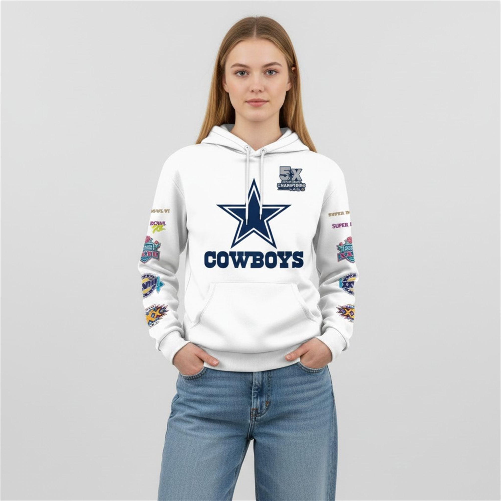 This throwback-inspired hoodie is a visual homage to the Dallas Cowboys‘ path to greatness. The design is centered around the celebration of success, featuring the iconic “5X Champions” text prominently on the chest and back. The crisp white background provides a sharp contrast to the navy and silver graphics, ensuring the team colors stand out vividly.
