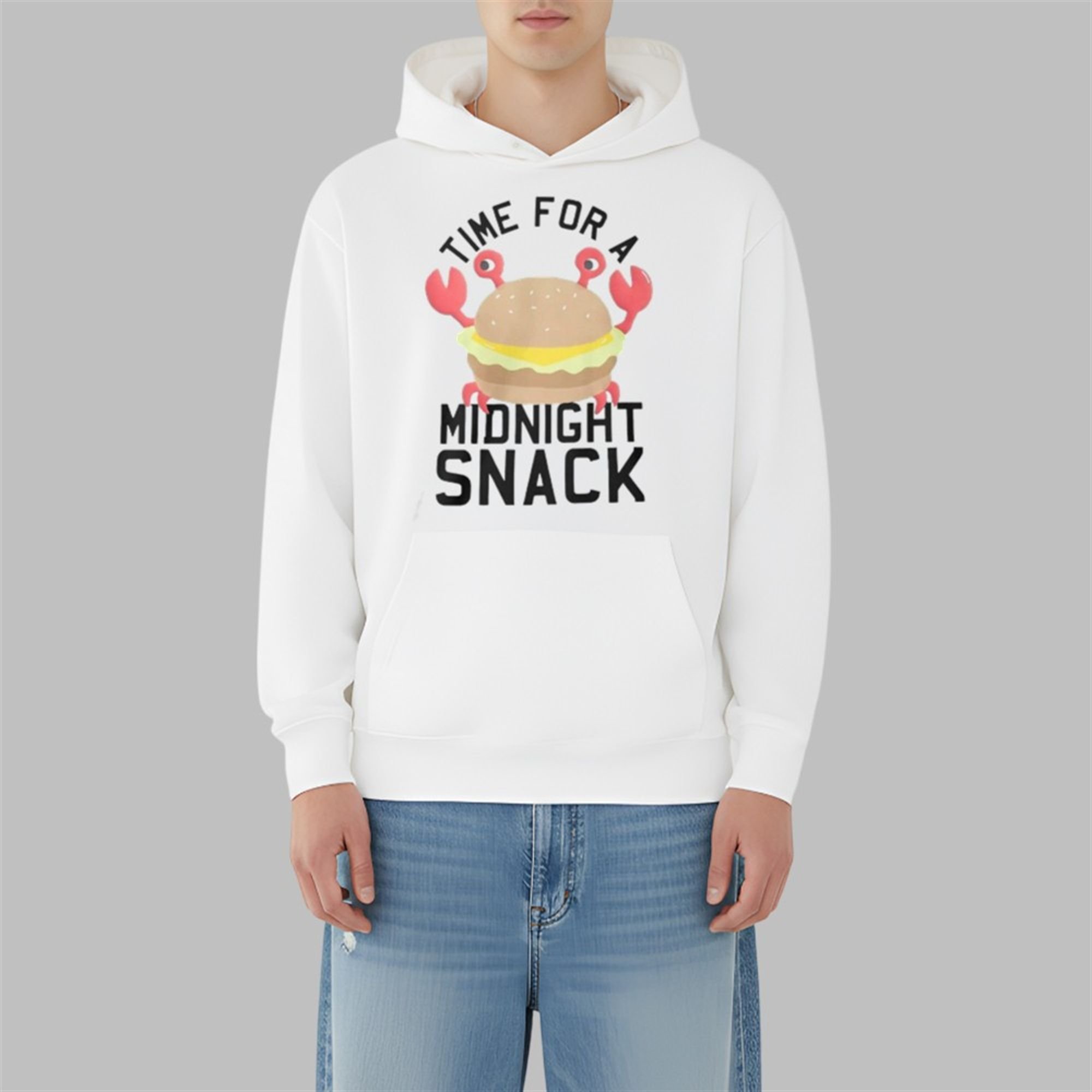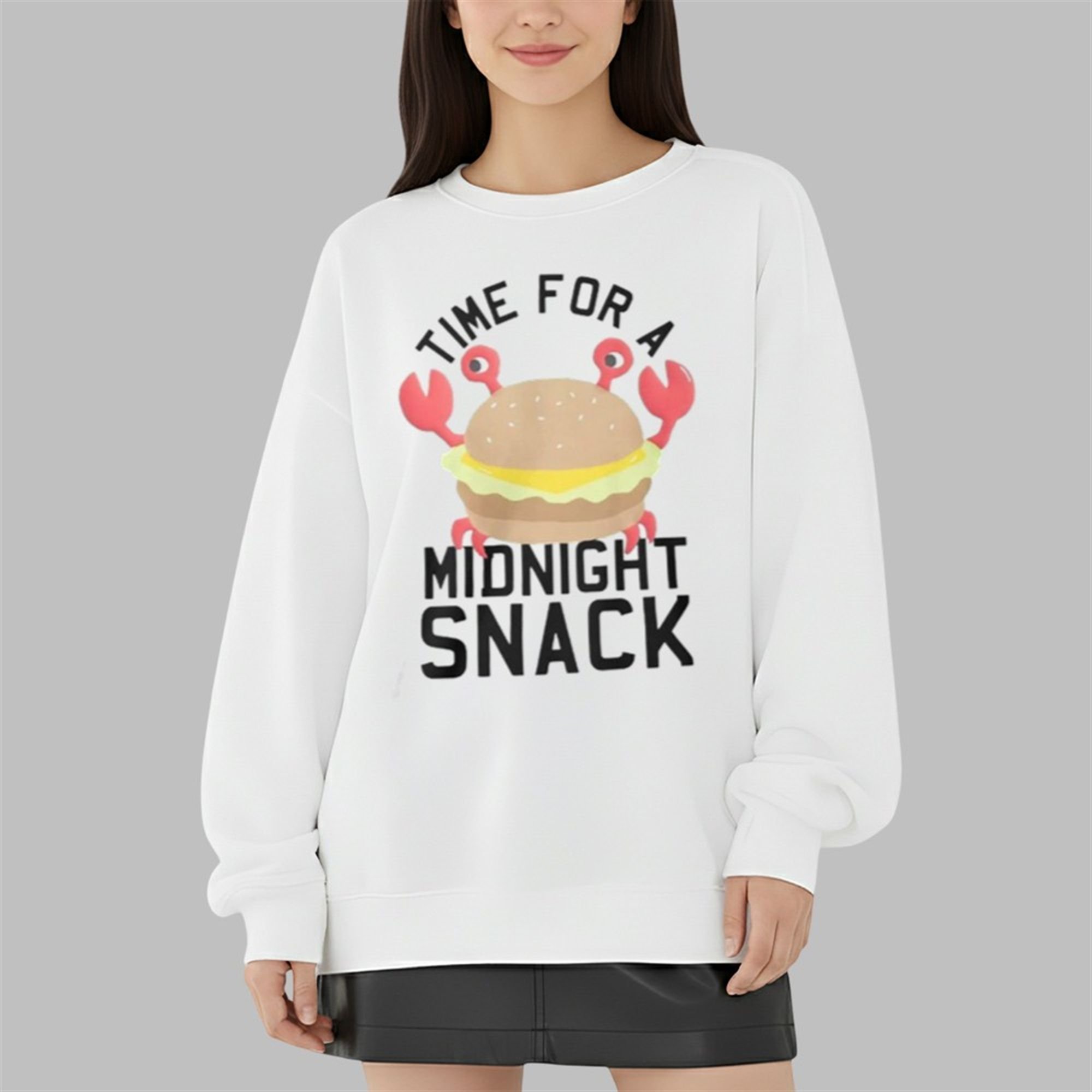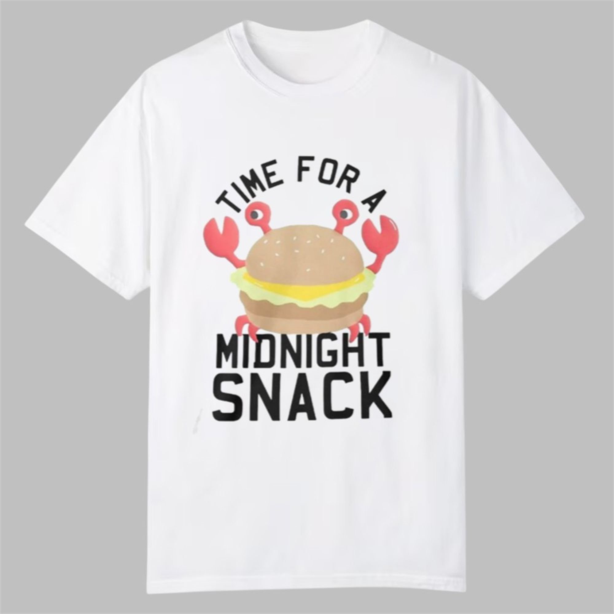 This shirt perfectly captures that “snack attack” mood with its bold, playful design. Front and center, a determined cartoon crab—a true crustacean connoisseur—brandishes a juicy cheeseburger, ready to dig in. The text, “TIME FOR A MIDNIGHT SNACK,” is emblazoned in a fun, assertive font that leaves no room for doubt. It’s a statement. It’s a lifestyle. It’s a declaration that, yes, the best time for a burger is, in fact, whenever you decide it is.