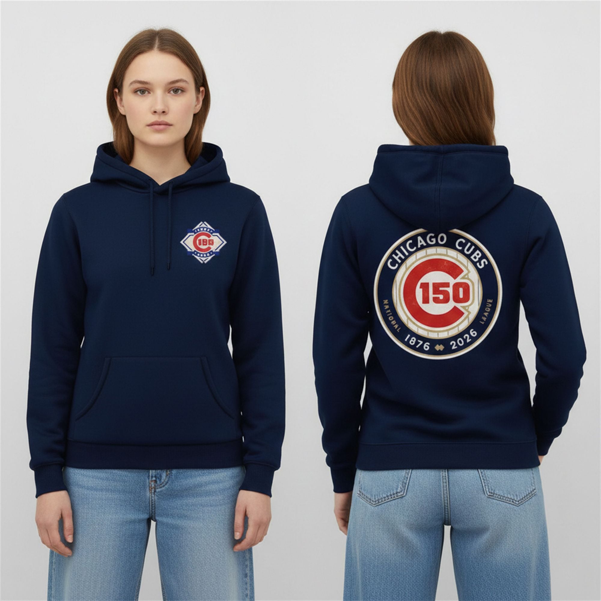 On the front, a subtle yet striking diamond crest rests over the heart, featuring the commemorative “150” type set within the classic Cubs color palette. This understated front design allows for versatility in daily wear, suitable for casual Fridays or a night out in the Windy City. The back of the hoodie unveils the showstopper: a massive, vintage-inspired circular emblem. This grand graphic anchors the famous Cubs “C” logo with the years “1876” and “2026,” encircled by a gold-tone rim that signifies the golden standard of the franchise. It is a bold statement piece that acts as a beacon for fellow fans.