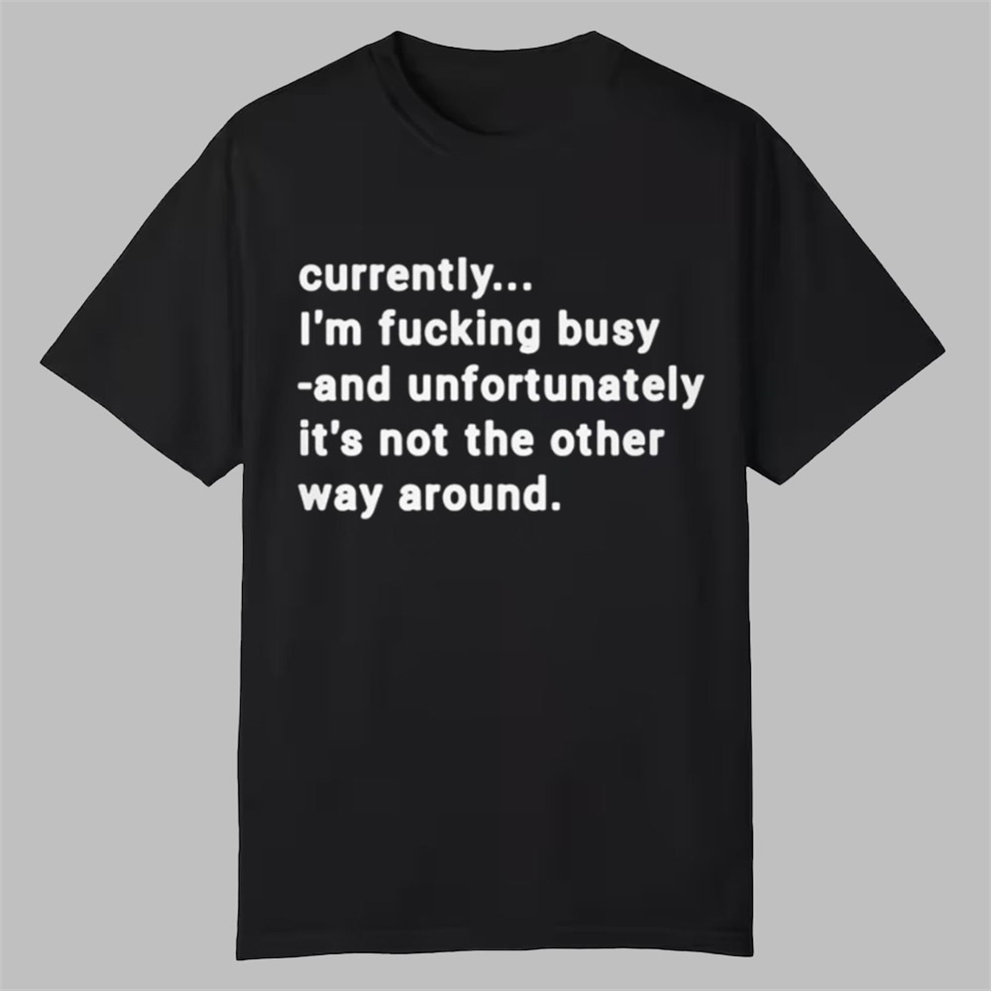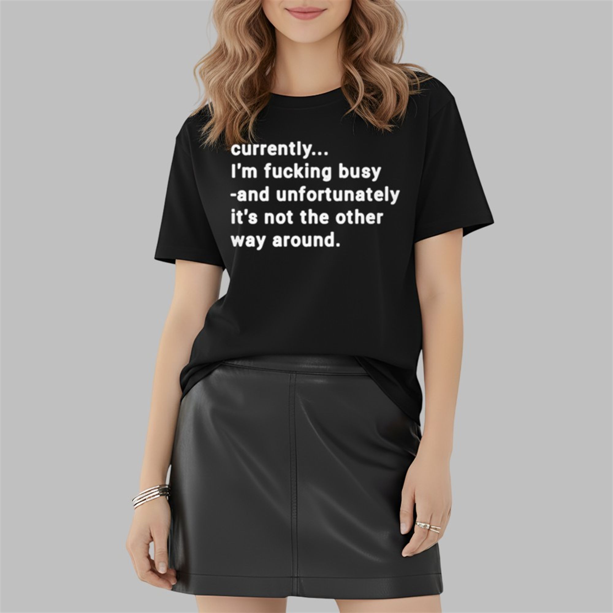 The tee is designed for the bold, the sarcastic, and the brutally honest. Visually, the shirt features a sleek, minimalist aesthetic—crisp white sans-serif typography set against a deep black background. But the real power lies in the message: “currently… I’m fcking busy -and unfortunately it’s not the other way around.”*