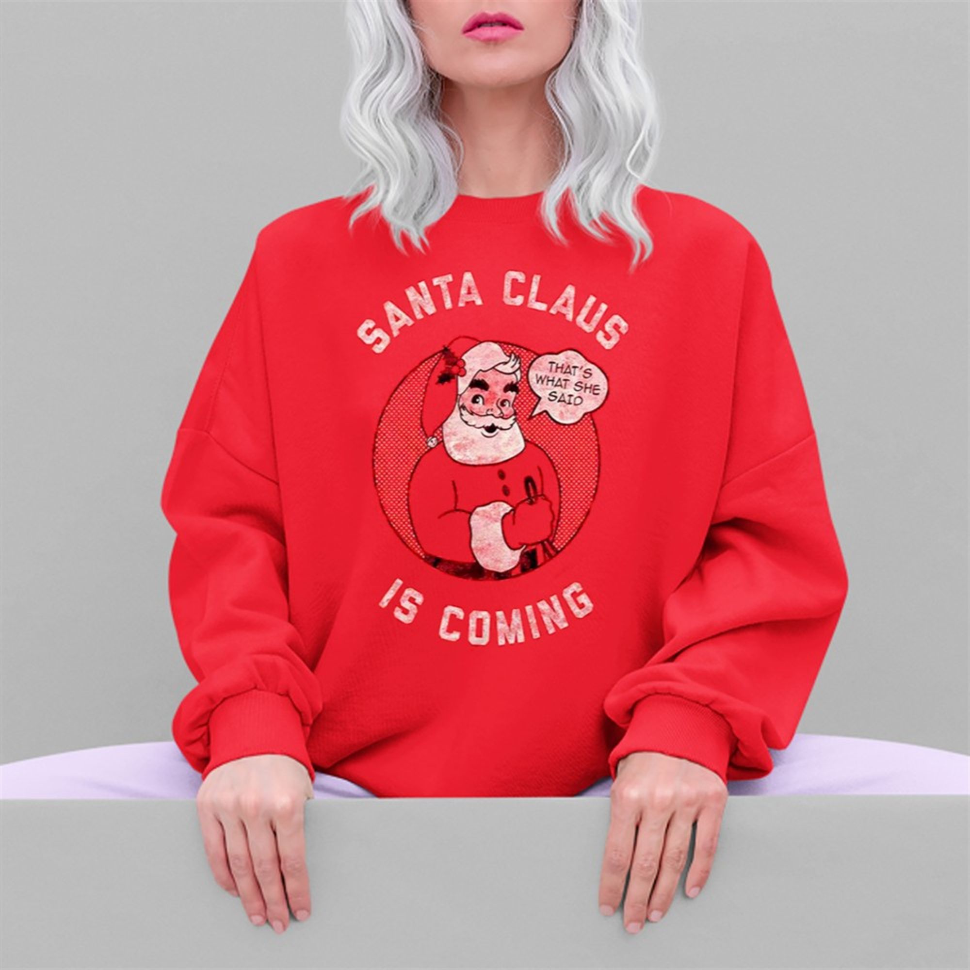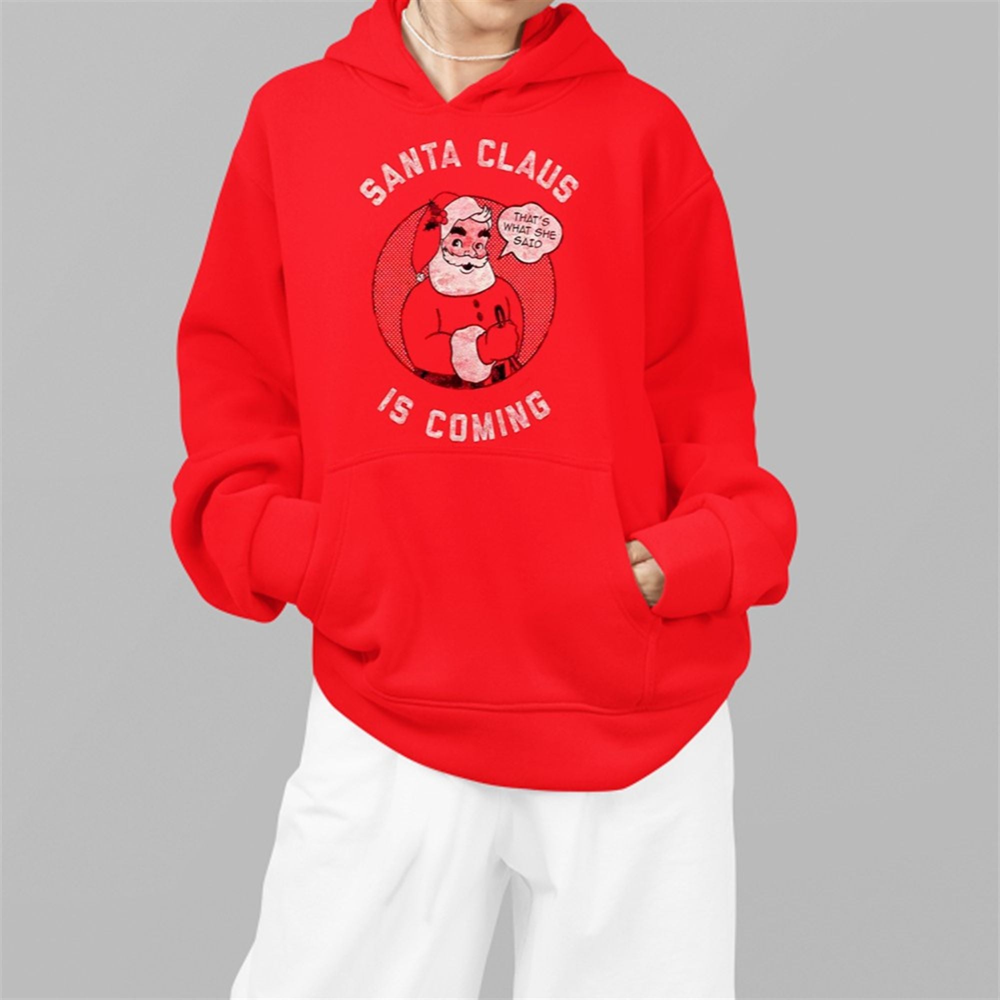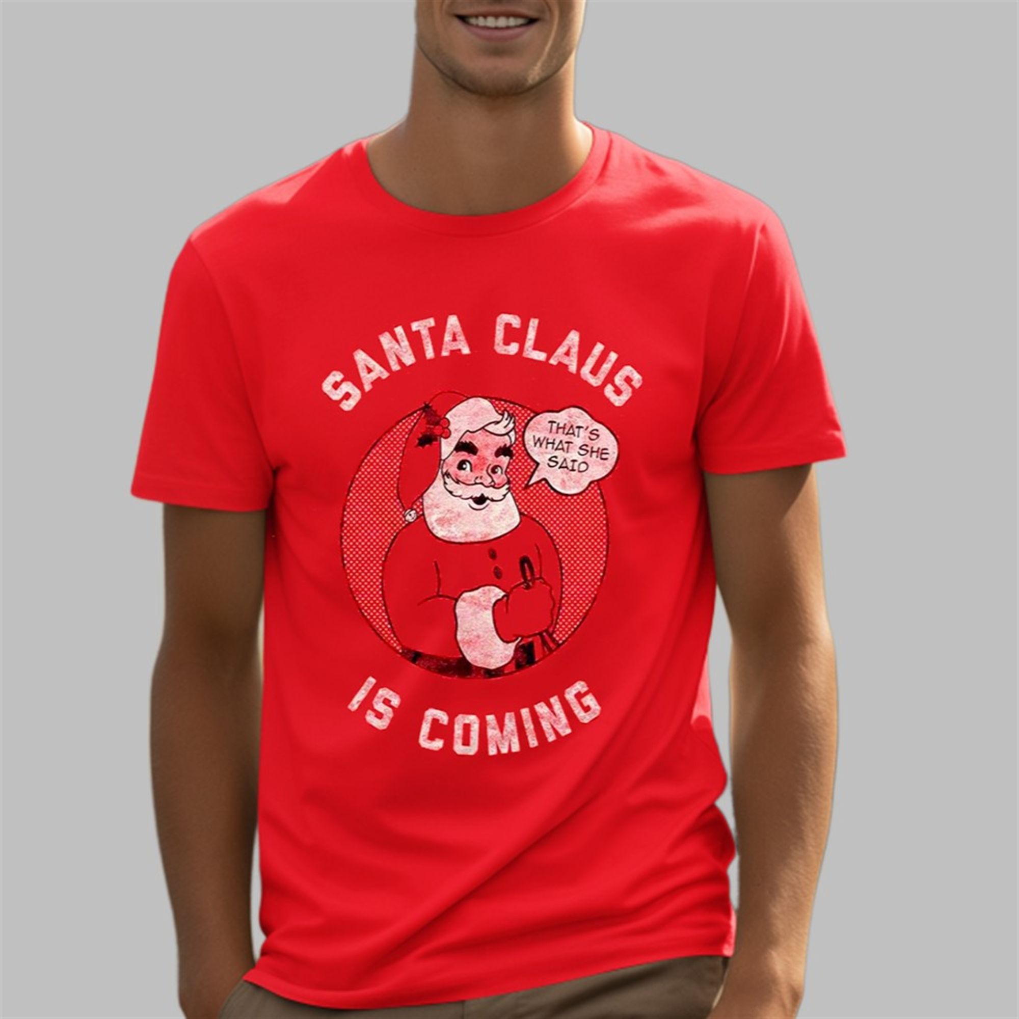This isn’t just a t-shirt; it’s a conversation piece. The design features a retro-inspired, distressed graphic of Santa Claus set against a classic red background. The text reads “SANTA CLAUS IS COMING” in a vintage font, but the punchline lands with a speech bubble from St. Nick himself: “THAT’S WHAT SHE SAID.” It’s a hilarious twist on a classic carol that doubles as a nod to one of the most iconic jokes in modern sitcom history.