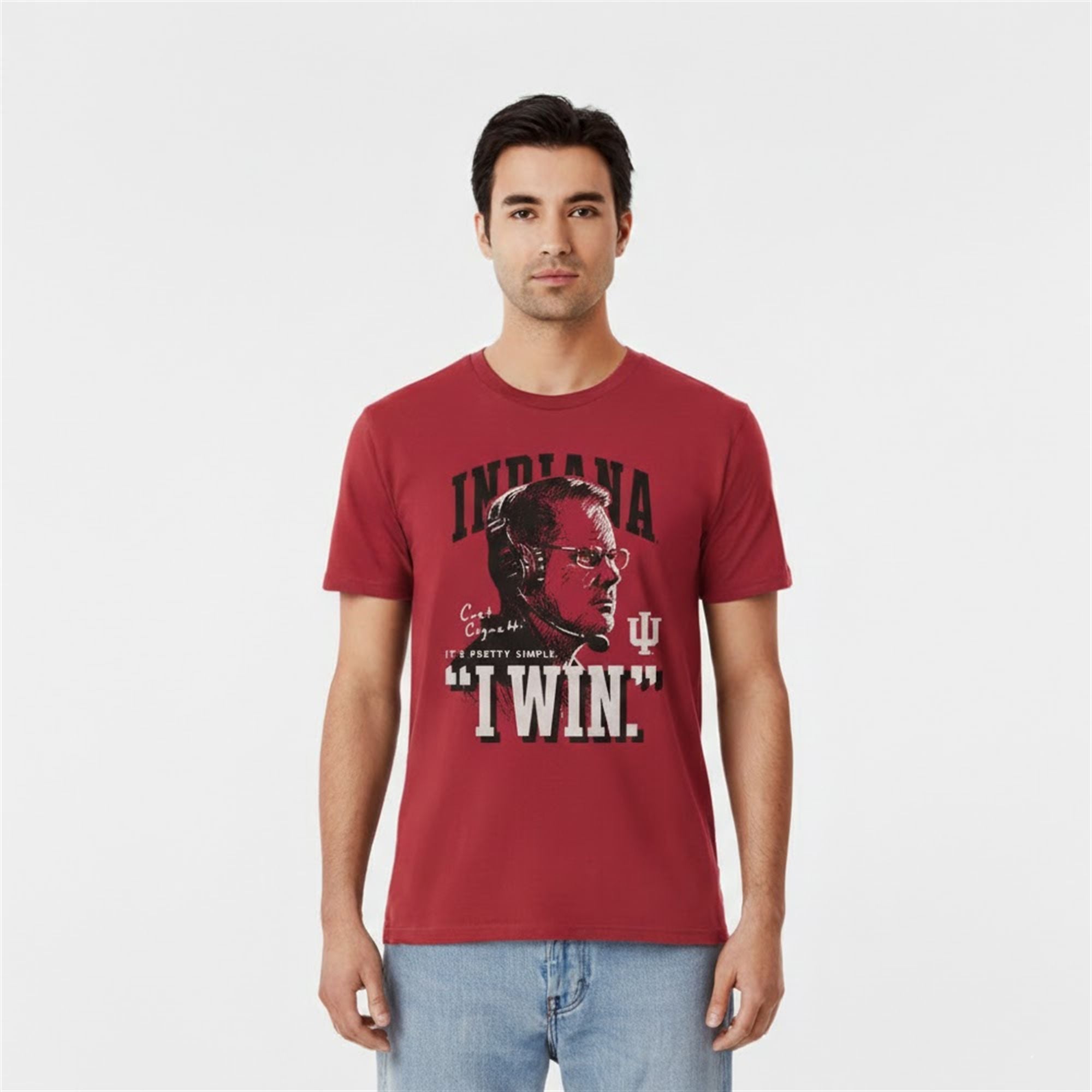 The Indiana Hoosiers have entered a new chapter, defined not by hope, but by expectation. This product captures the essence of that cultural shift. At the center of the design is Head Coach Curt Cignetti, rendered in a gritty, high-contrast graphic style that commands attention. Below his determined profile sits the phrase that shook up the Big Ten: “It’s Pretty Simple… I WIN.”
