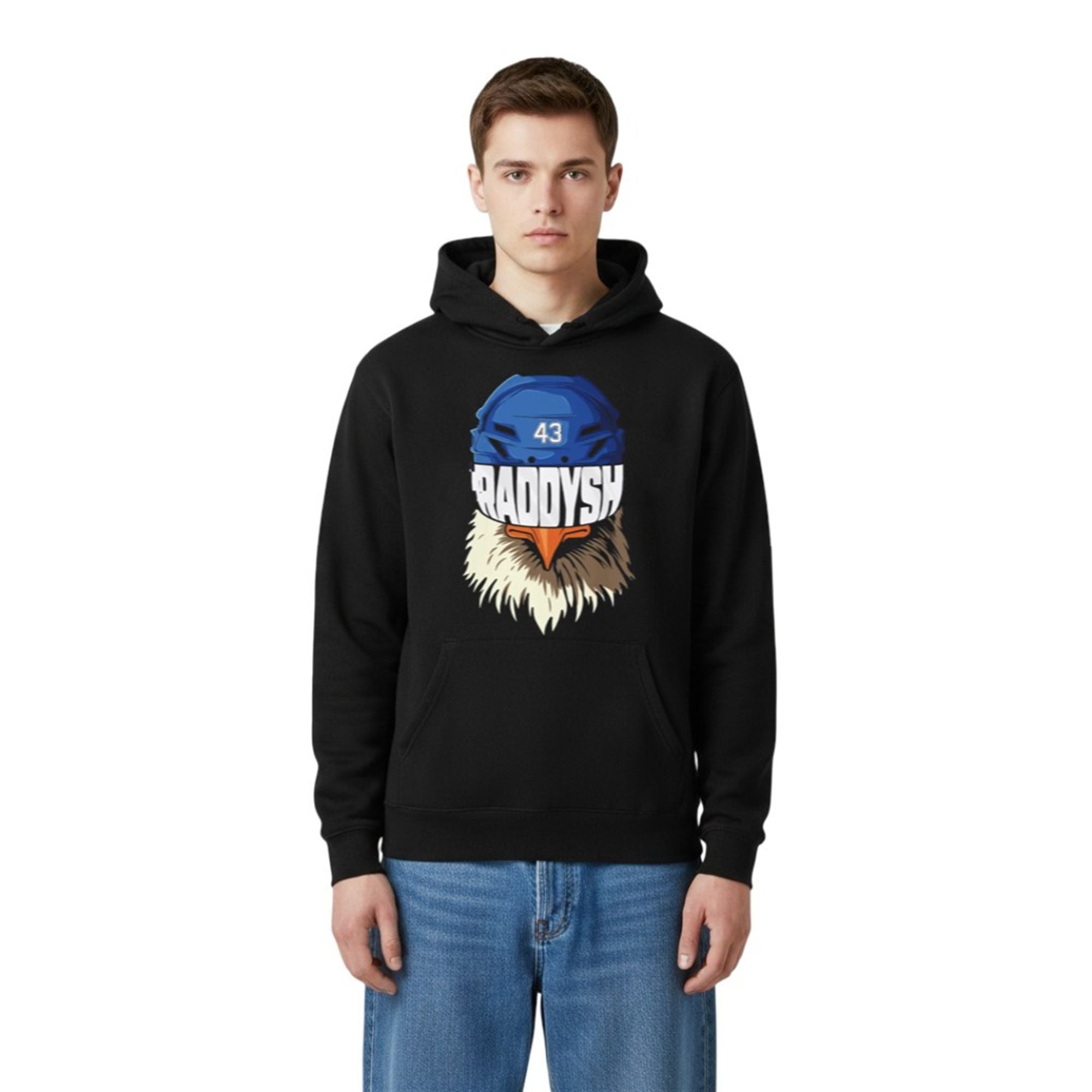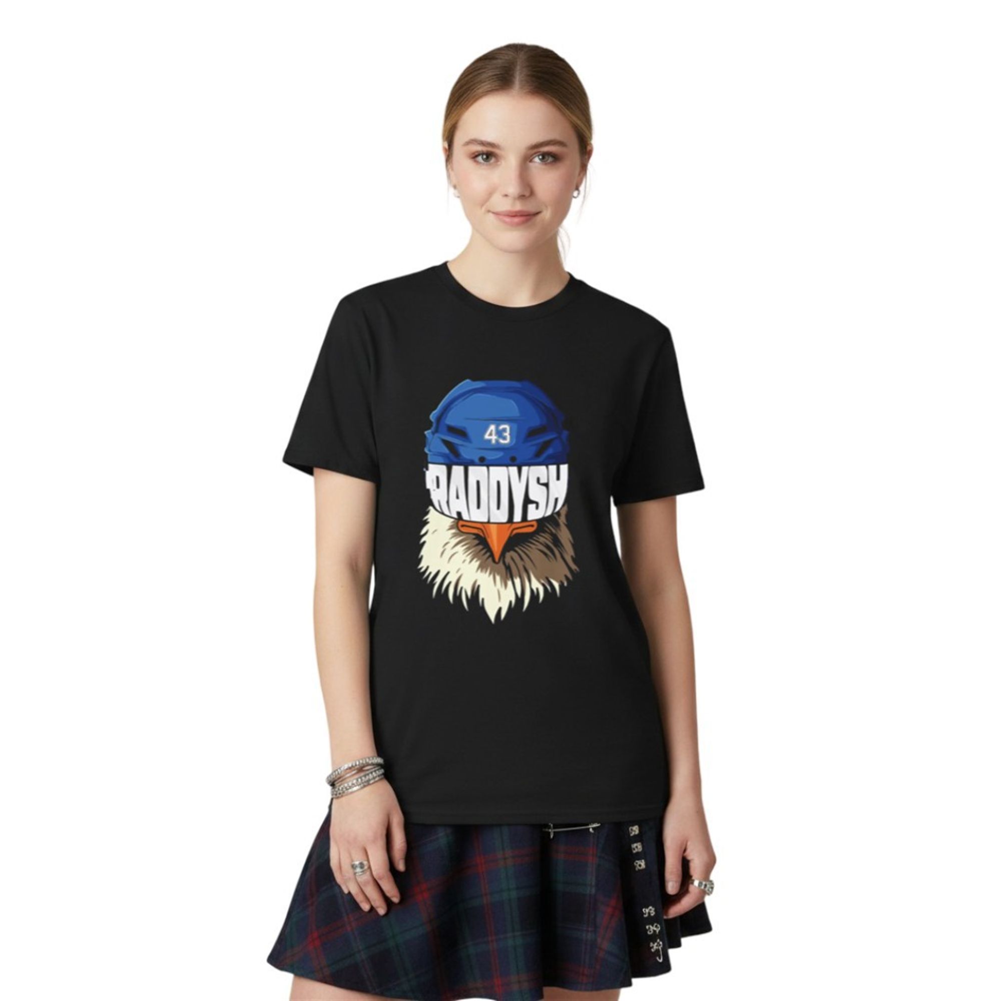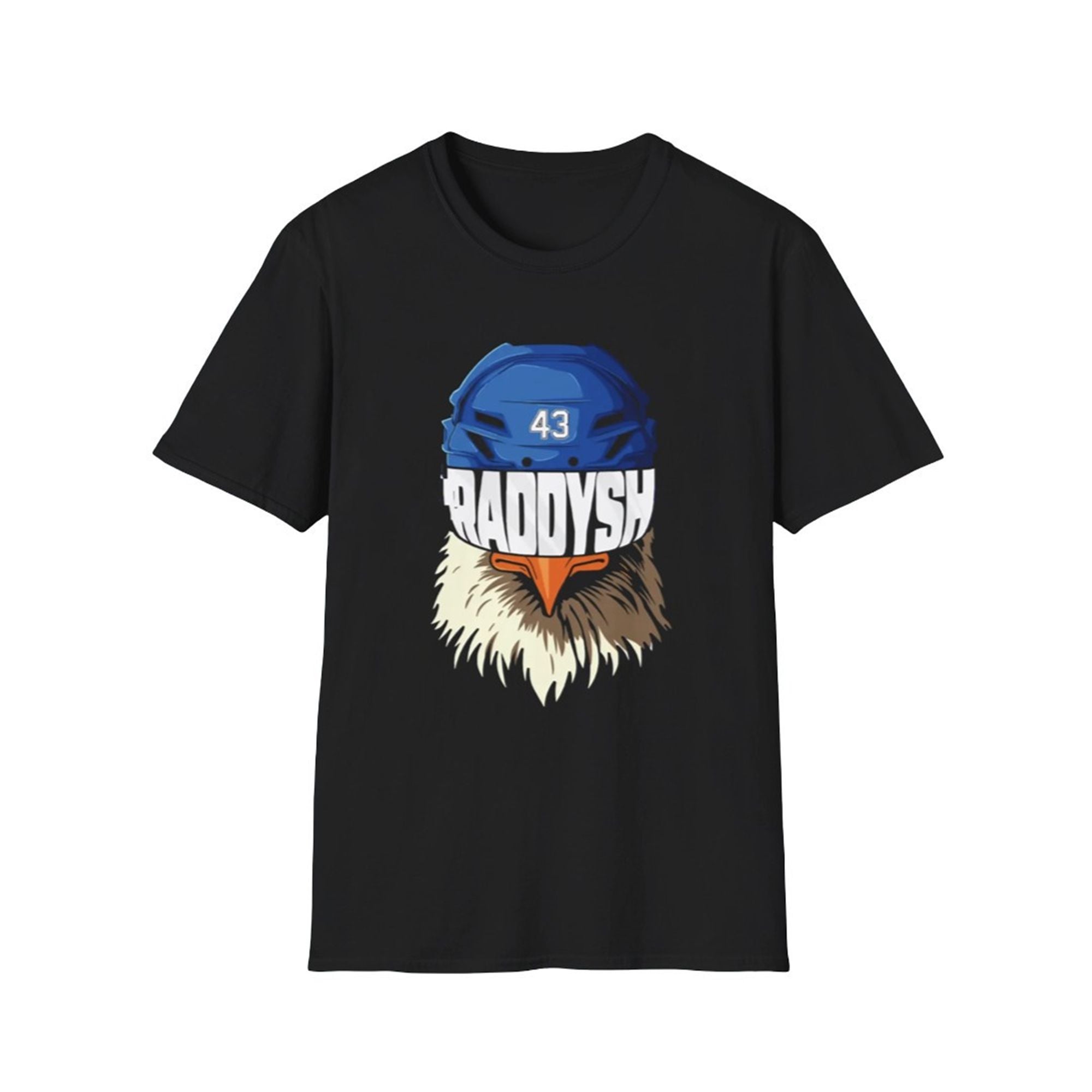 The shirt represents a bold evolution in how fans celebrate their favorite athletes. At the center of the design is a fiercely expressionistic bald eagle, crowned with a recognizable blue hockey helmet bearing the prominent number 43. The visual ingenuity peaks with the word “RADDYSH” seamlessly serving as the protective visor over the eagle’s eyes.