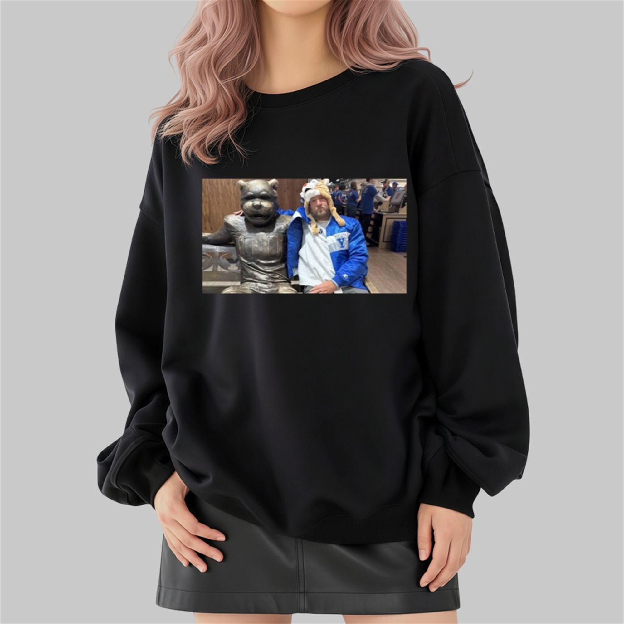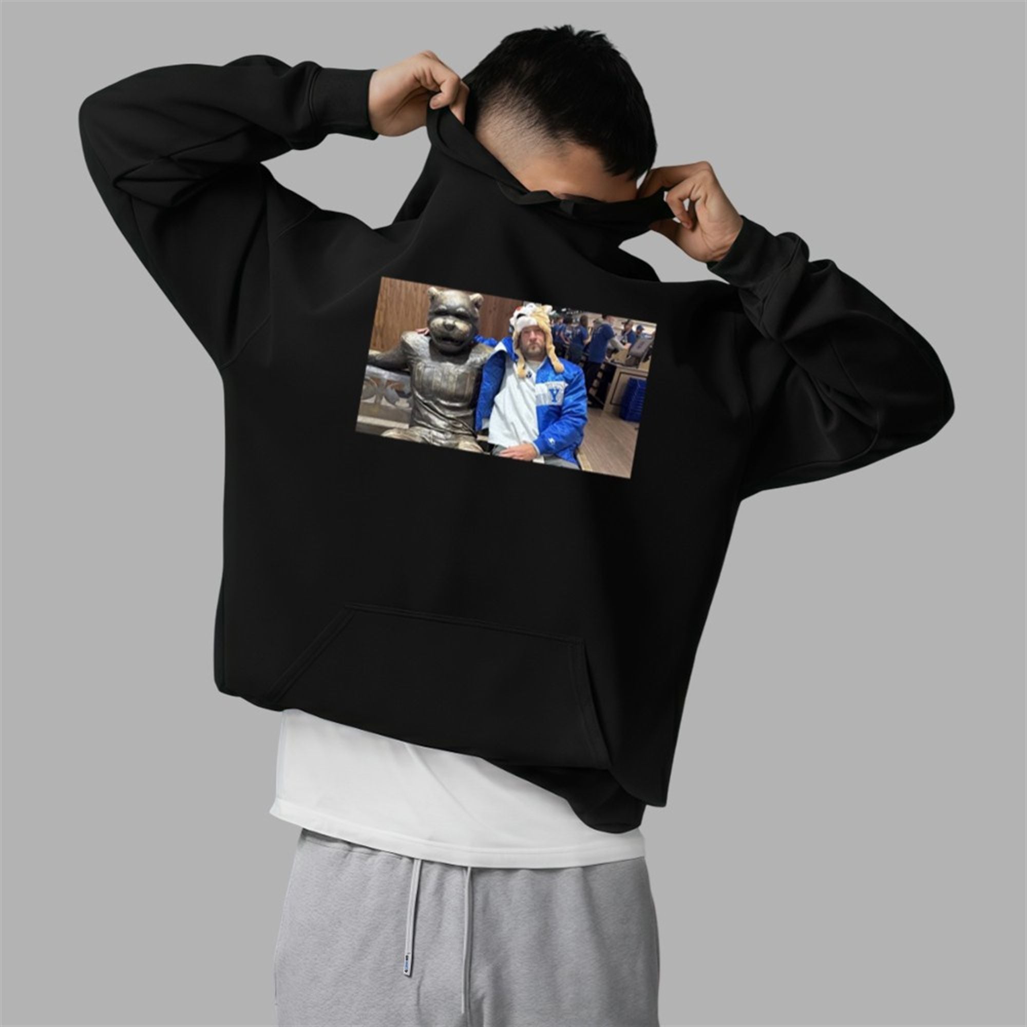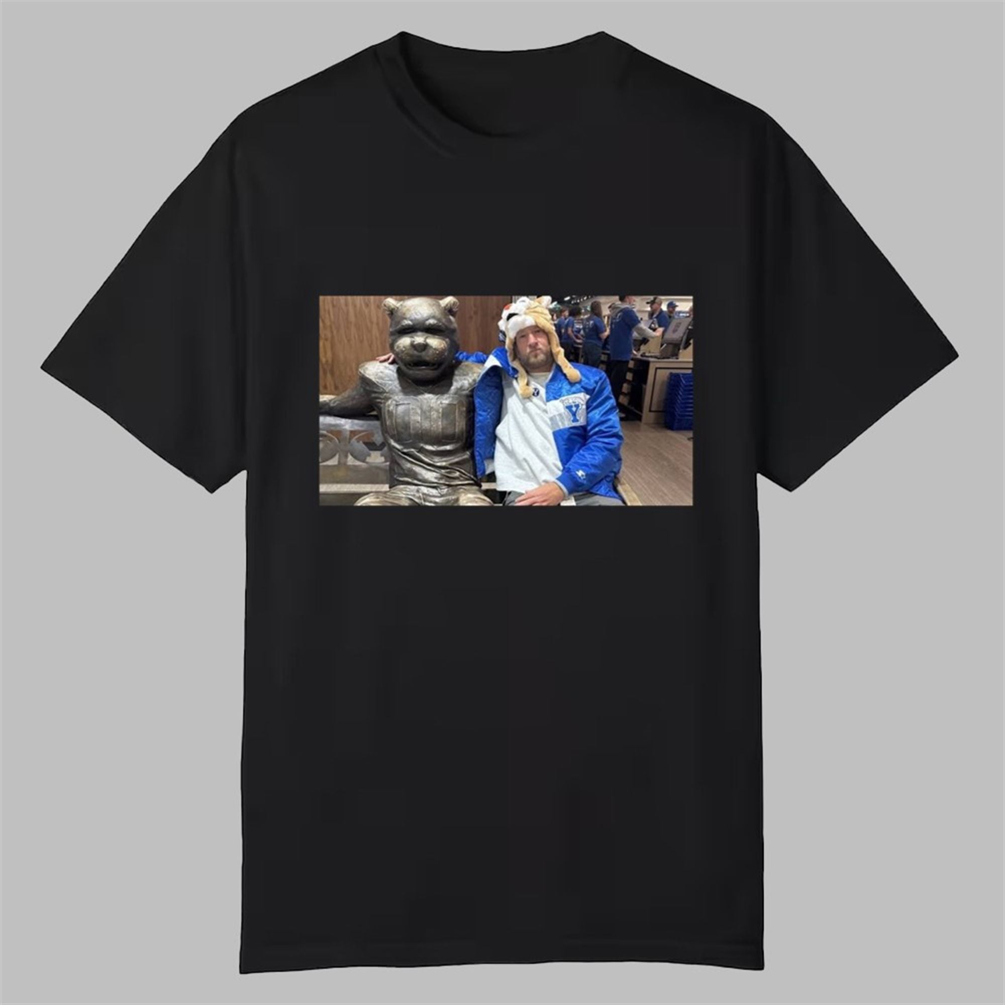The contrast is what makes this shirt a masterpiece: Cosmo’s statue is frozen in an eternal, welcoming grin, while Portnoy sits with his signature serious demeanor, ironically accessorized with a fuzzy “Cosmo” hat and retro BYU windbreaker. It is a visual representation of “game respects game.”