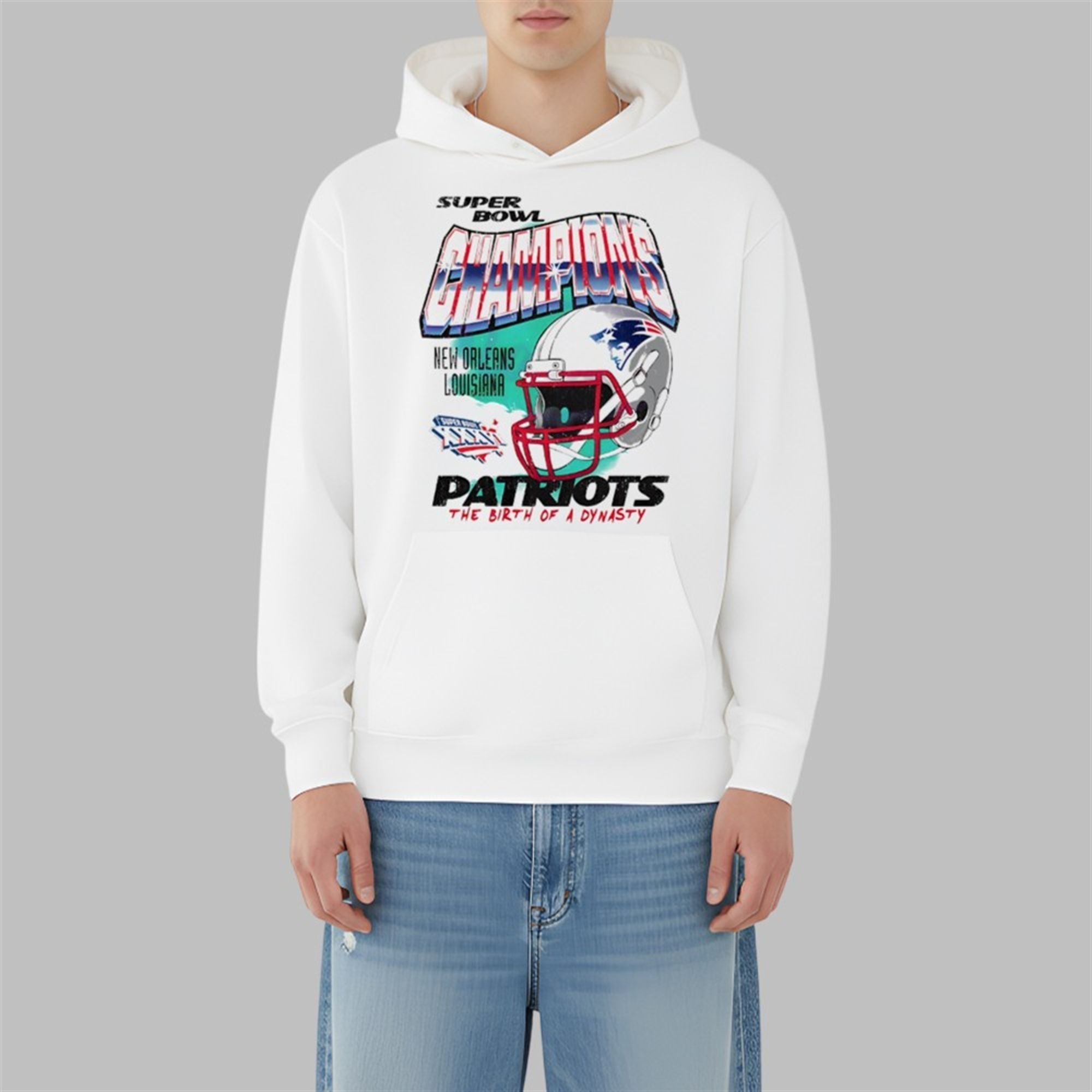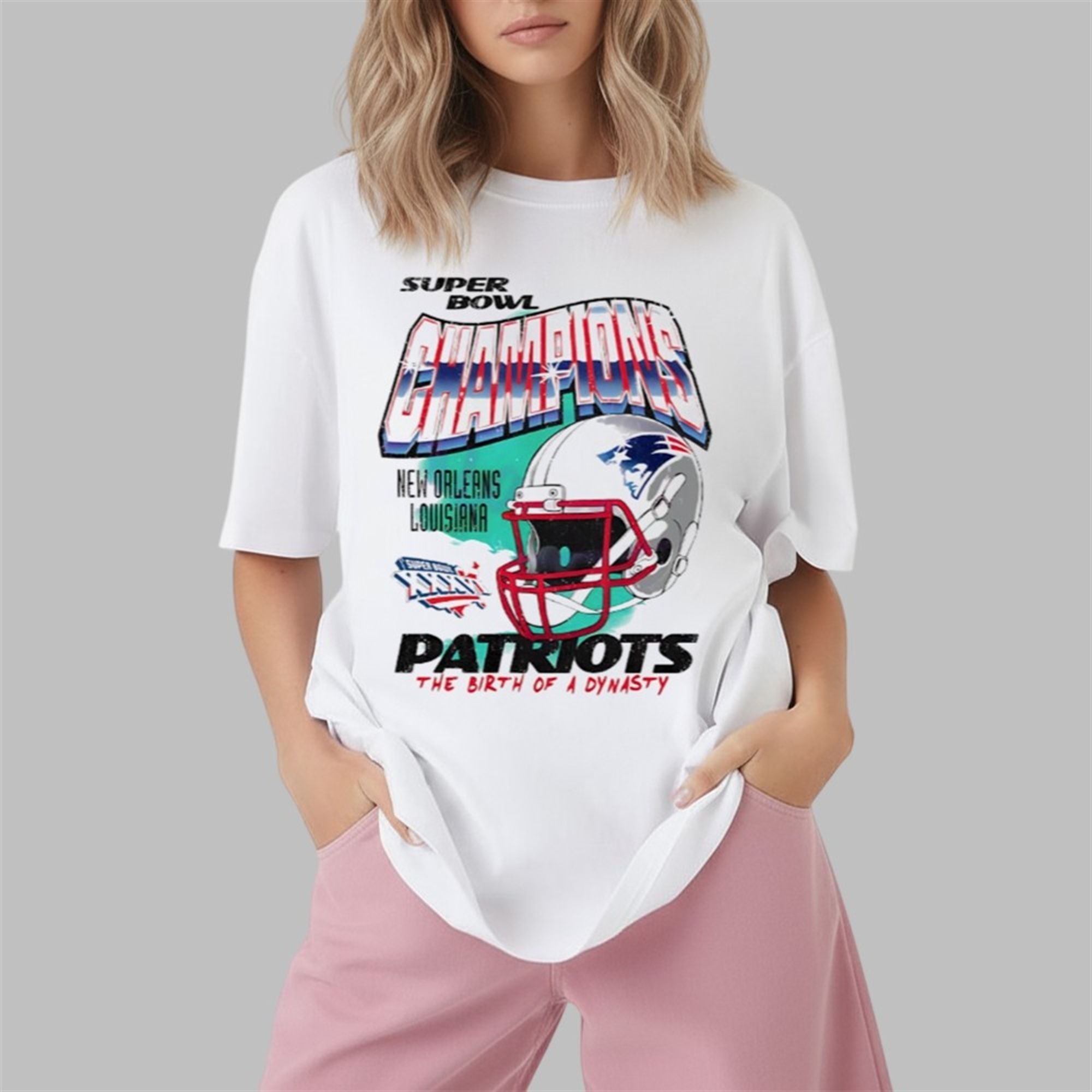 The design is a meticulous, retro-inspired masterpiece. It features the iconic “Flying Elvis” Patriots helmet, bold, metallic-style “CHAMPIONS” lettering, and the crucial details: “Super Bowl,” “New Orleans Louisiana,” and the prophetic phrase that defined an era: “The Birth of a Dynasty.” It’s a snapshot of history, capturing the raw emotion and underdog spirit of the 2001-2002 team that set the standard for two decades of dominance.