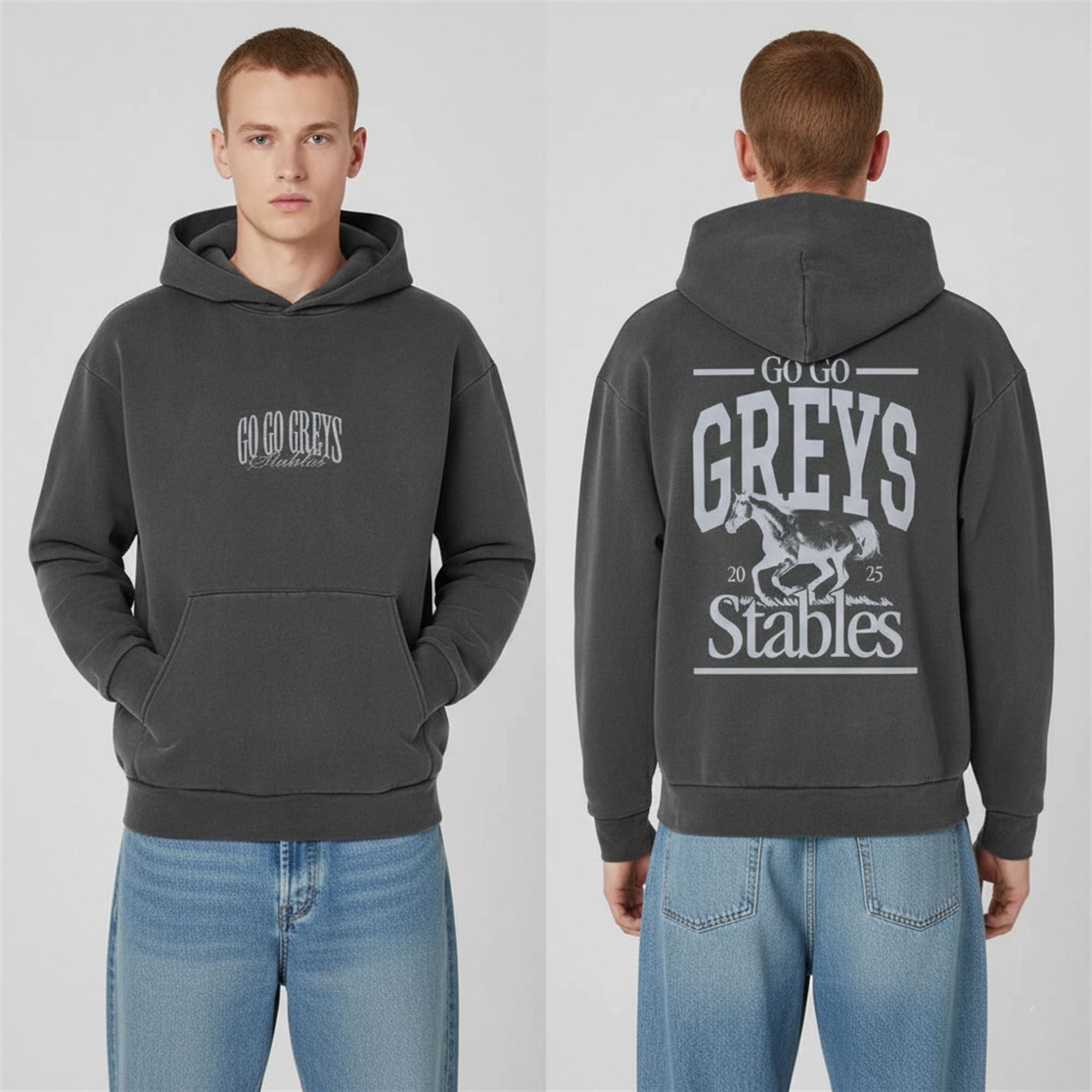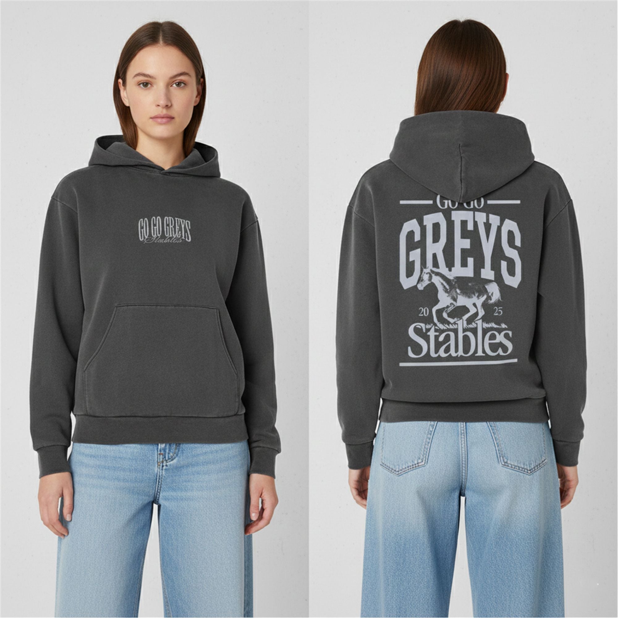 Constructed with a relaxed, oversized fit that mirrors modern streetwear trends, the hoodie features a “mineral wash” or “vintage charcoal” finish, giving it a broken-in, feel right out of the package. The front chest displays a subtle, classy “Go Go Greys Stables” text logo, while the back boasts a massive, high-impact graphic featuring a galloping grey horse, flanked by the “2025” season year and the bold “STABLES” designation.