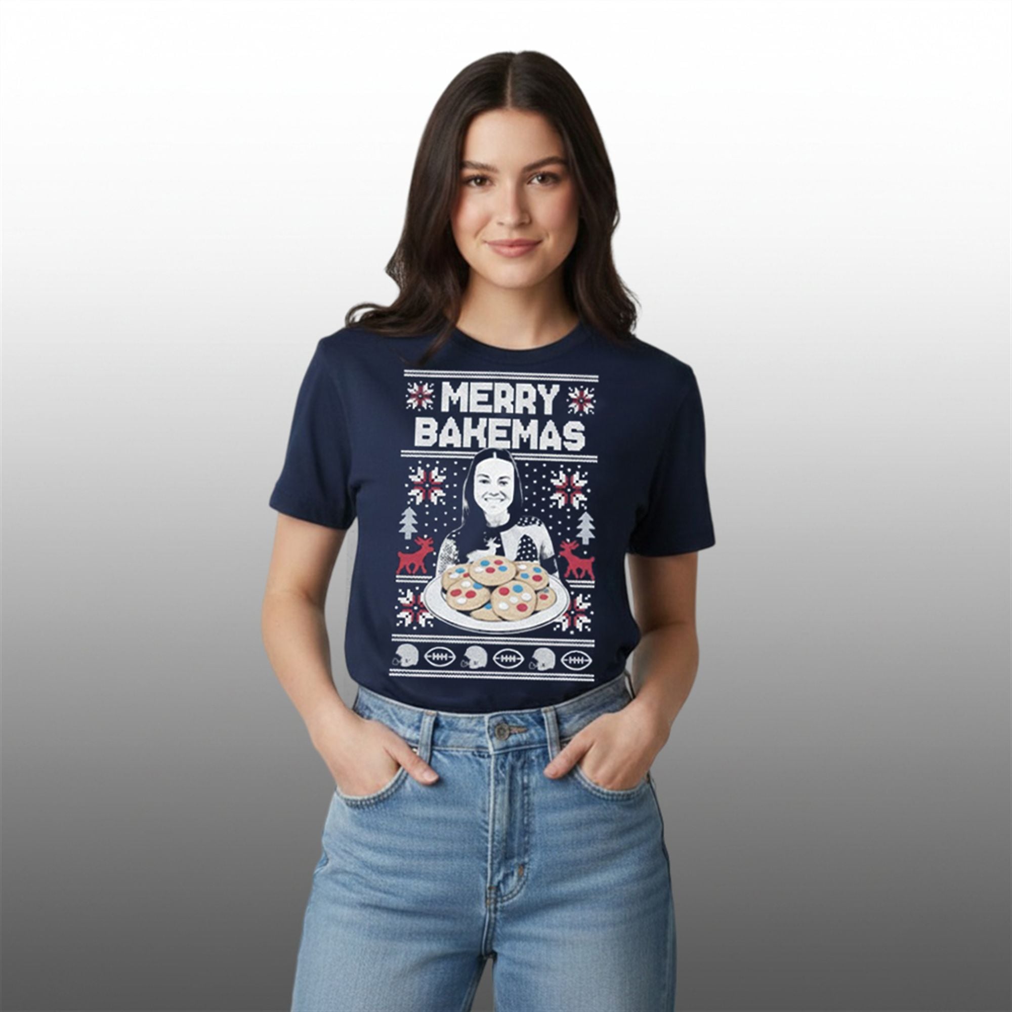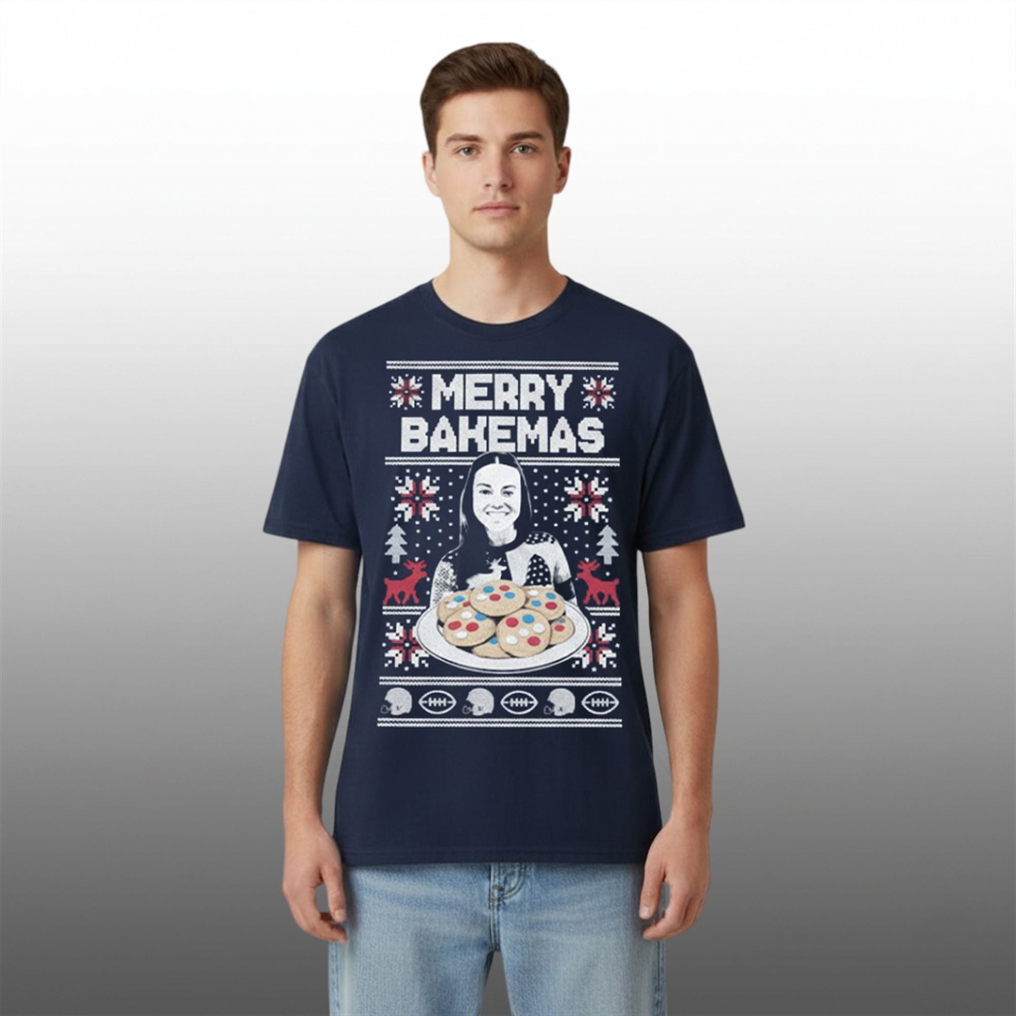 The shirt is more than just apparel; it is a piece of internet history. Designed with a clever faux-stitch aesthetic, the graphic mimics the nostalgic look of a traditional Christmas sweater without the itch or bulk. The centerpiece features a festive “Baker” figure proudly presenting a plate of cookies, flanked by reindeer and snowflakes, with a row of football helmets grounding the design in sports culture. The navy blue backdrop makes the red, white, and cookie-colored details pop, ensuring the text “MERRY BAKEMAS” is visible from across the room. It is the perfect fusion of holiday wholesomeness and competitive sports energy, ideal for fans who want to support their favorite players while keeping things lighthearted.