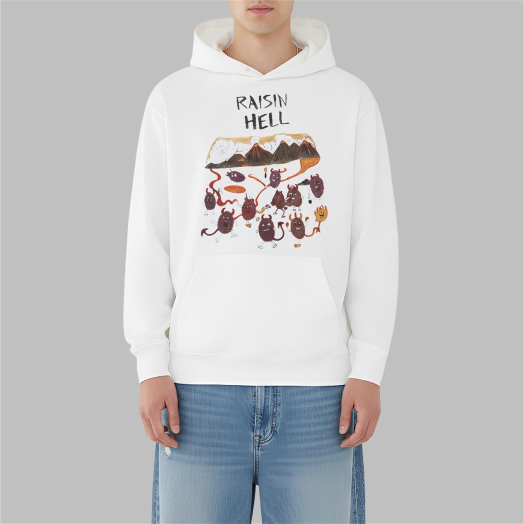 The centerpiece is a brilliant, full-color digital print of the “Raisin Hell” scene. It features a host of mischievous, devil-horned raisins causing a ruckus in a fiery landscape, complete with volcanoes and lava. The text “RAISIN HELL” is displayed above in a stylized, hand-brushed font that adds to the chaotic energy. It perfectly captures the spirit of Portnoy and his millions of followers: a little chaotic, a lot of fun, and completely unapologetic.