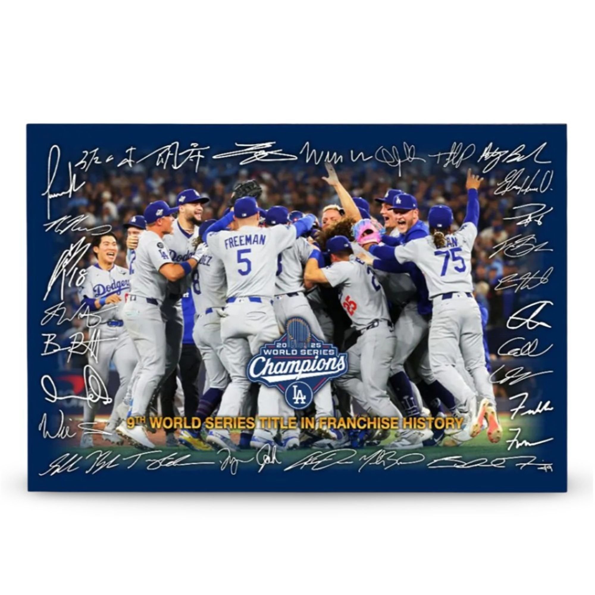 This canvas is designed to be the focal point of any room. The artwork prominently features the entire championship team celebrating their hard-won victory, set against a backdrop of iconic Dodger Blue. Emblazoned across the front are the 2025 World Series Champions logo and the proud declaration: “9th World Series Title In Franchise History.”