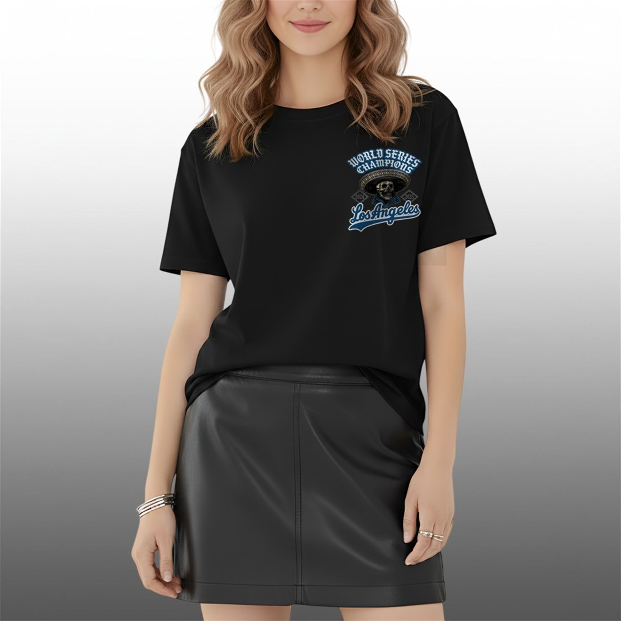 This tee is designed for the fan who wants to stand out. The front keeps it clean and classic, with a stylish left-chest graphic featuring the skull emblem and “World Series Champions Los Angeles” script.